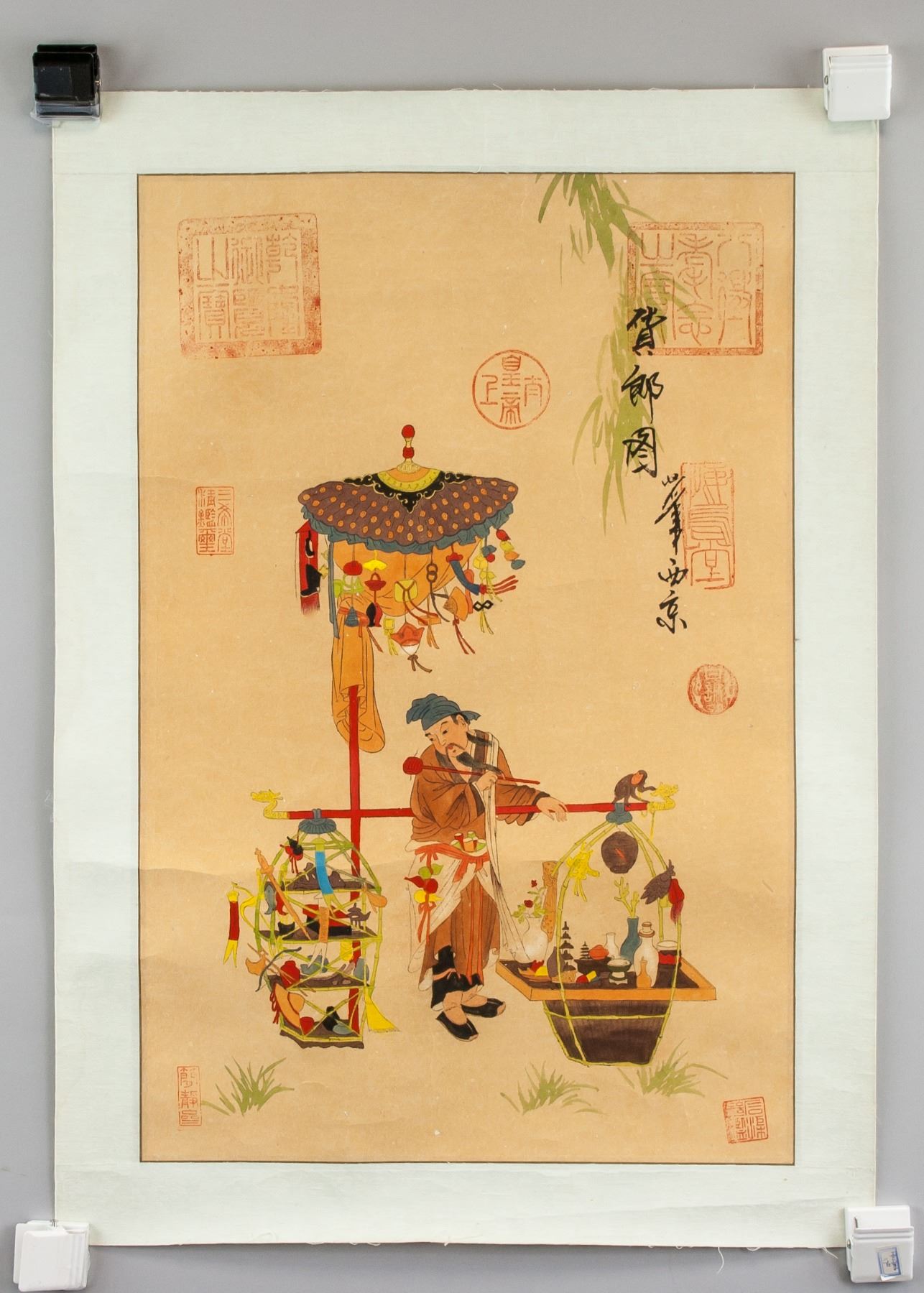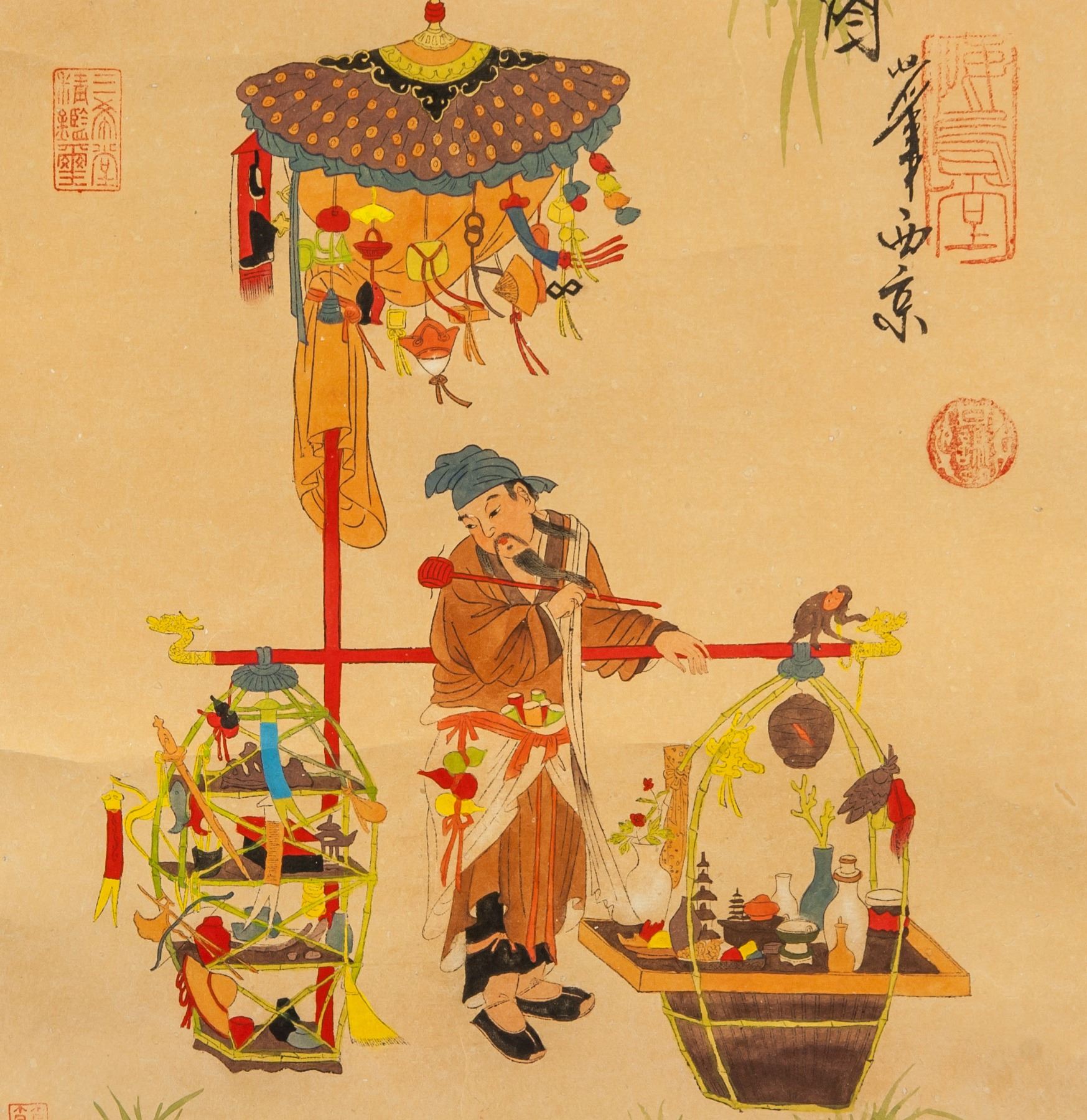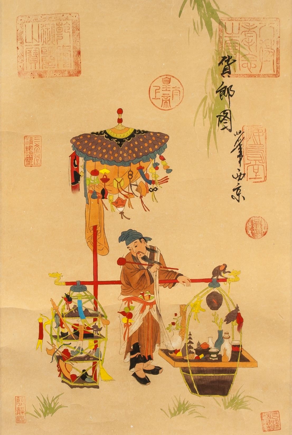 Painting of vender, Chinese ink and watercolor on paper roll, signed by artist, inscribed with 8 collectors' seals, 57 x 38 cm