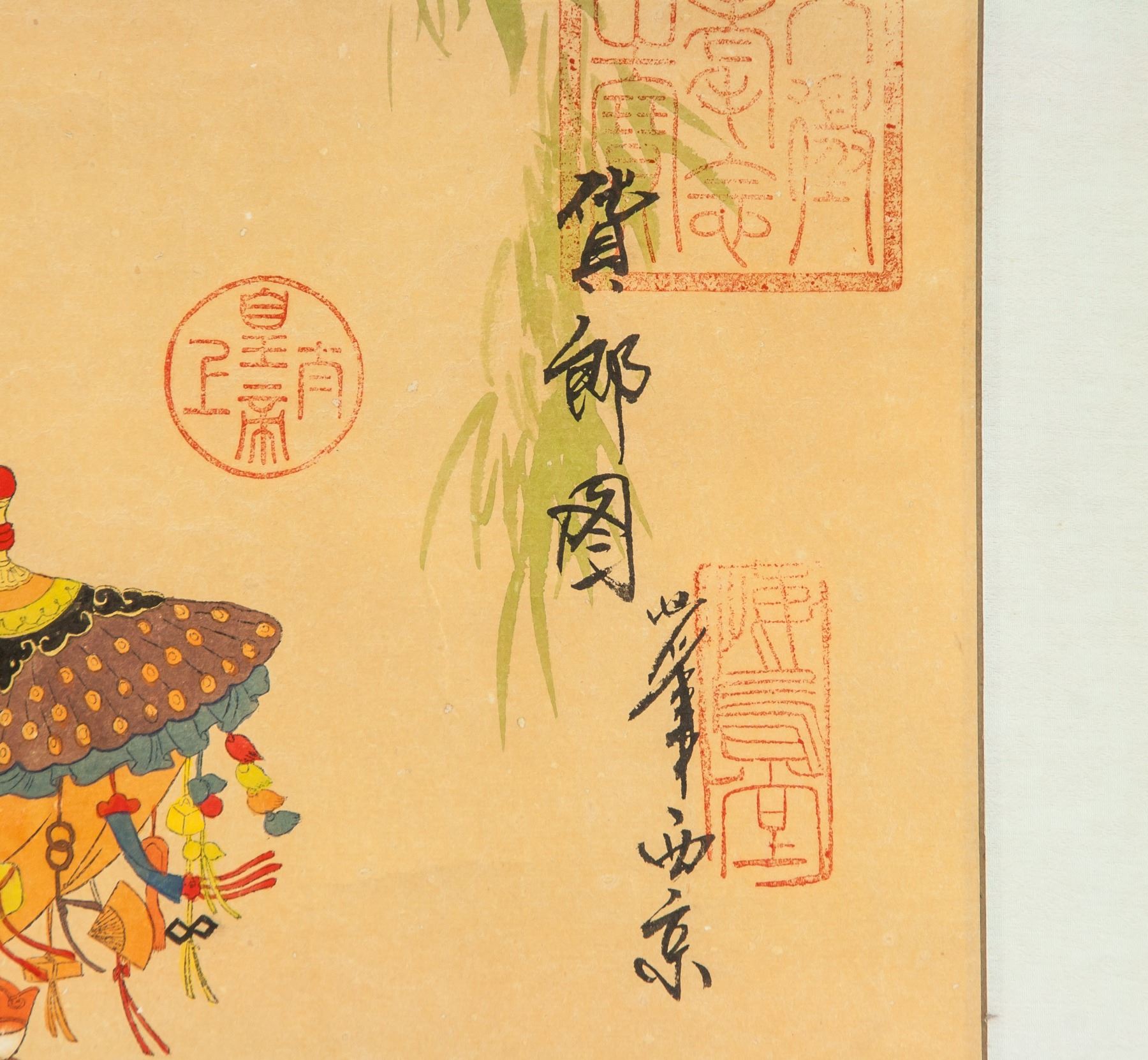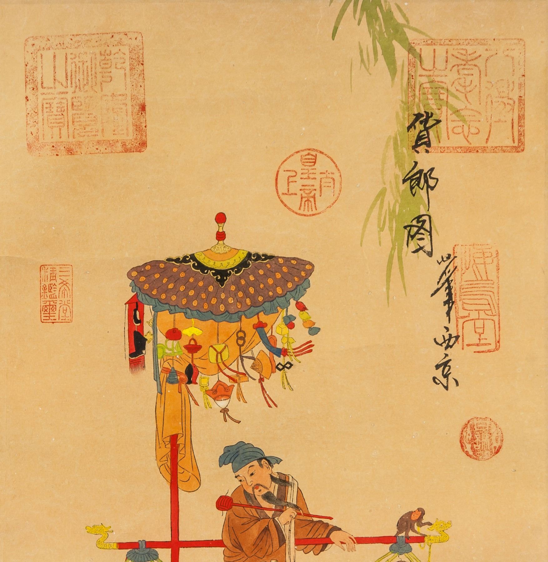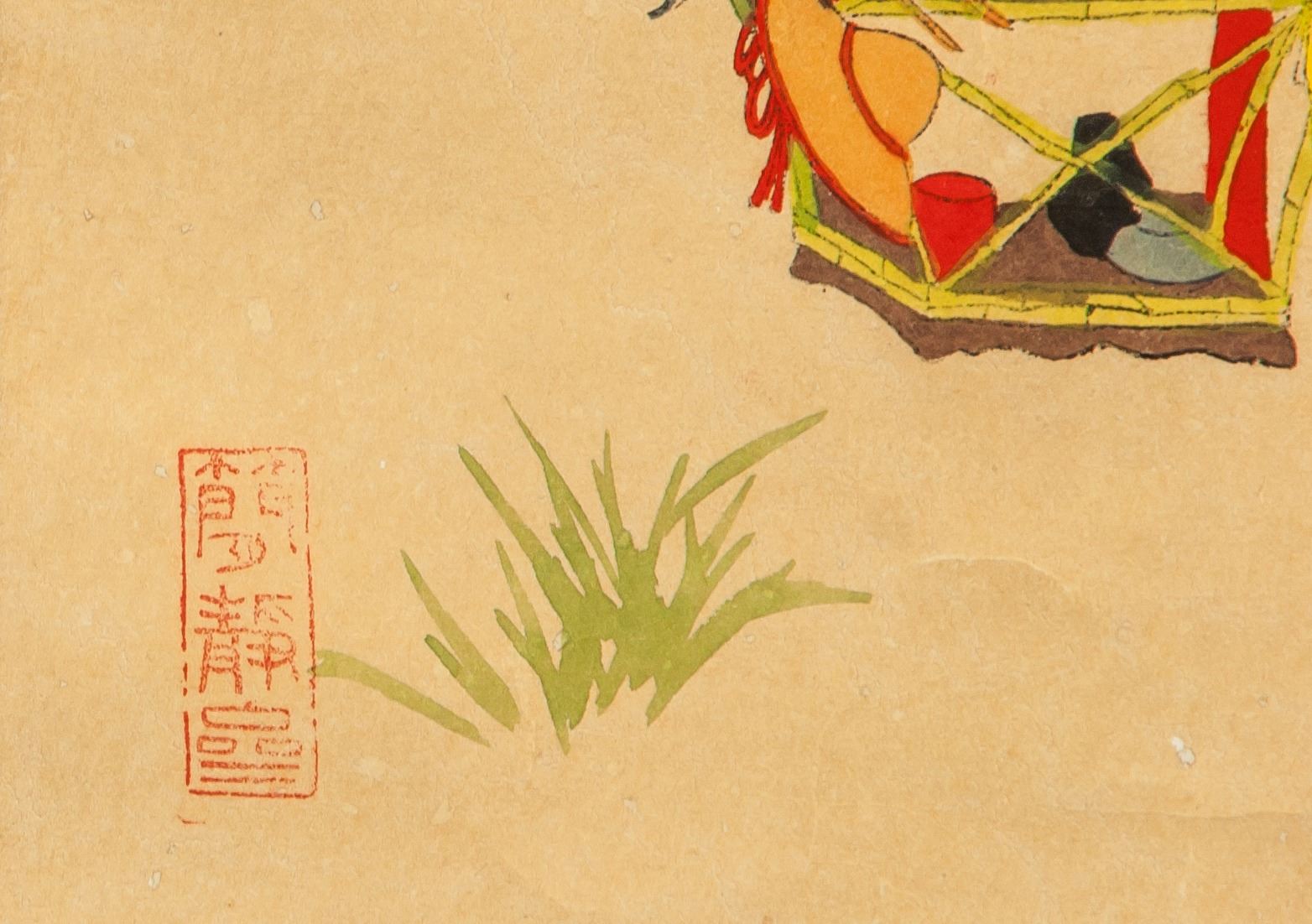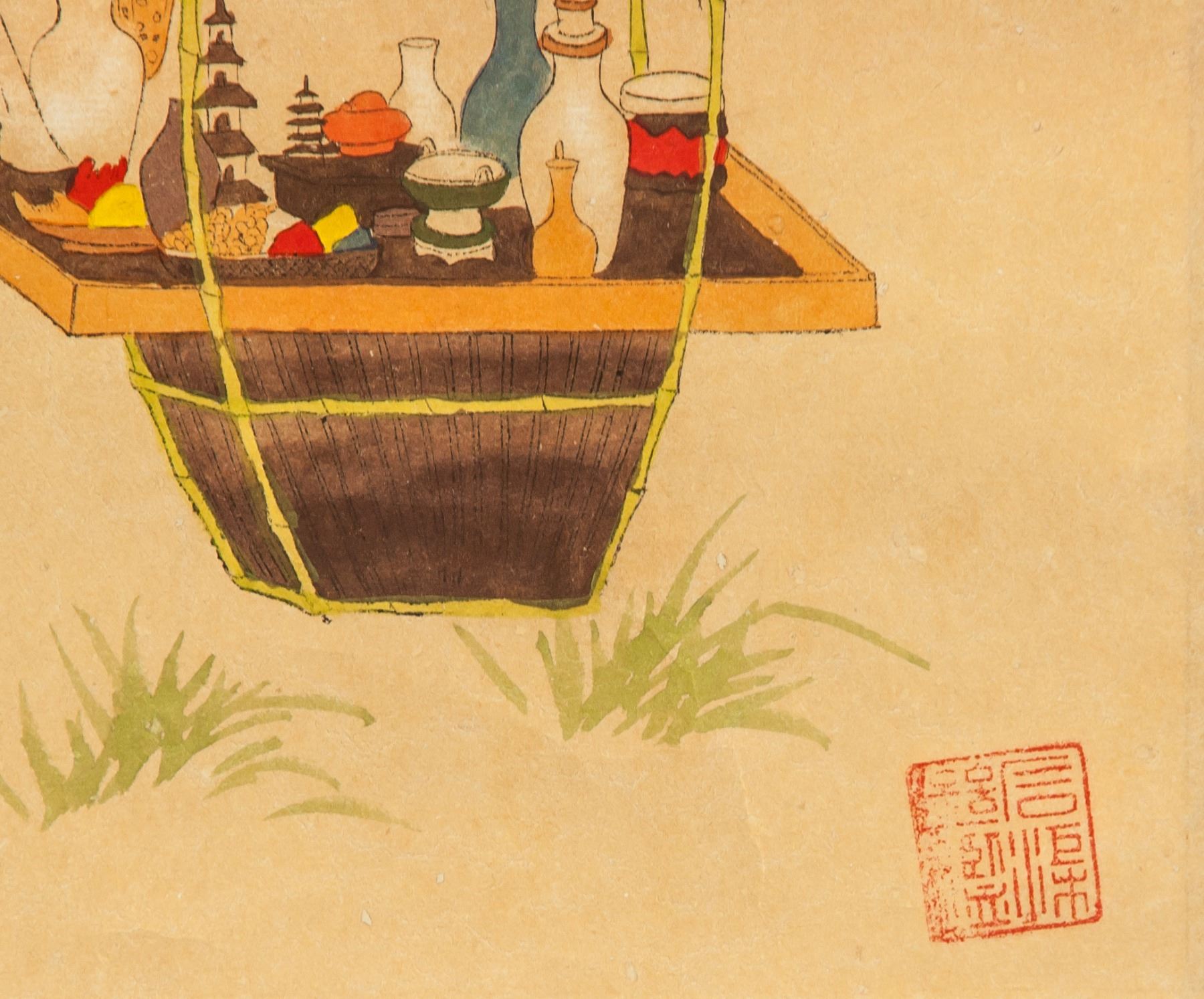 Painting of vender, Chinese ink and watercolor on paper roll, signed by artist, inscribed with 8 collectors' seals, 57 x 38 cm
