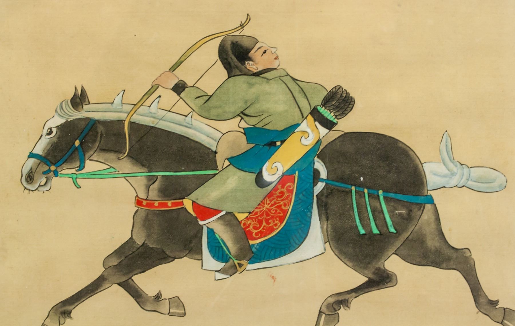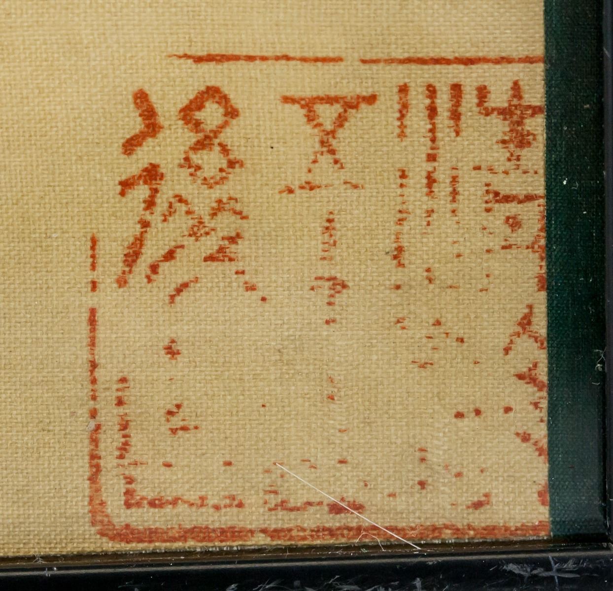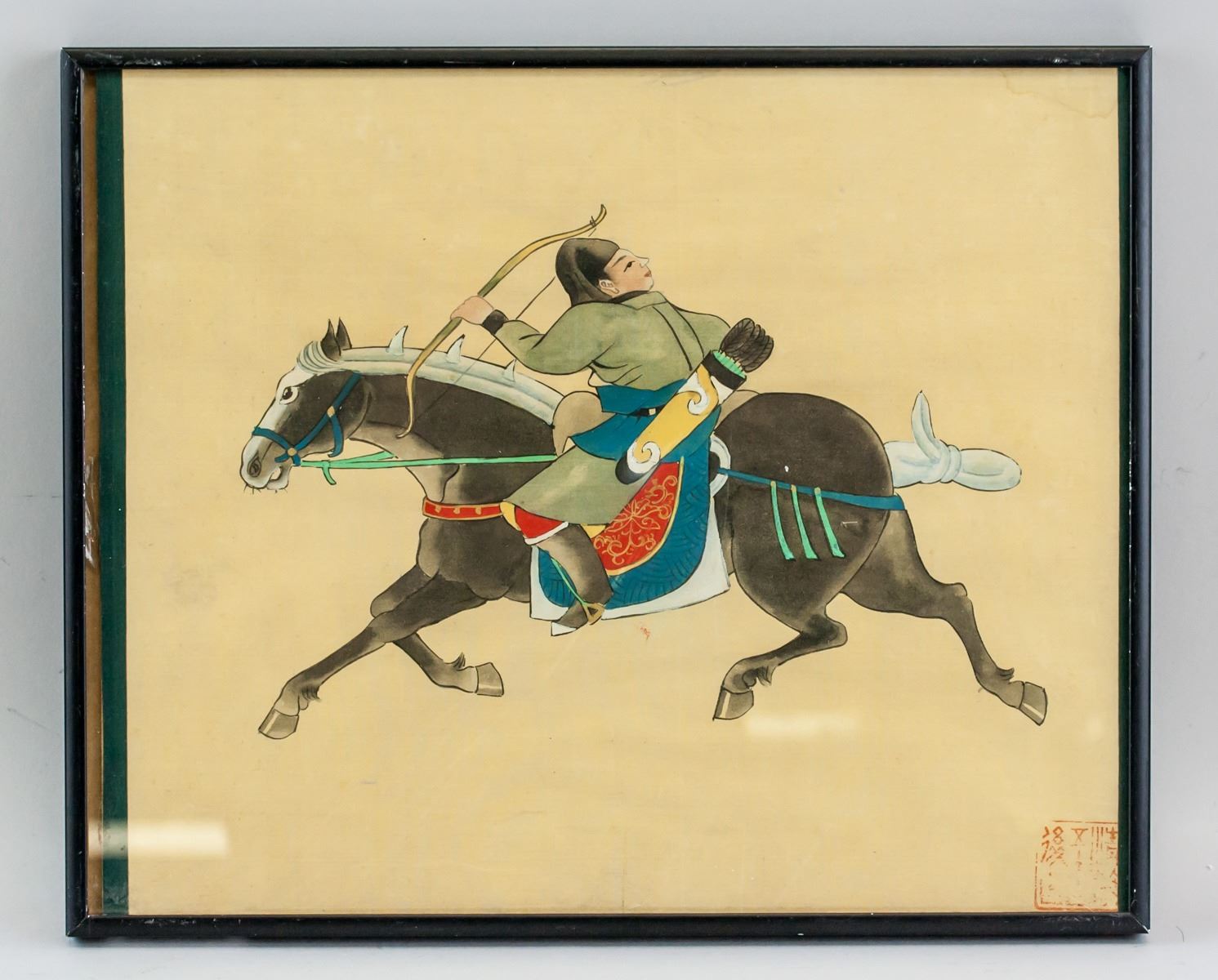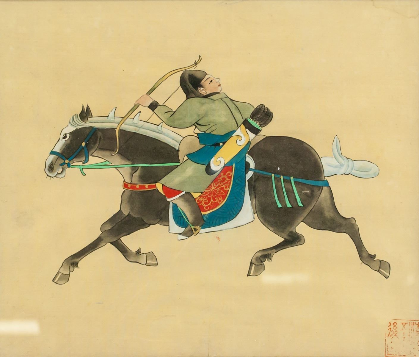Ink and watercolor on canvas, framed. Featuring warrior on horse. Inscribed with 1 seal. 28 x 34 cm, 1079 grams