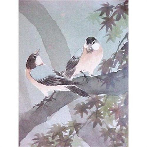 Chinese Watercolor Woodcut, Birds in Tree #979565