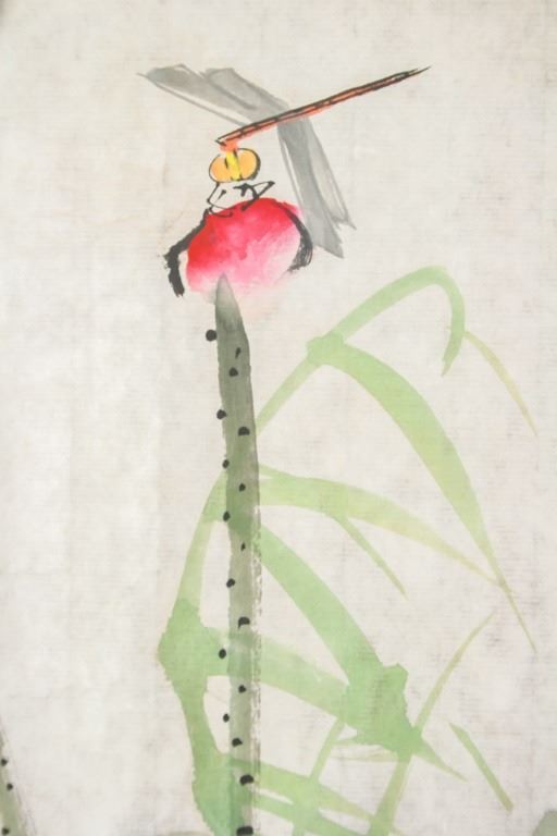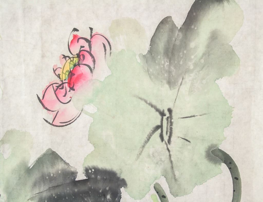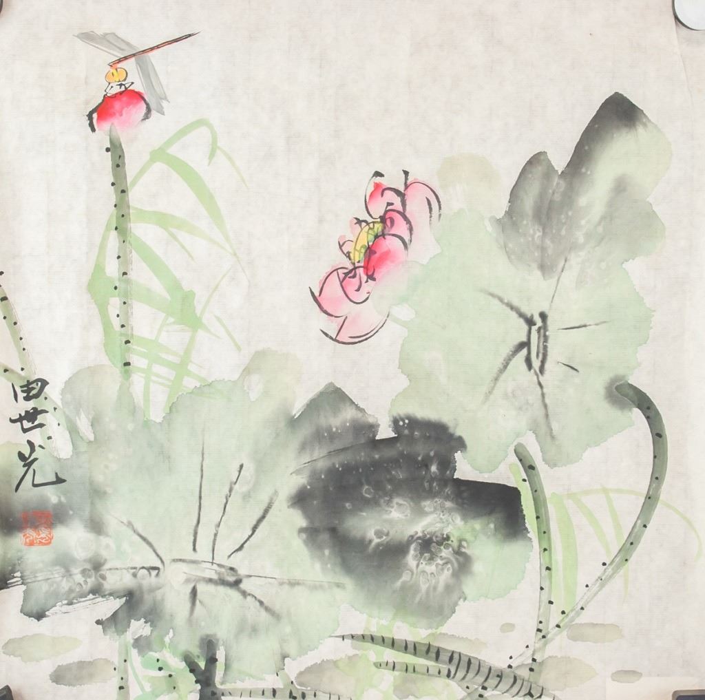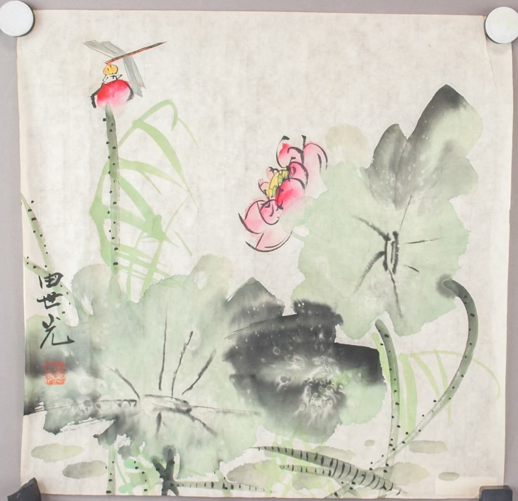 Chinese watercolor on paper. Featuring lotus flowers. Signed to the bottom left, inscribed with seal. 34 x 34 cm.