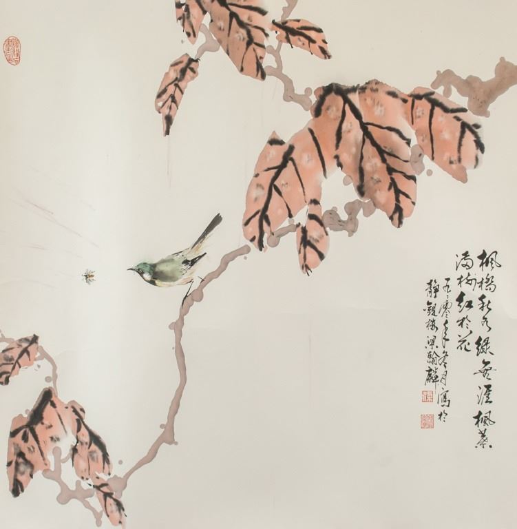 Chinese watercolor on paper. Featuring a gird perched on a branch watching a bee. Signed and inscribed with three seals. 79 x 79 cm.