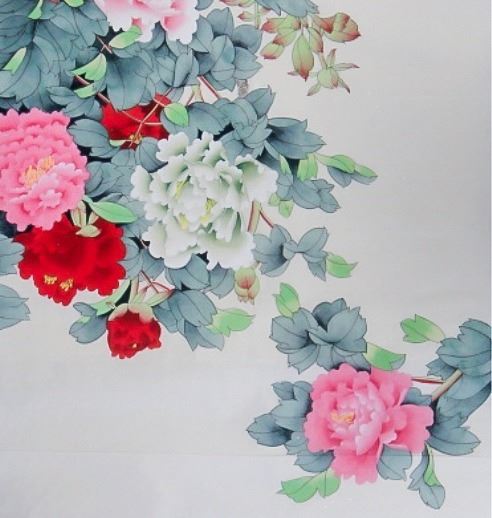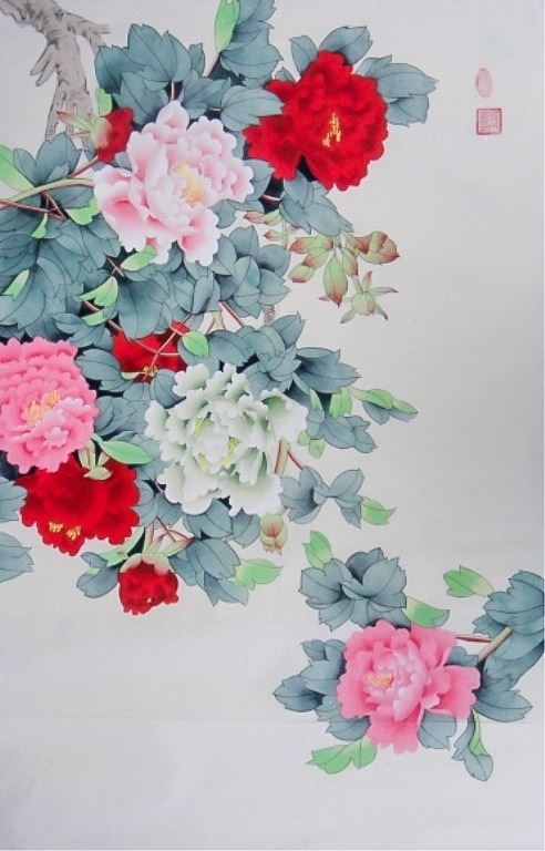 Chinese ink and watercolor on paper, featuring peony Flowers. Inscribed with two artist seals. 36 x 21.5 inches.
