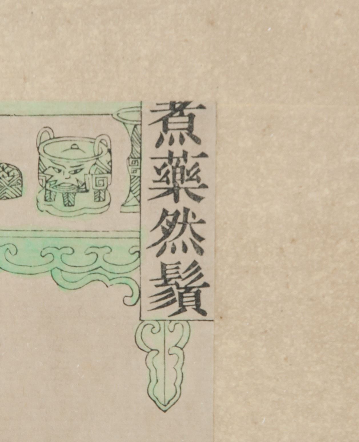 Watercolor and ink on paper, framed, featuring a man burning his beard to boil the medicine, with four letters Zhu Yao Ran Xu, 23 x 15.5 cm