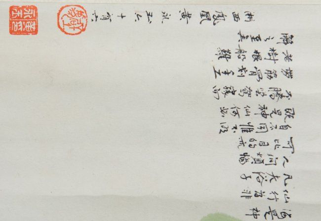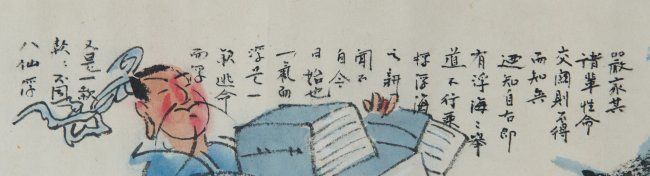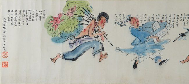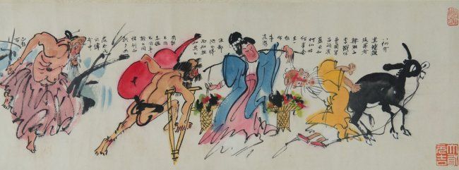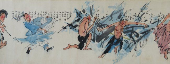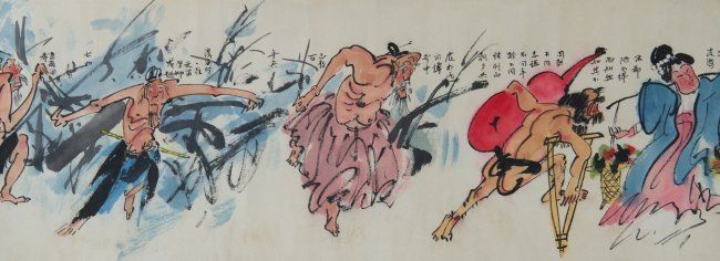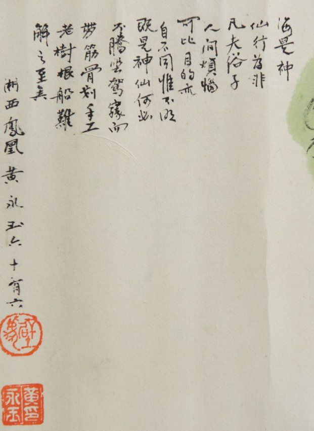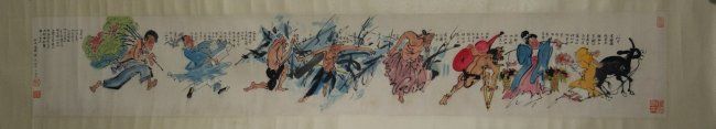 Immortals, Chinese ink and watercolour on paper; signed Huang Yong Yu (1924- )inscribed with two artist seals; 148 cm x 24 cm