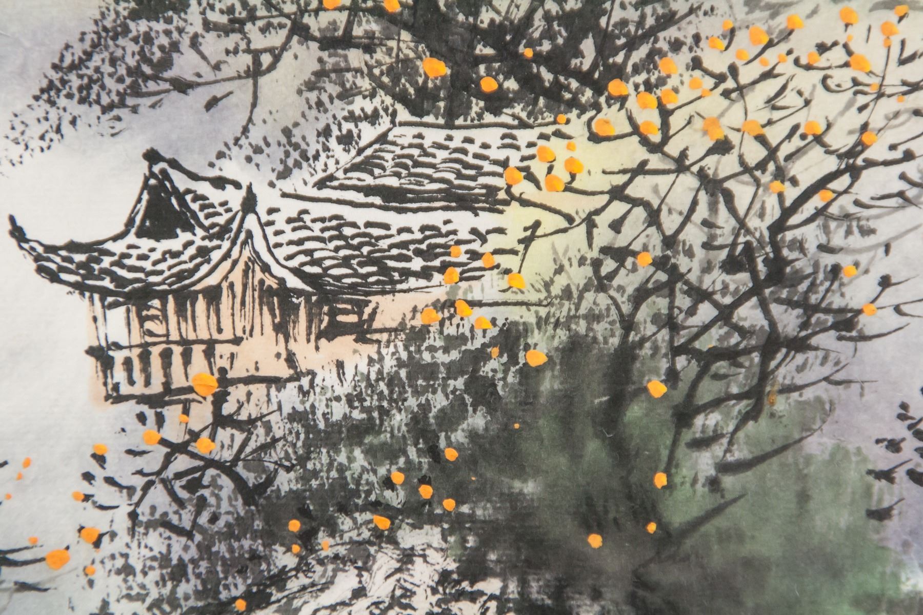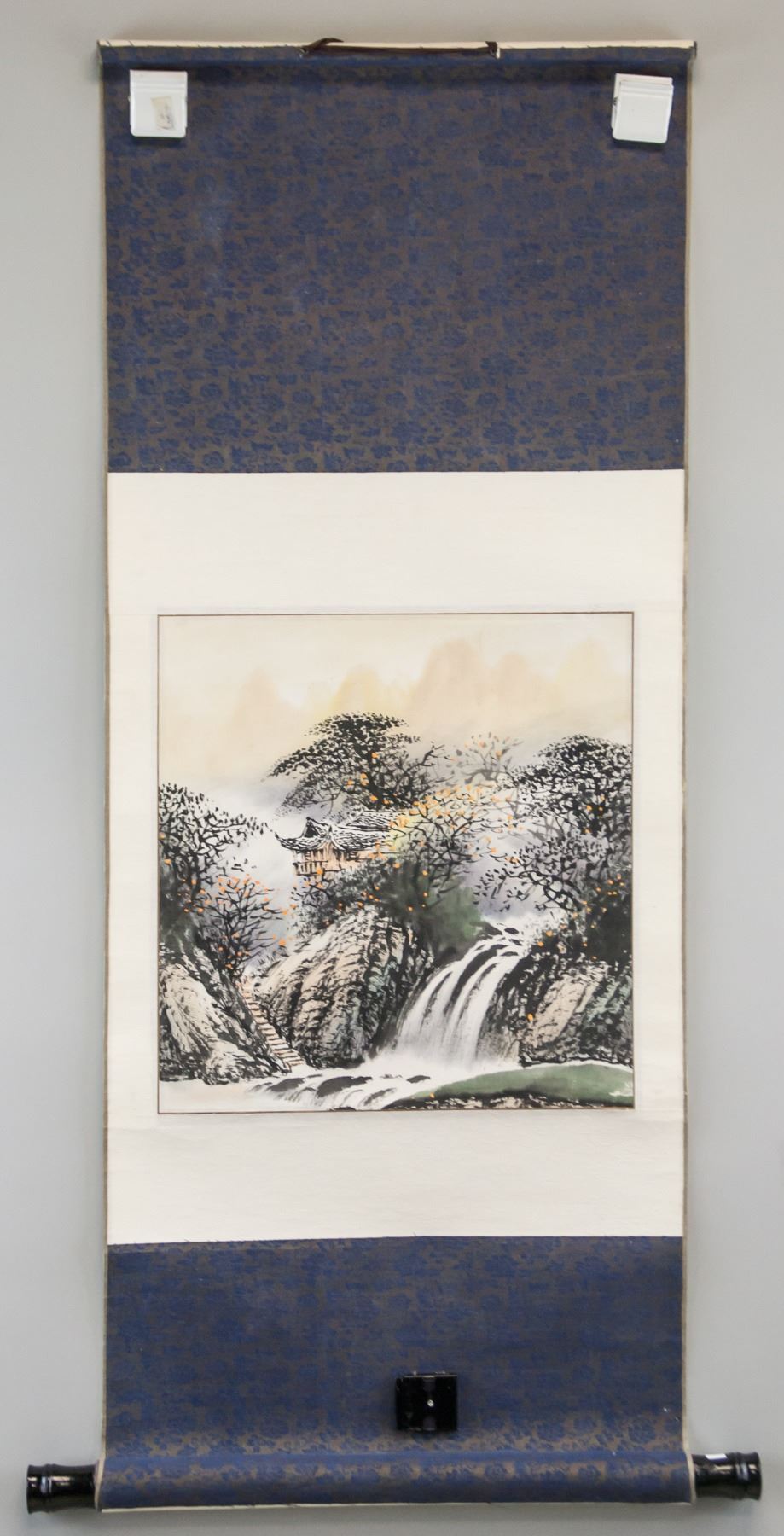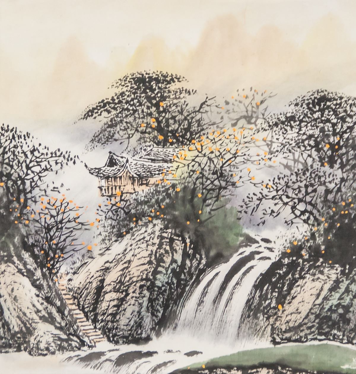Chinese ink and watercolor on paper. Featuring landscape scene with small house nestled among rocks and trees with a small waterfall on the right. 33 x 32 cm.