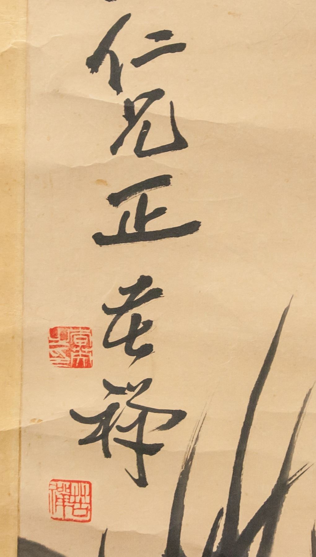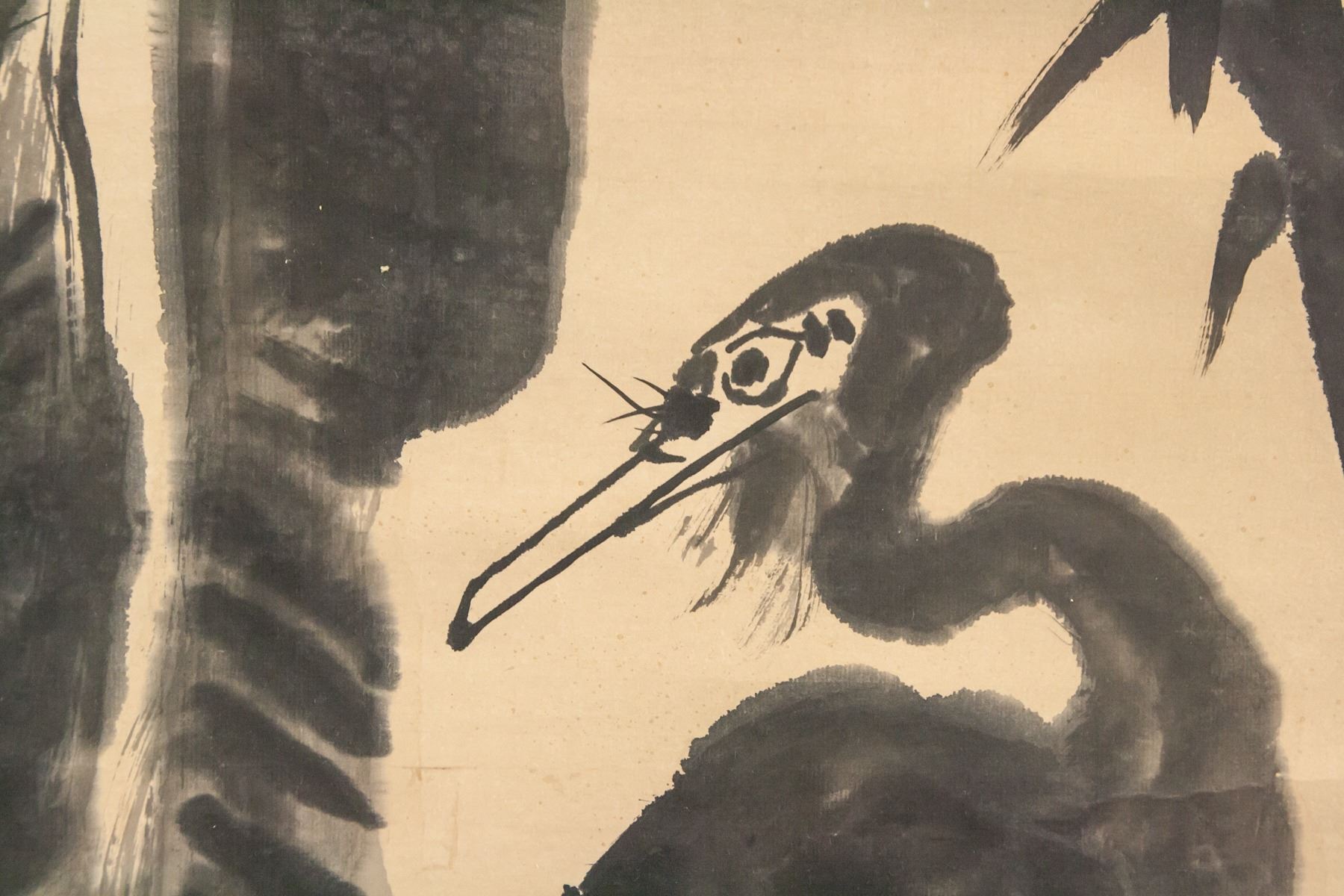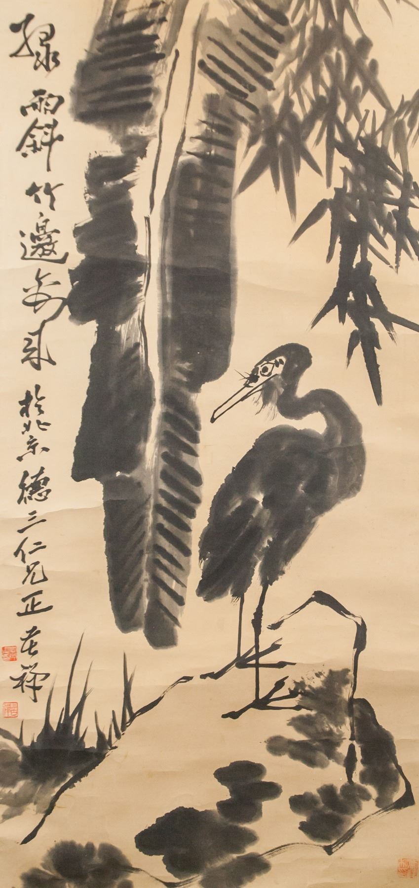 Chinese ink and watercolor on paper. Featuring stork on rocks. Signed and inscribed with three seals. 132 x 63 cm.