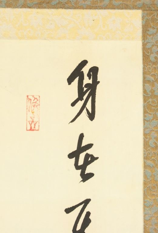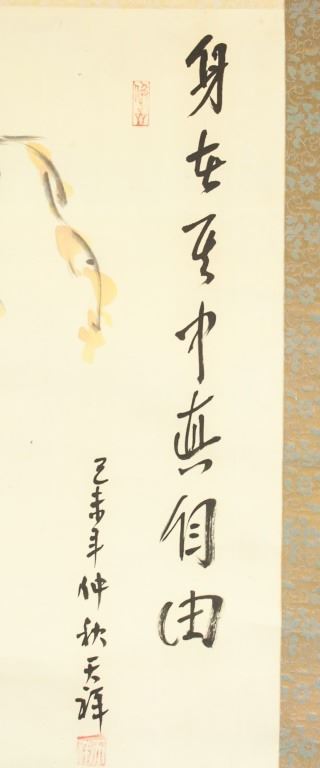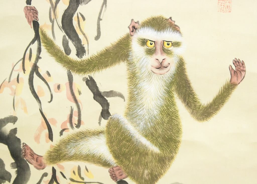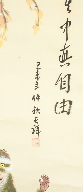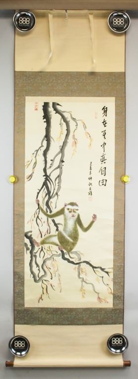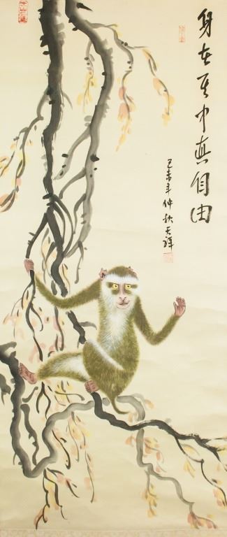 Chinese watercolor on paper. Featuring a monkey handing onto the branches of a tree. Inscribed with calligraphy. Inscribed with three seals. 102 x 42 cm.