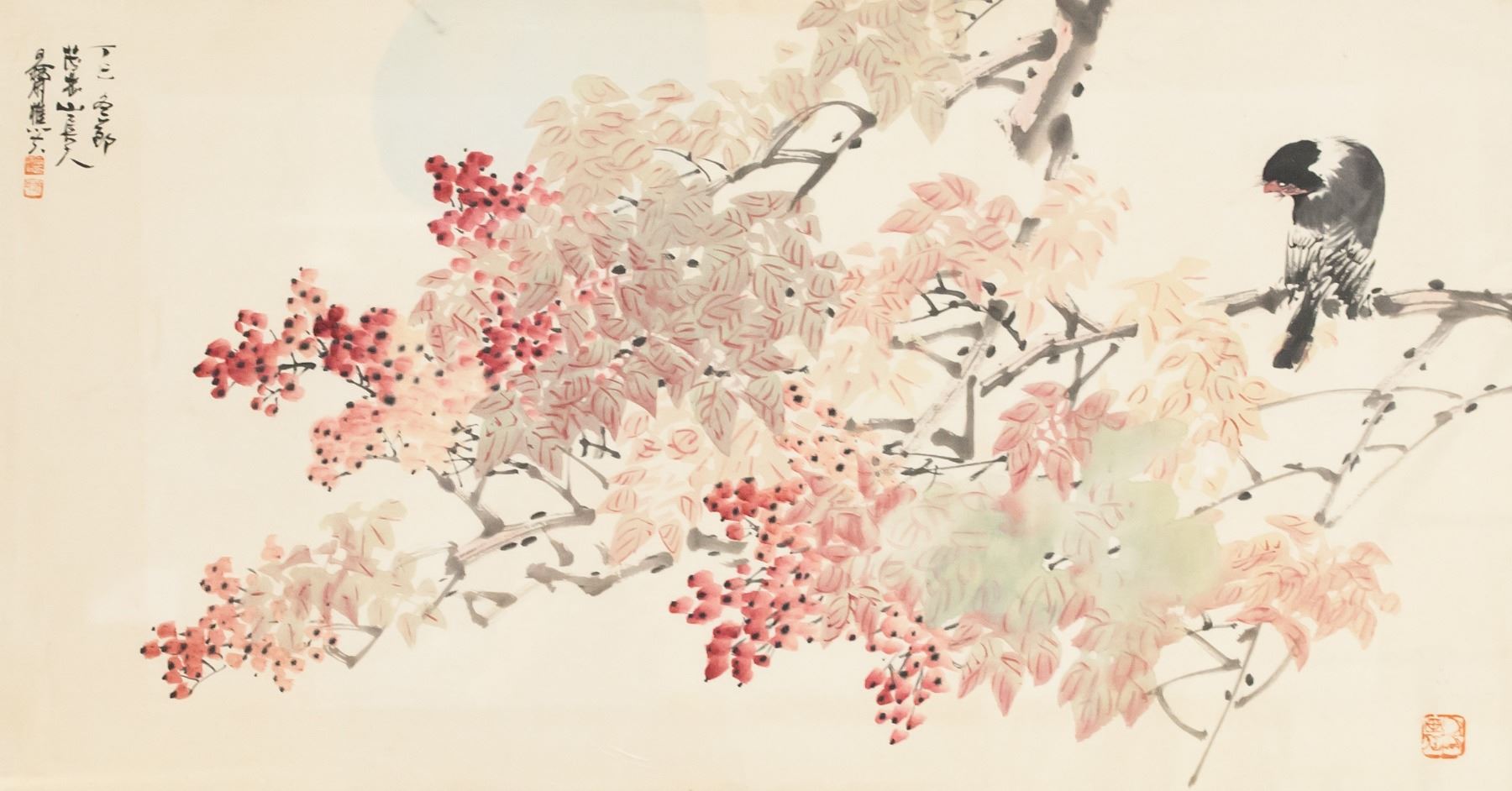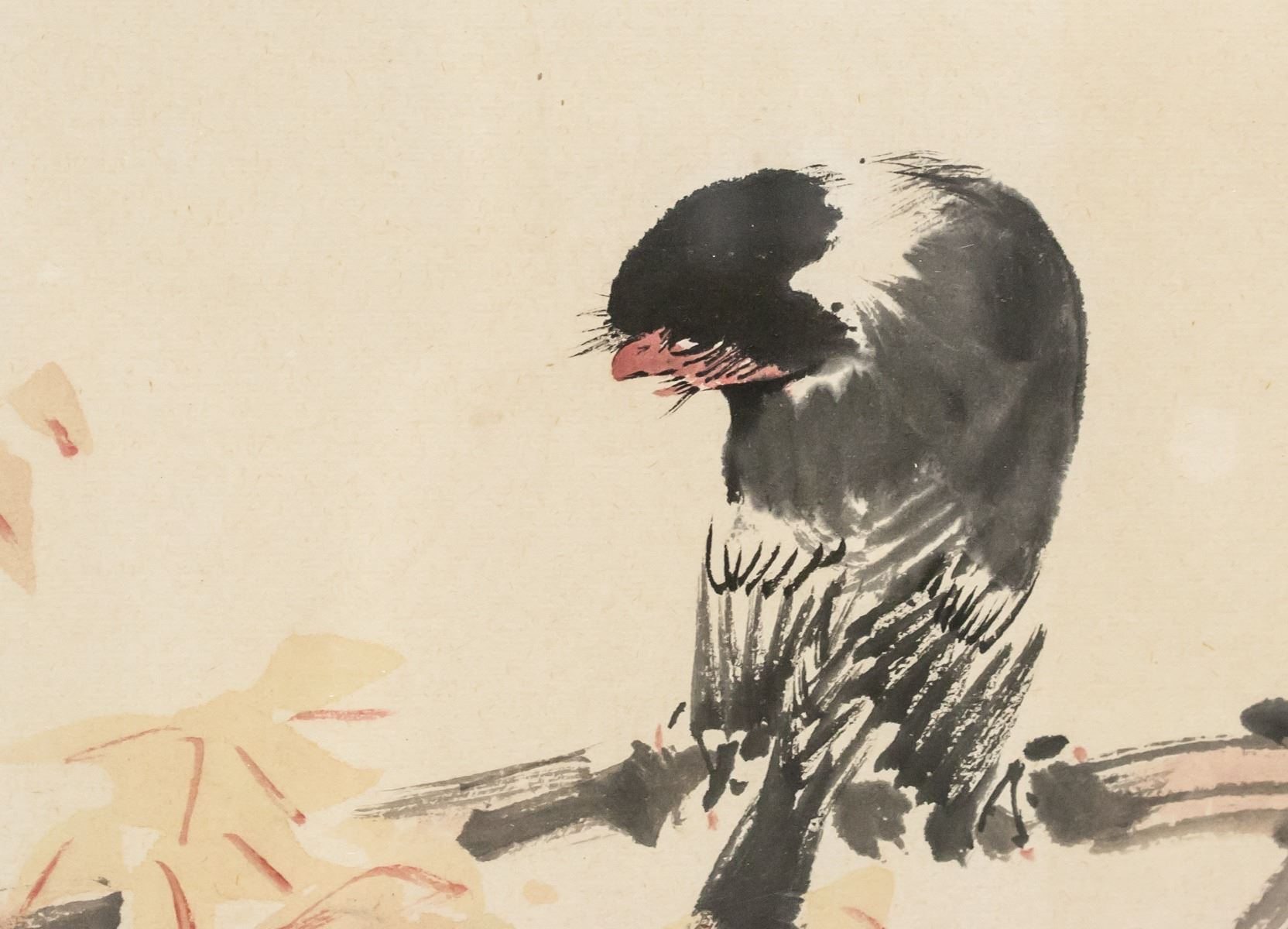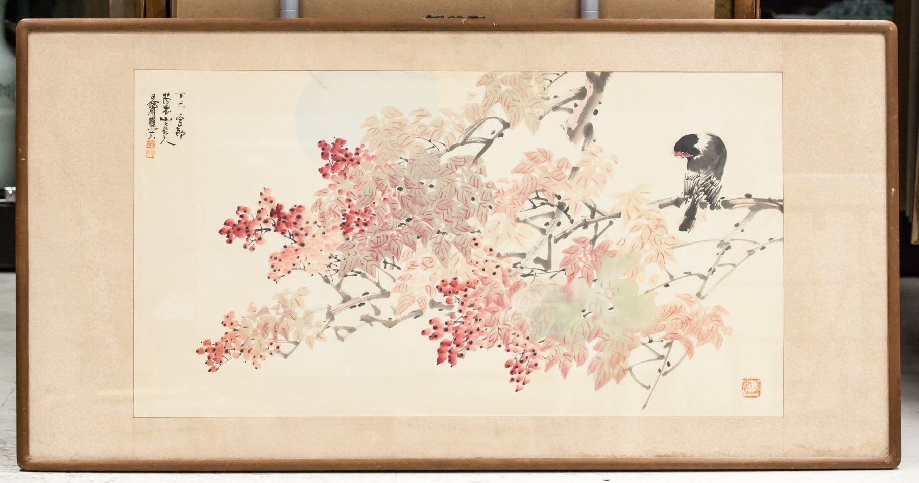 Watercolor on paper, framed. Featuring bird perched on branch. Inscribed with three seals. Sticker on verso reads :APPROVED FOR EXPORT CULTURAL PROPERTY MAINTENCE OFFICE". 49 x 90 cm (19.5 x 35.5 in), Frame: 64 x 124 cm (25 x 48.5 in)
