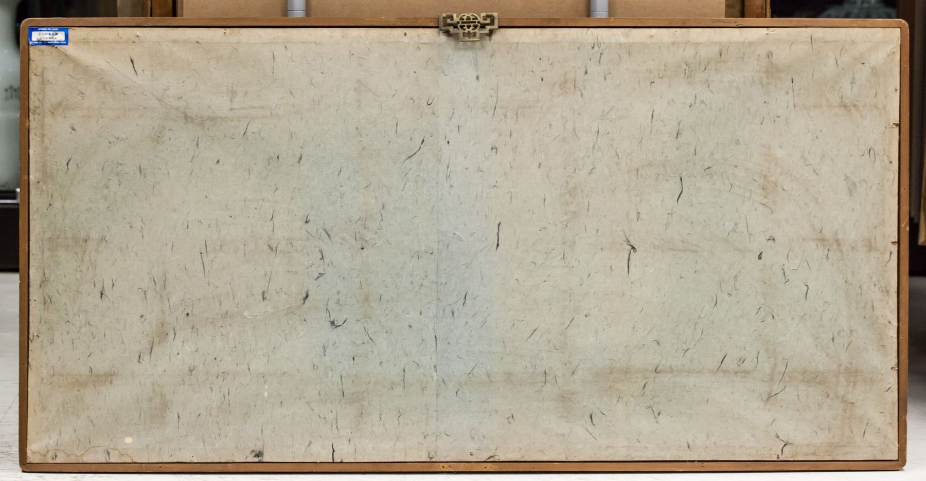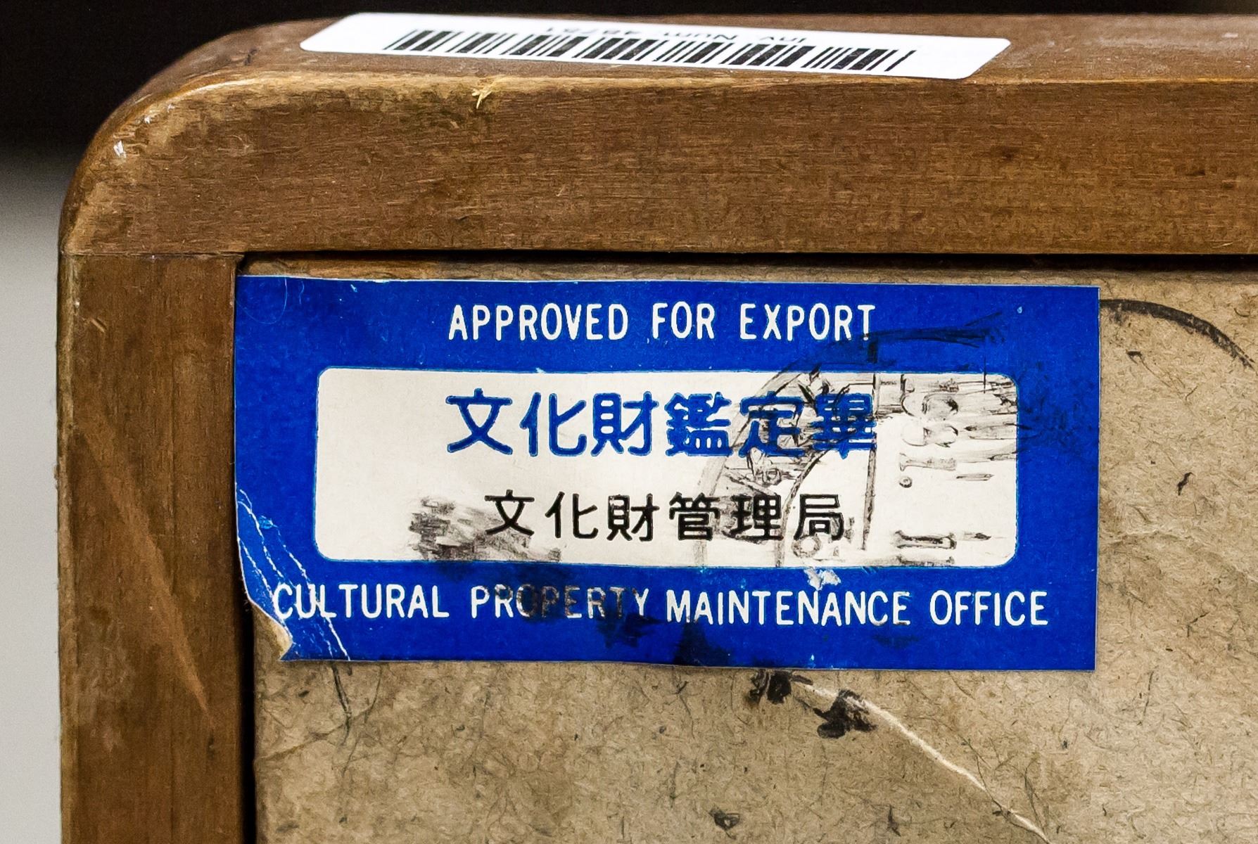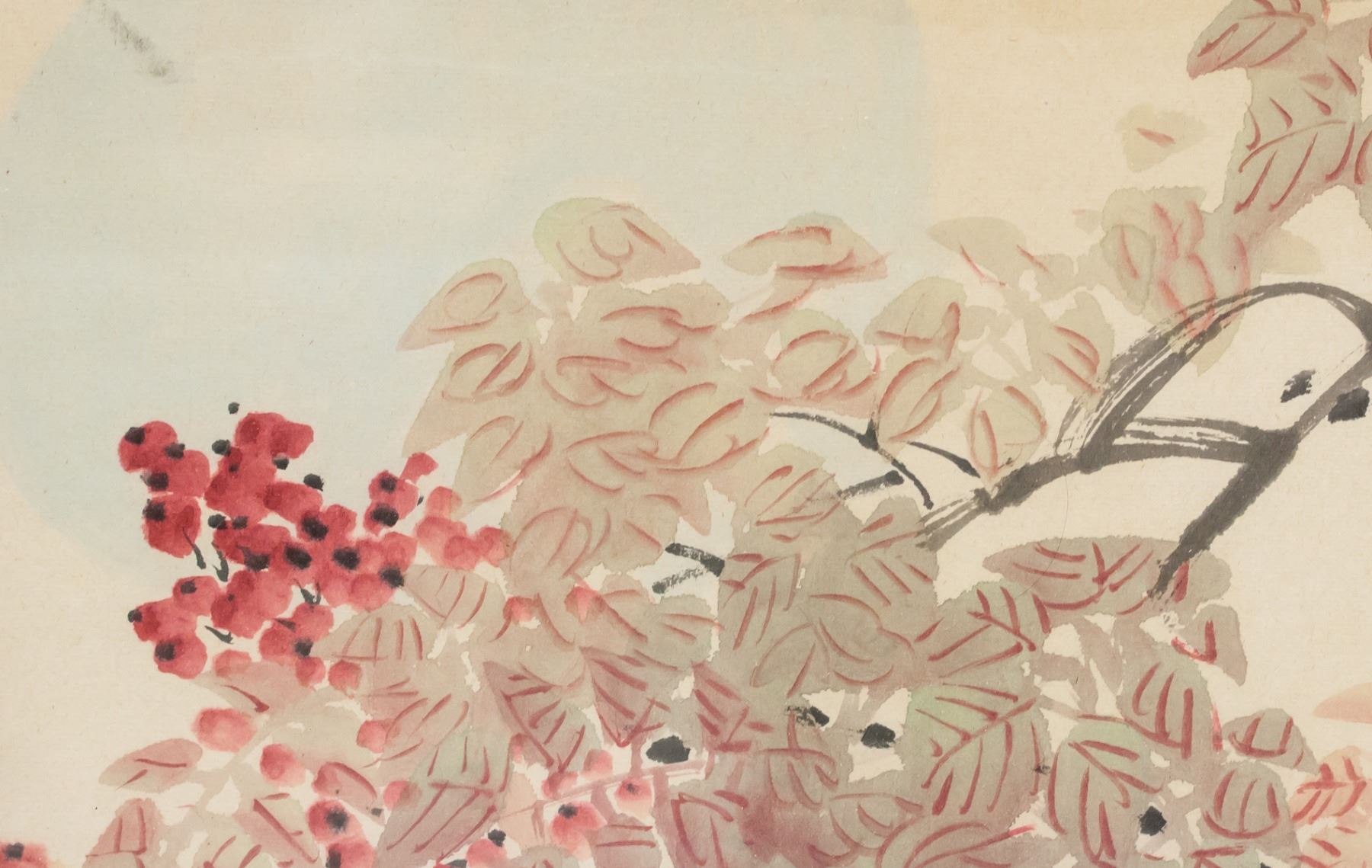 Watercolor on paper, framed. Featuring bird perched on branch. Inscribed with three seals. Sticker on verso reads :APPROVED FOR EXPORT CULTURAL PROPERTY MAINTENCE OFFICE". 49 x 90 cm (19.5 x 35.5 in), Frame: 64 x 124 cm (25 x 48.5 in)