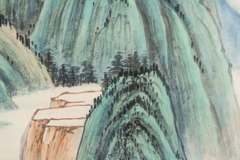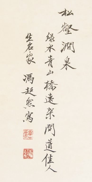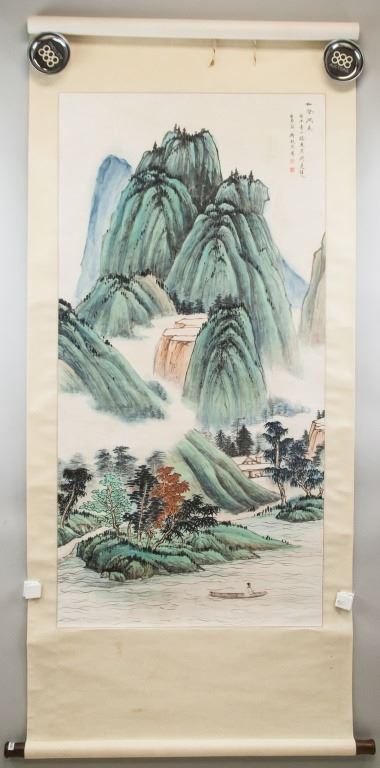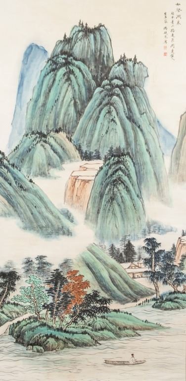 Chinese ink and watercolor on paper. Featuring mountain landscape with a figure in a small boat on the water in front. Signed "Feng Chaoran" to the top right. Inscribed with two seals. 135 x 66 cm.