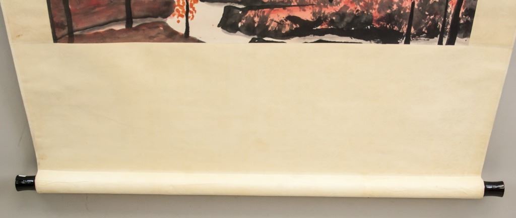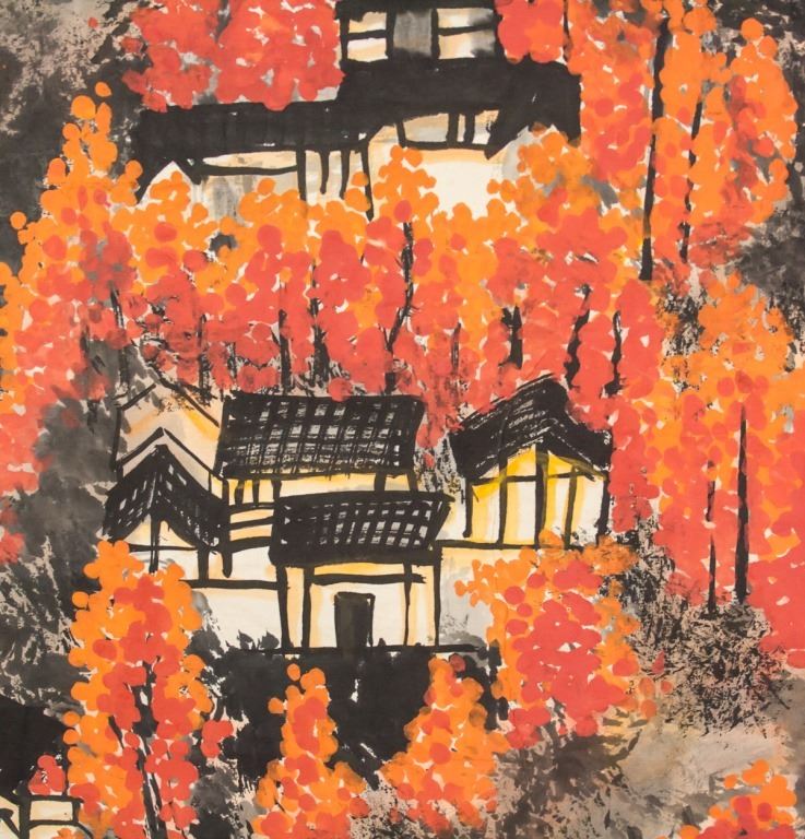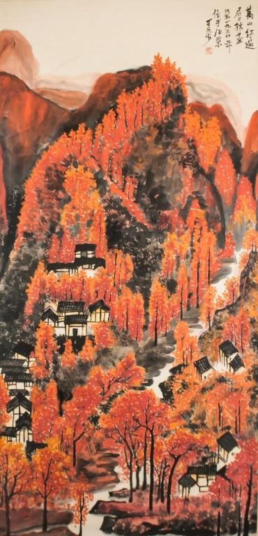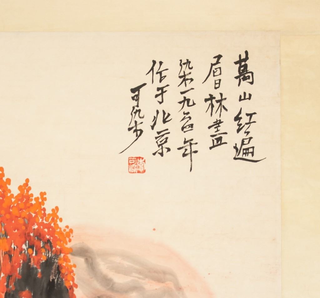 Chinese watercolor on paper. Featuring vivid autumn Beijing landscape. Signed "Keran" to the top left. Inscribed with one artist seal. 134 x 67 cm.