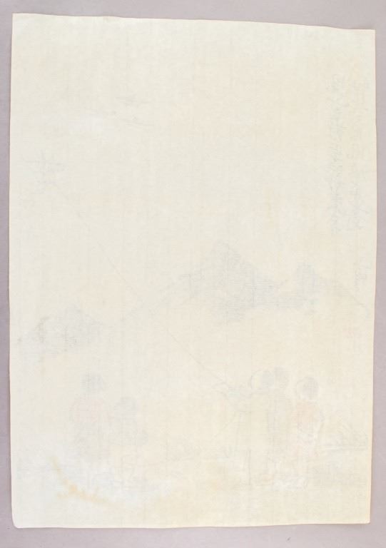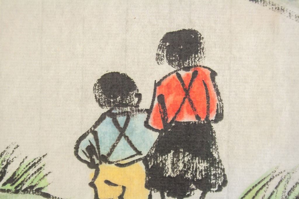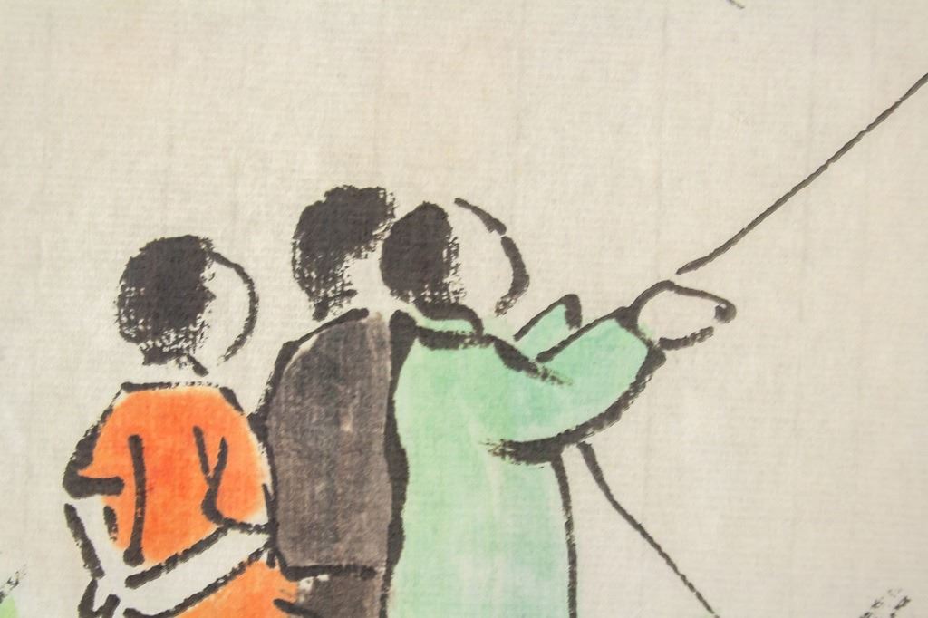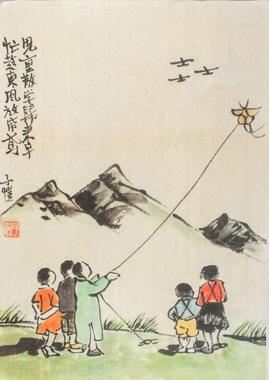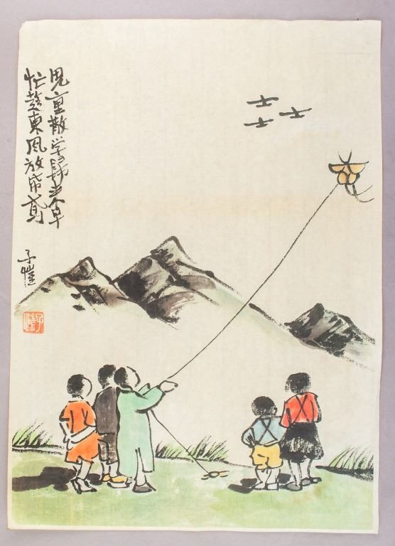 Chinese watercolor on paper. Featuring children flying kites. Signed "Zikai" to the left. Inscribed with one artist seal. 34 x 24 cm.