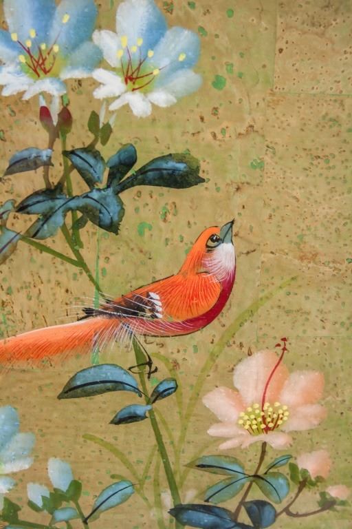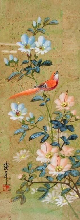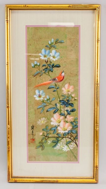 Chinese watercolor on paper, framed. Featuring a red-feathered bird perched on a plant with pink and blue flowers. Signed and inscribed with one seal. Paper size: 48 x 19 cm (19 x 7.5 inches). Frame size: 64 x 33 cm (25 x 13 inches).