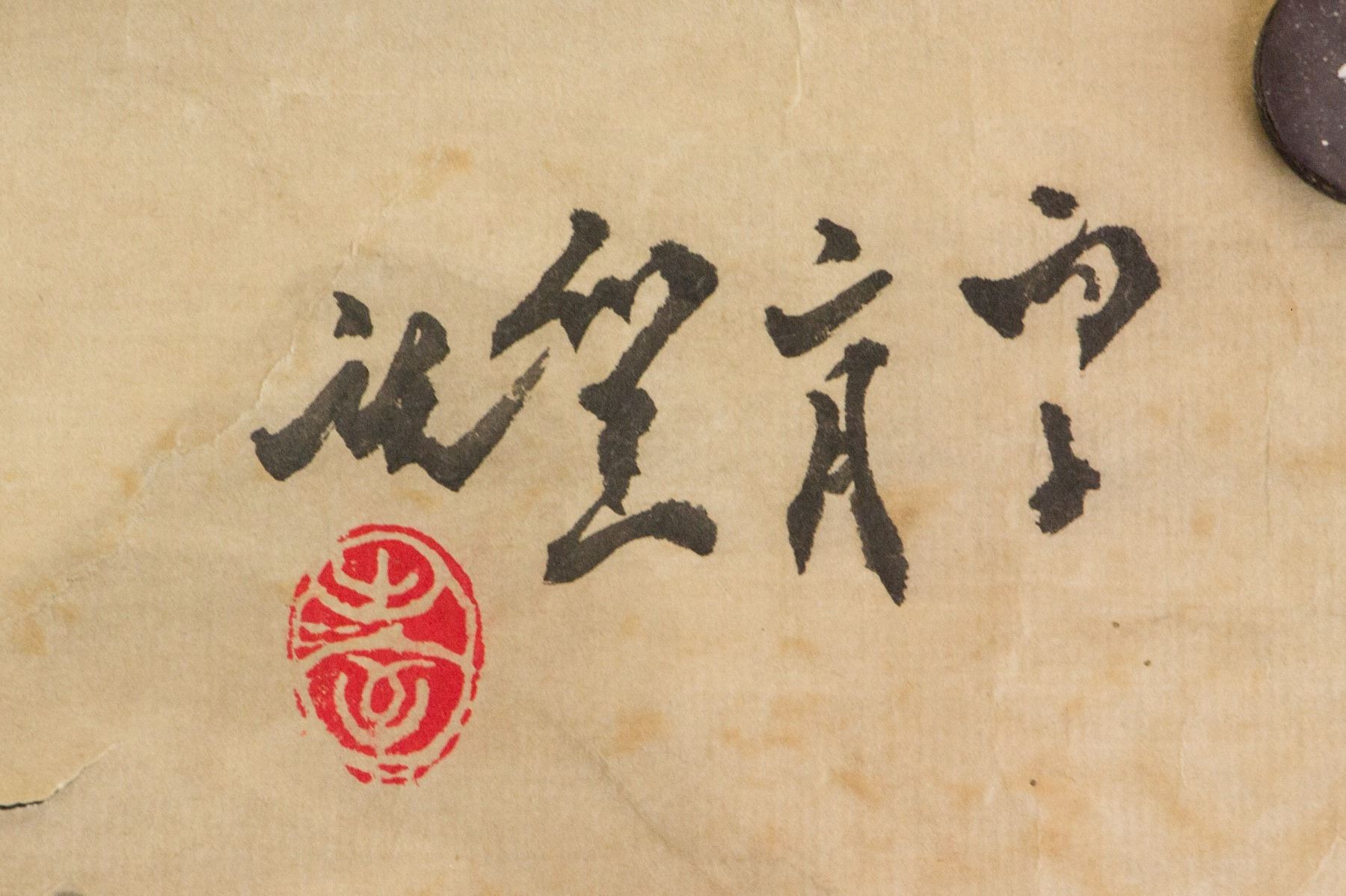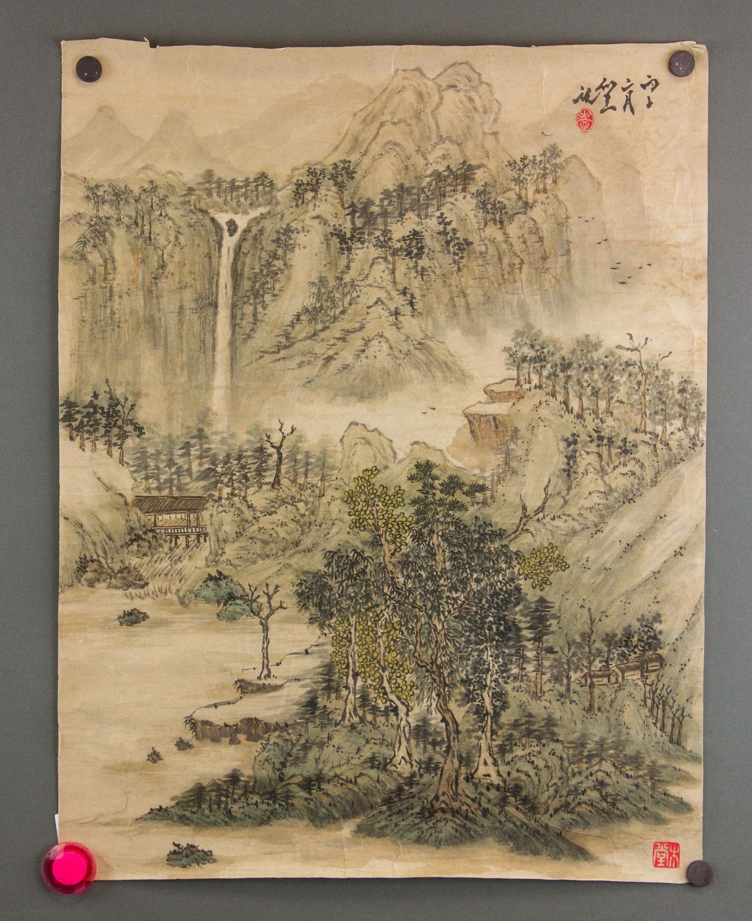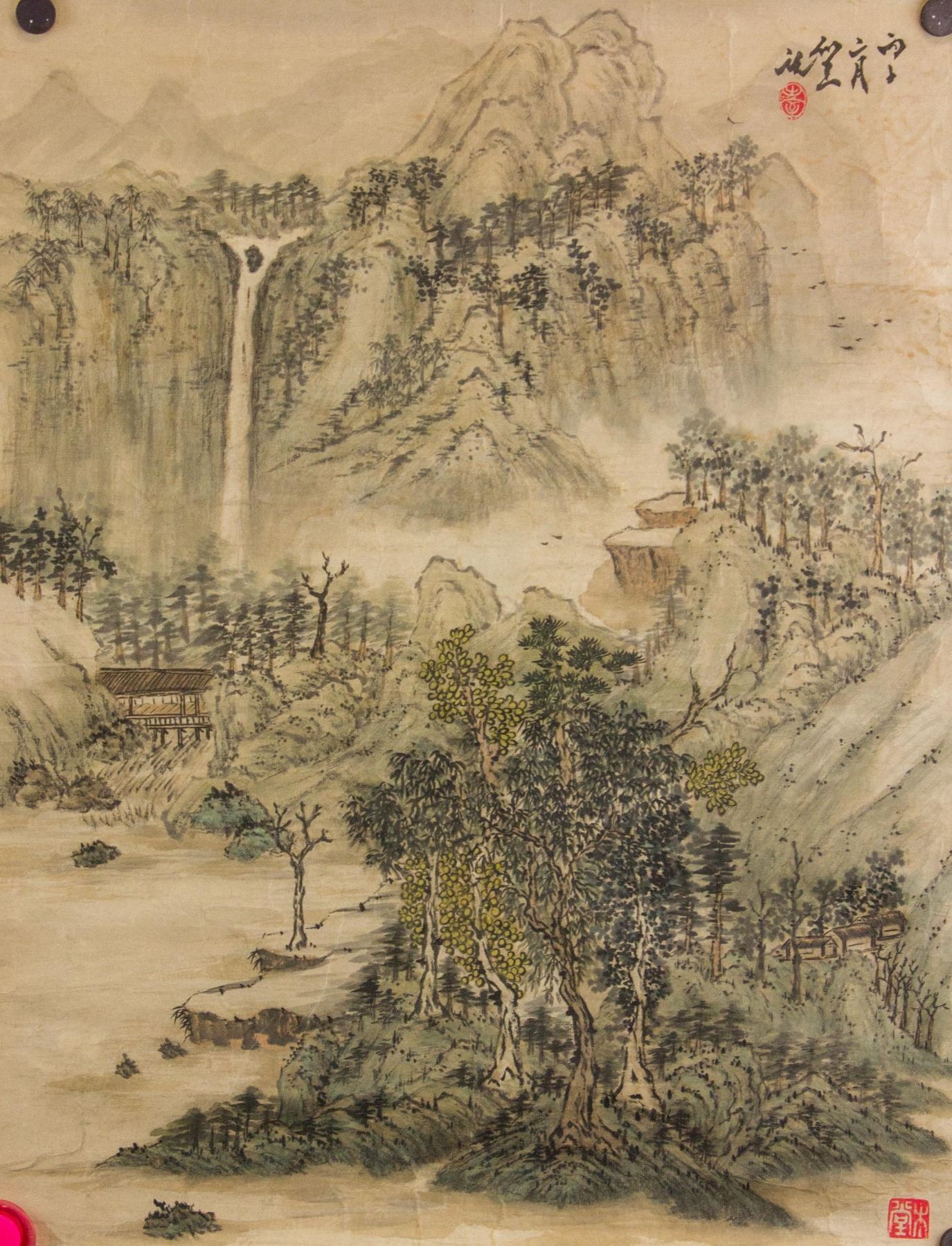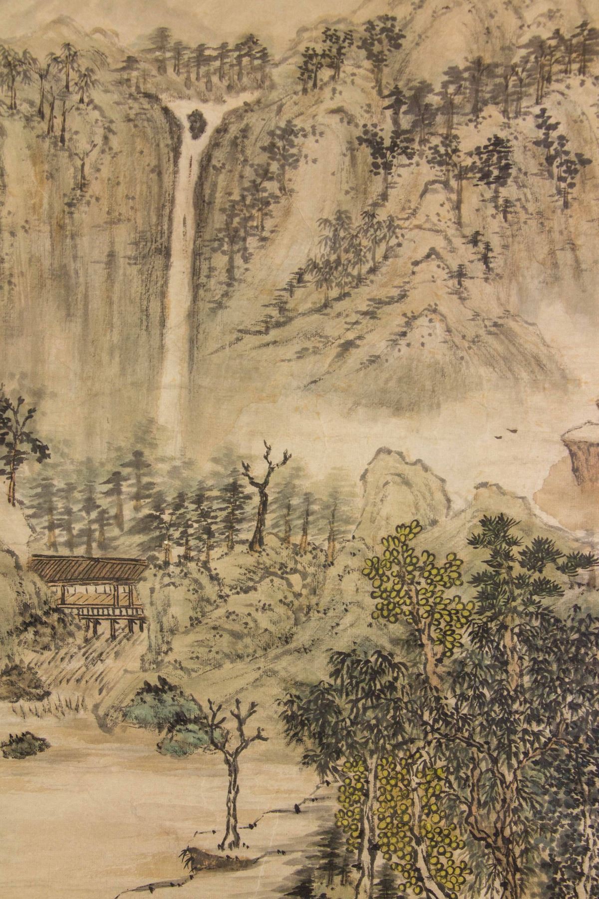 Ink and watercolor on paper. Featuring mountainous landscape with waterfall and cabin. Signed by artist, inscribed with 2 artist seals. 61 x 47.5 cm