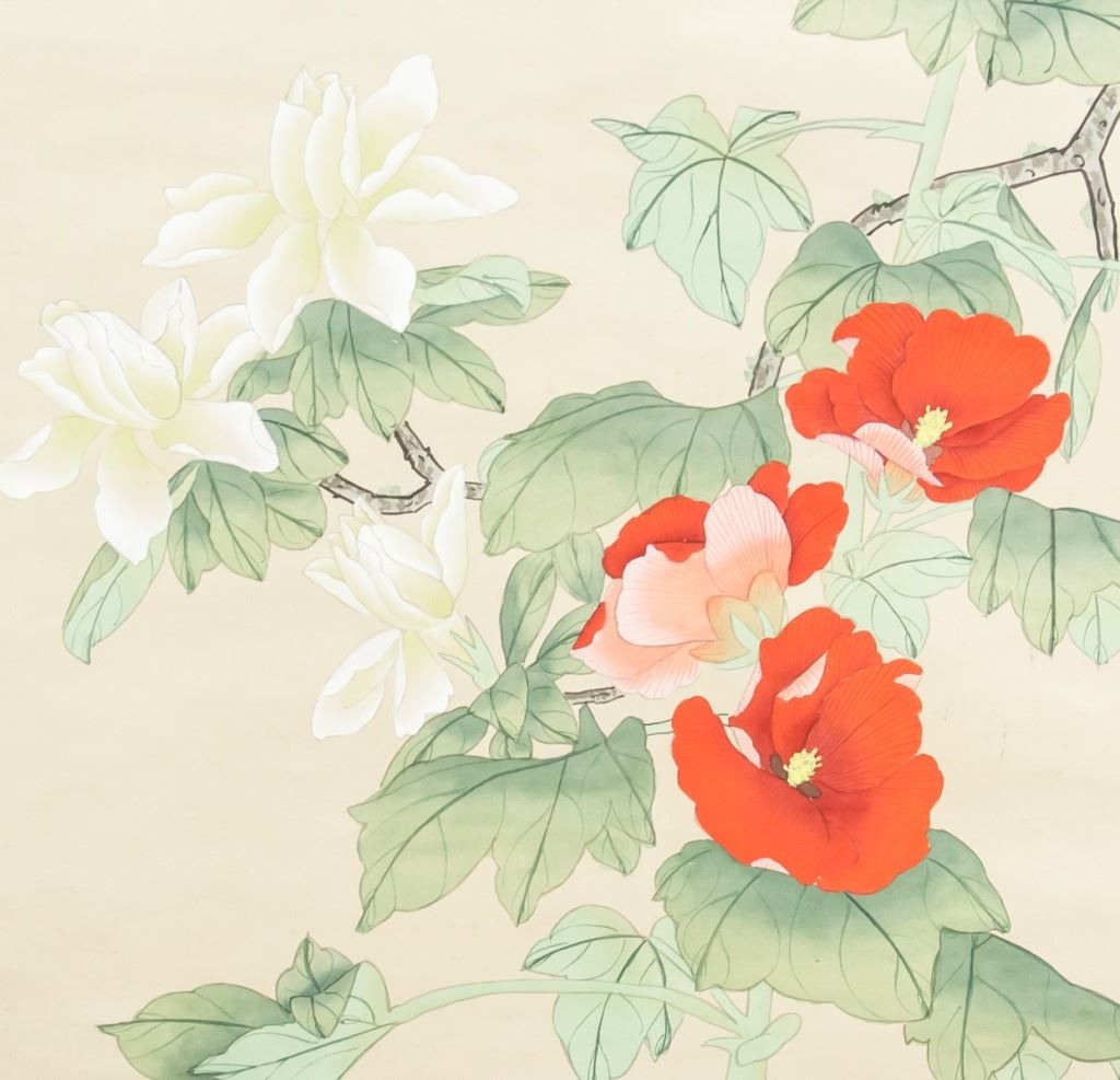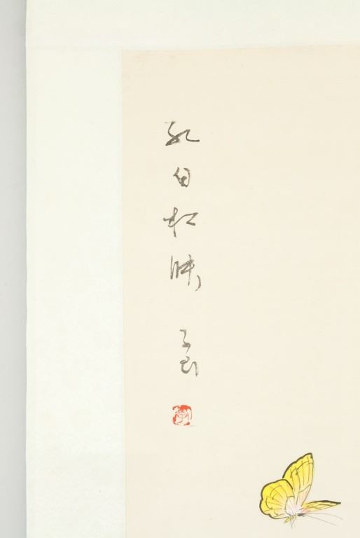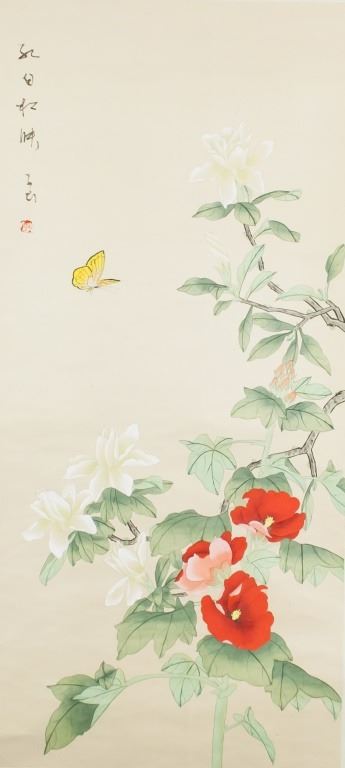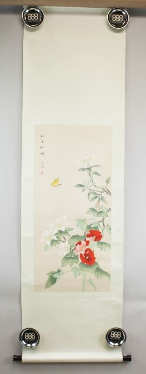 Chinese watercolor on paper scroll. Featuring bright red and white flowers. With yellow butterfly. Signed to the top left. Inscribed with one seal. 82 x 38 cm.