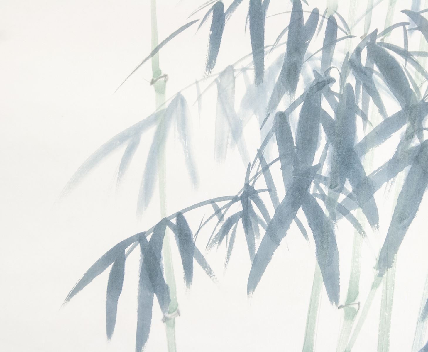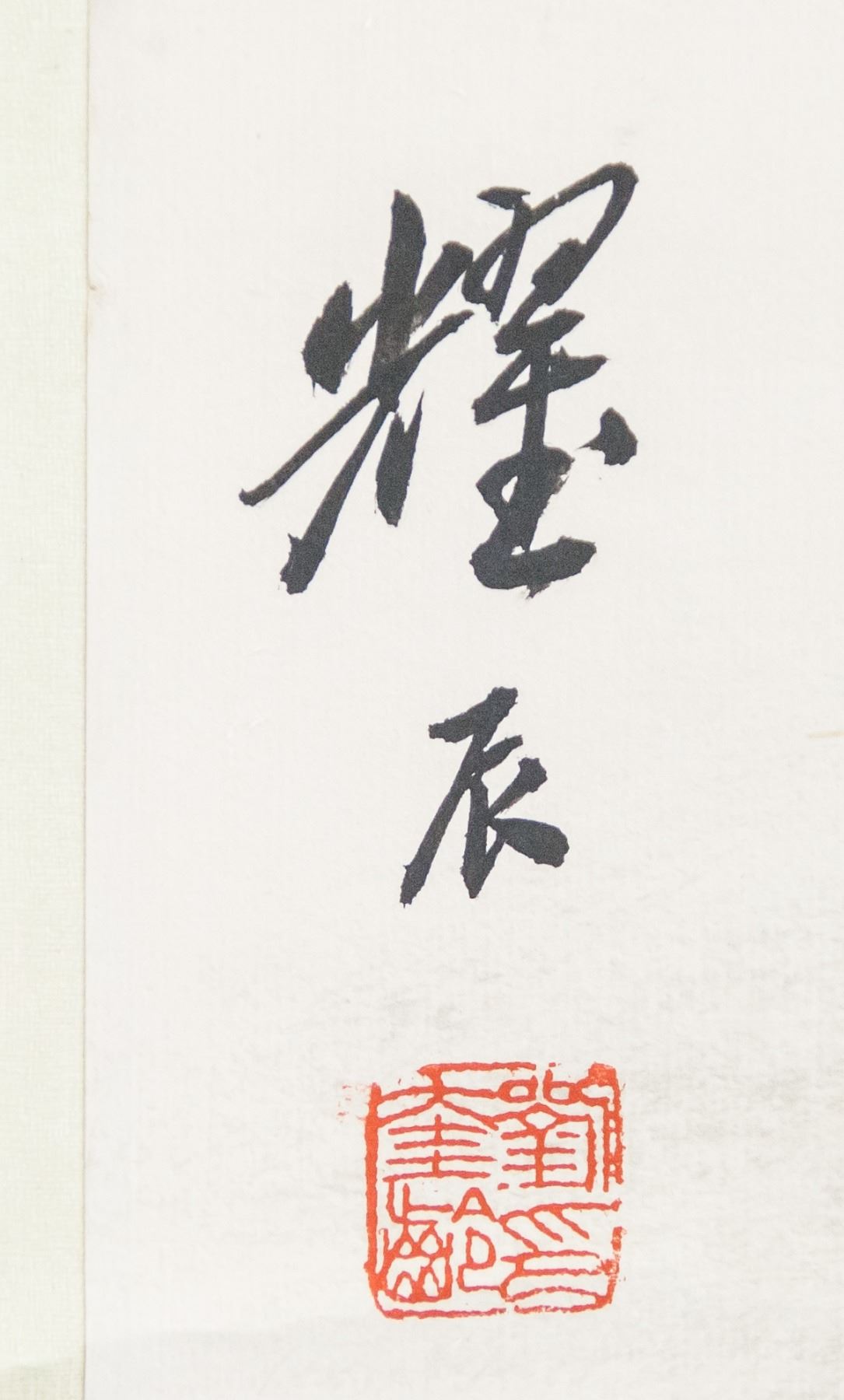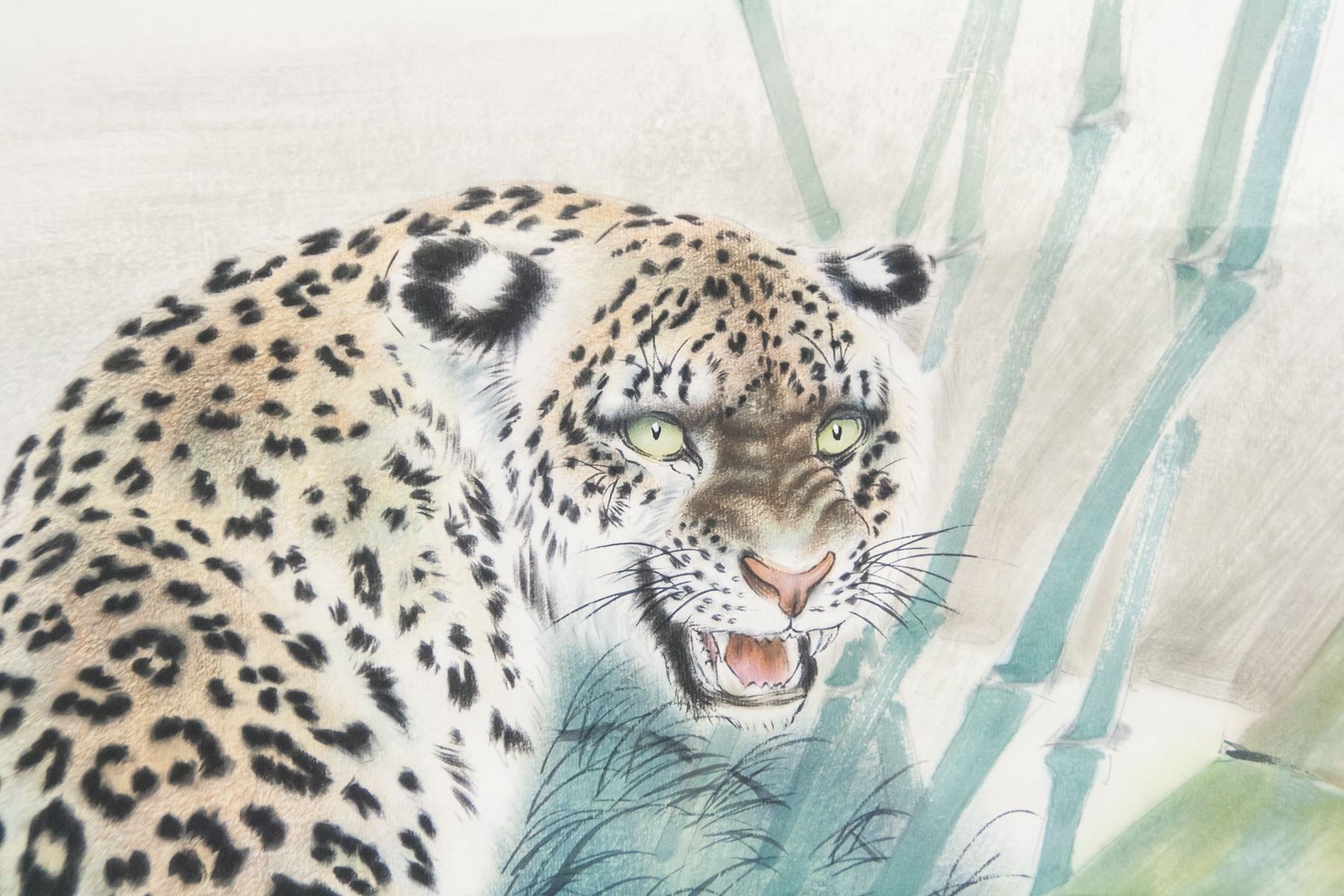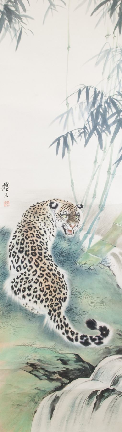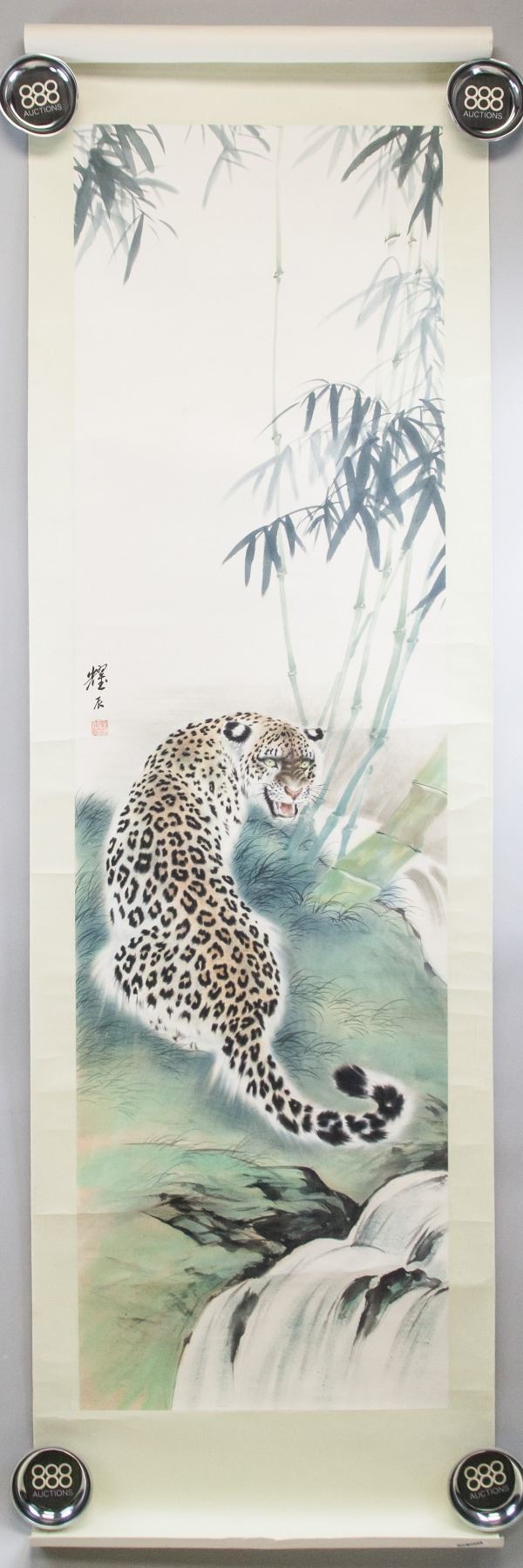 Chinese ink and watercolor on paper scroll. Featuring a tiger peering back at the viewer. Signed to the left and inscribed with one seal. 168 x 49 cm.