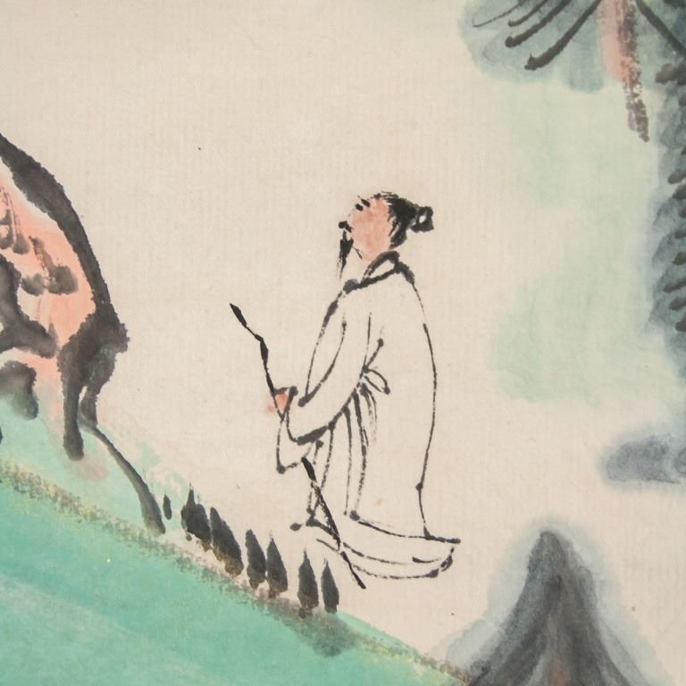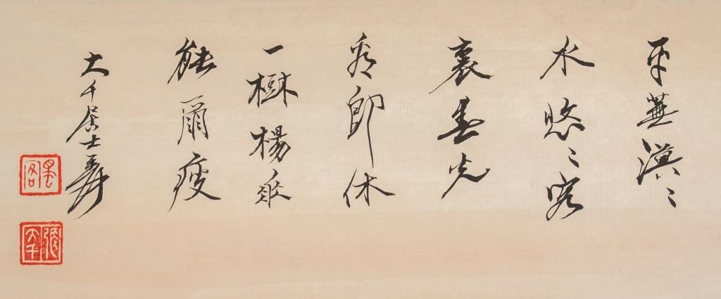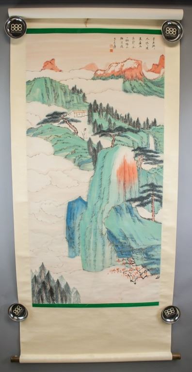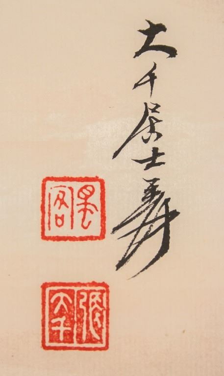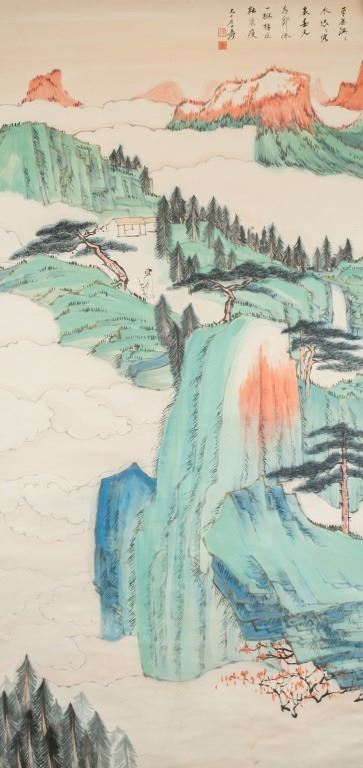 Chinese ink and watercolor on paper. Featuring mountainous landscape. Signed "Daqian" in Chinese characters to the top. Inscribed with two seals. 138 x 67 cm.