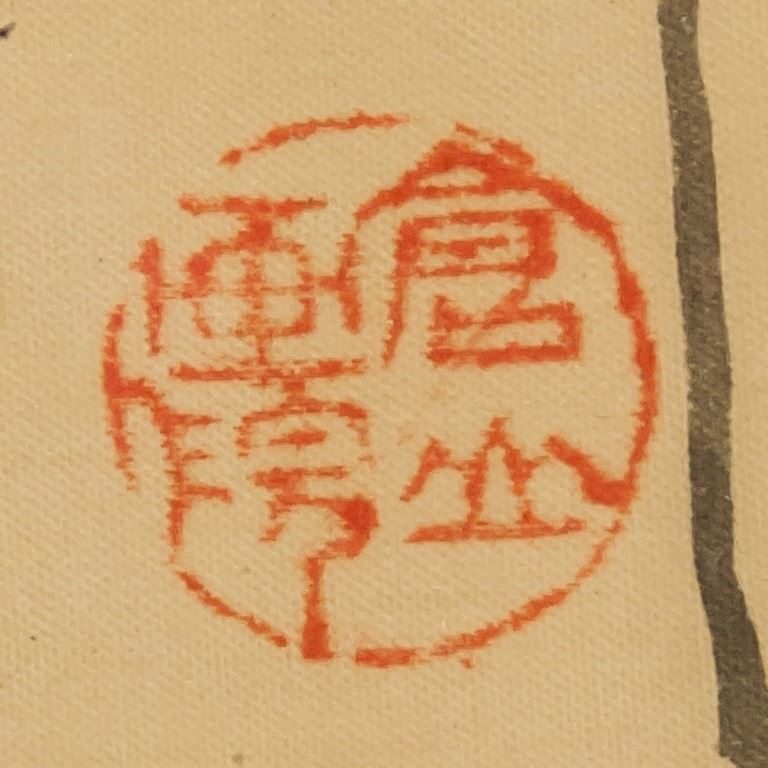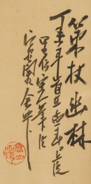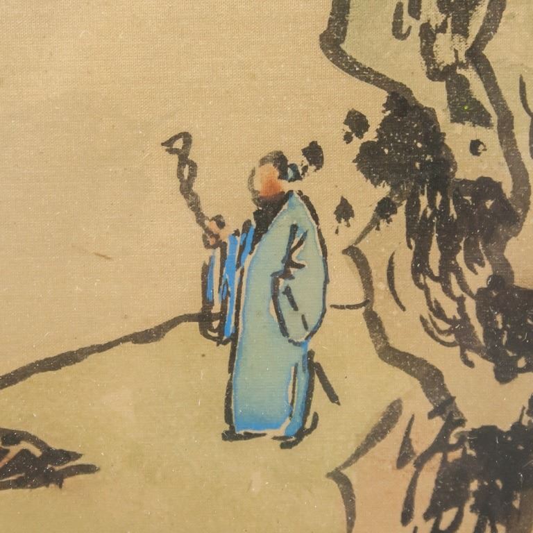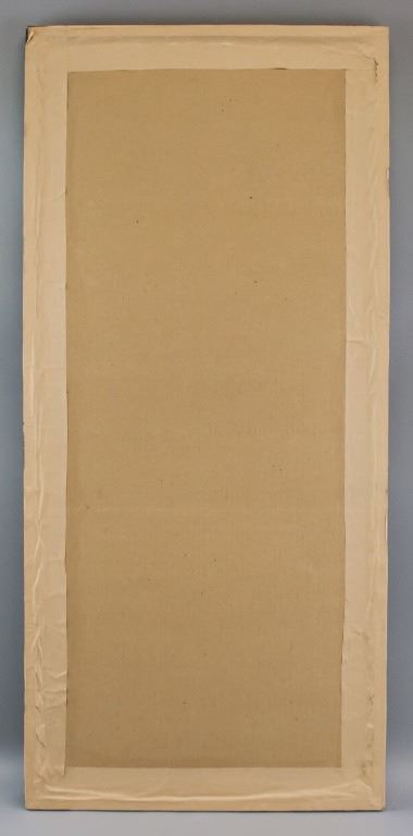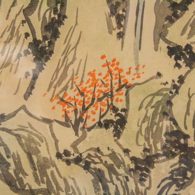 Chinese watercolor on silk, framed. Featuring mountain landscape. Inscribed with one stamp. 95 x 44 cm.