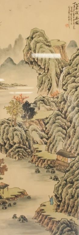 Chinese watercolor on silk, framed. Featuring mountain landscape. Inscribed with one stamp. 95 x 44 cm.