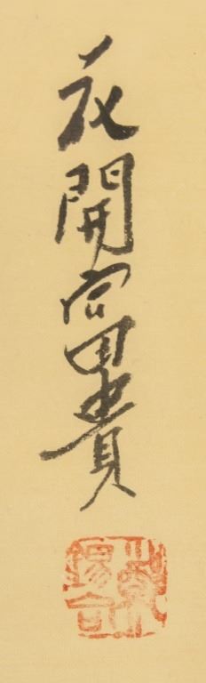 Chinese watercolor on silk, framed. Featuring a bird and two flowers. Inscribed with one seal. 38 x 28 cm. Frame size: 54 x 43 cm.