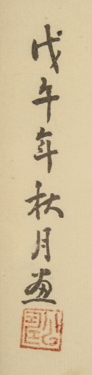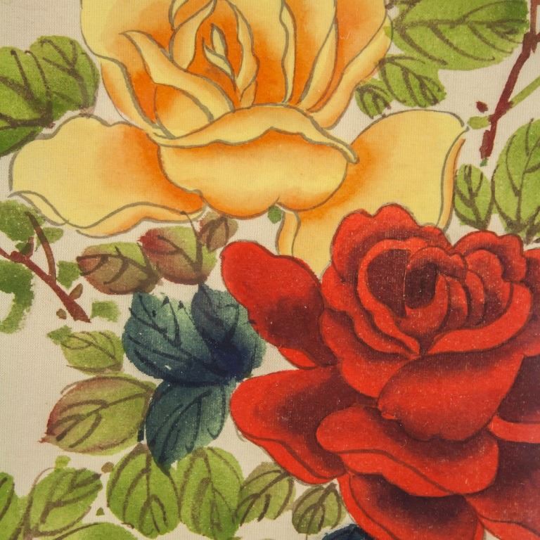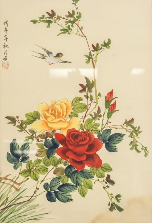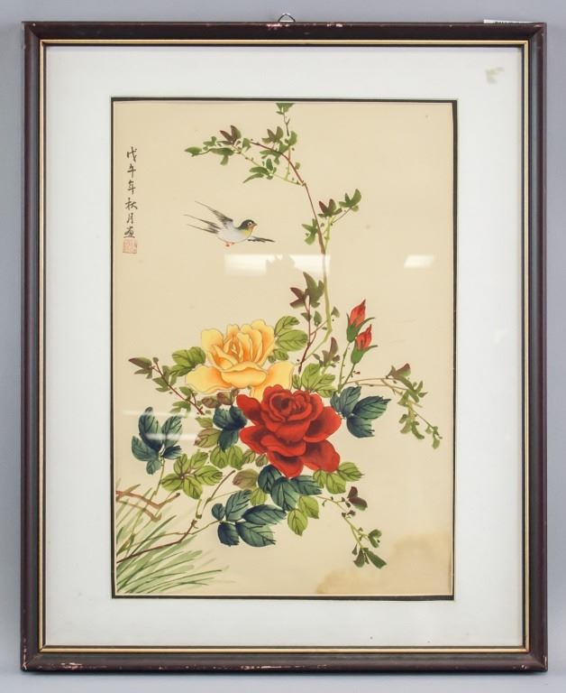 Chinese watercolor on silk, framed. Featuring flowers and bird. Inscribed with one seal. 38 x 28 cm. Frame size: 54 x 43 cm.