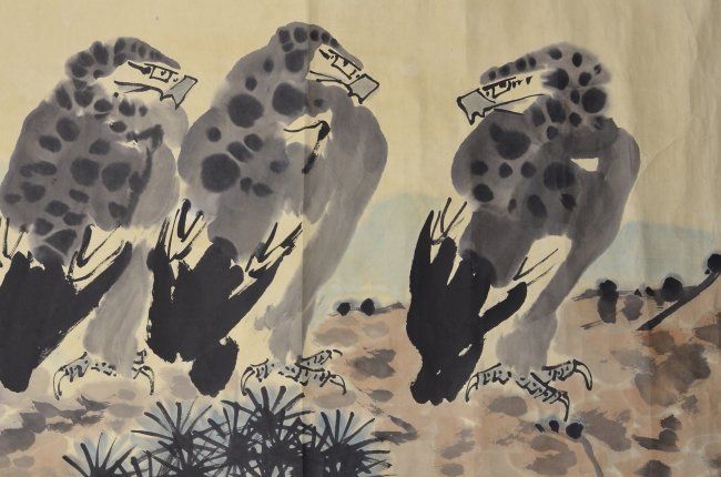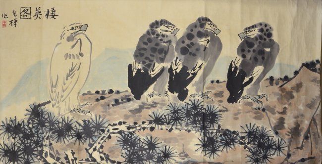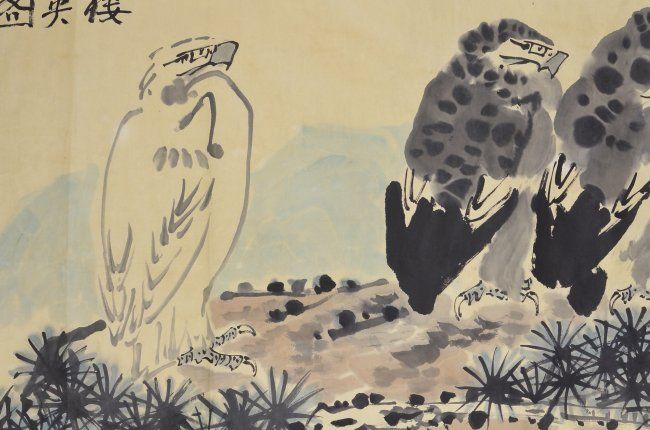 Chinese watercolour painting, ink and colour on paper, of birds and bamboo, inscribed and signed Li Kuchan with one artist seal; 95 cm x 178 cm