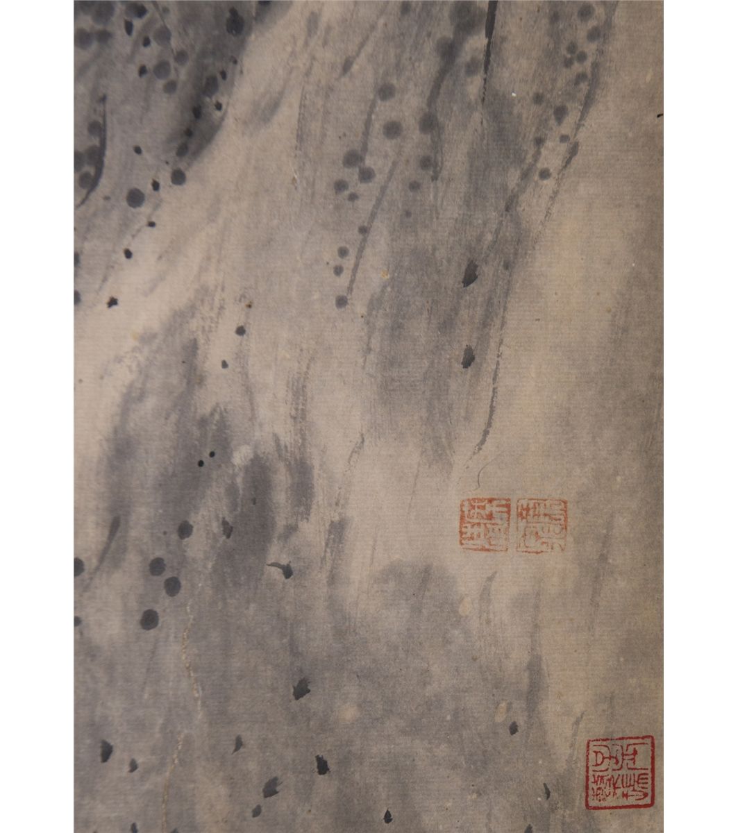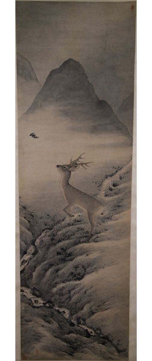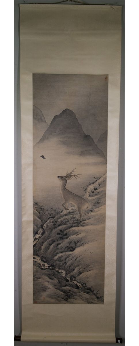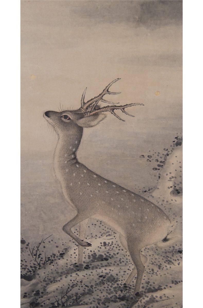 Deer in Landscape, Chinese ink and watercolour on paper; hanging scroll; inscribed with three artist seals; 140 cm x 45 cm