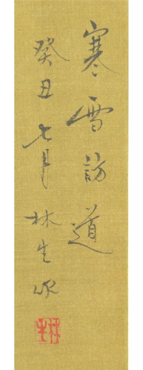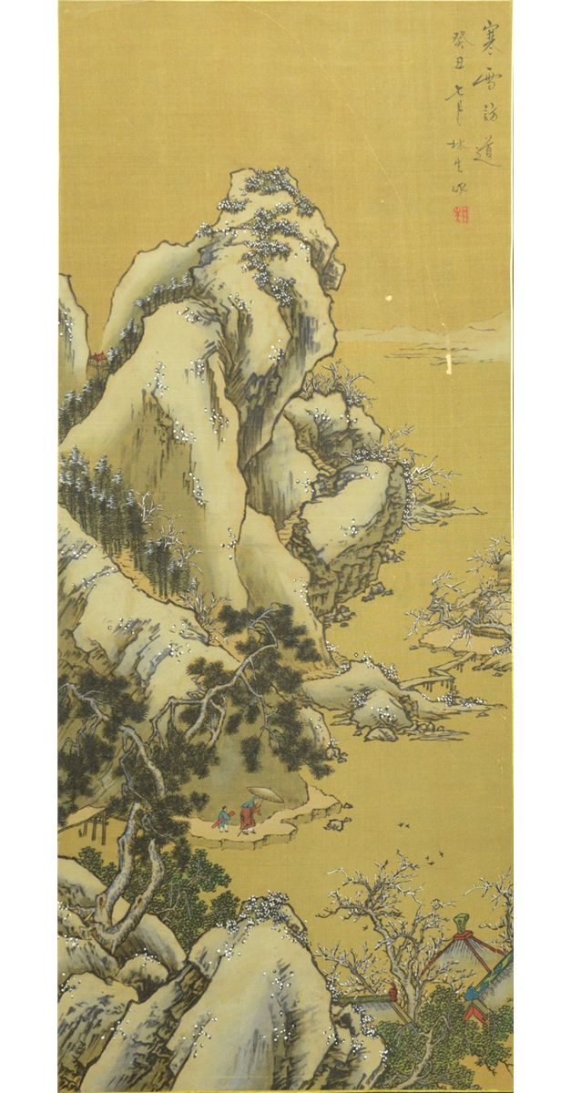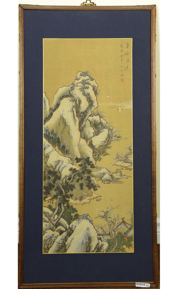 Chinese landscape, Chinese watercolour painting on silk, signed by Lin Sheng, framed with wooden frame. With two visible chips. 29 cm x 67 cm.