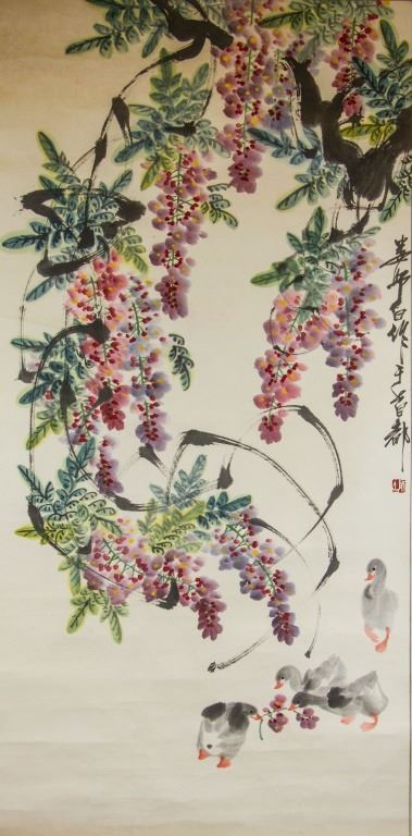 Painting of grapes and ducks; Chinese ink and watercolour on paper roll; signed Lou Shibai (1918-2010); inscribed with 1 artist seal; 136 cm x 47 cm