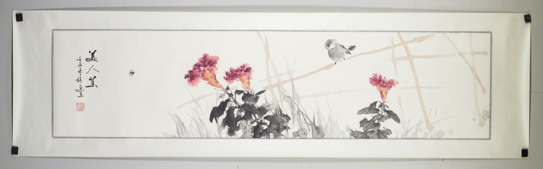 Ink and watercolour on paper, featuring birds perched on banana tree, signed and inscribed with one artist seal; 144 x 34 cm, PROVENANCE: Property of a gentleman (Nagoya, Japan)
