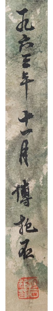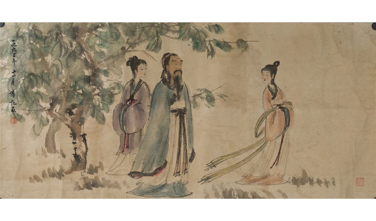 Sage and attendants, Chinese ink and watercolour; After Fu Baoshi (1904-1965) and inscribed with two artist seals; 95 cm x 45 cm