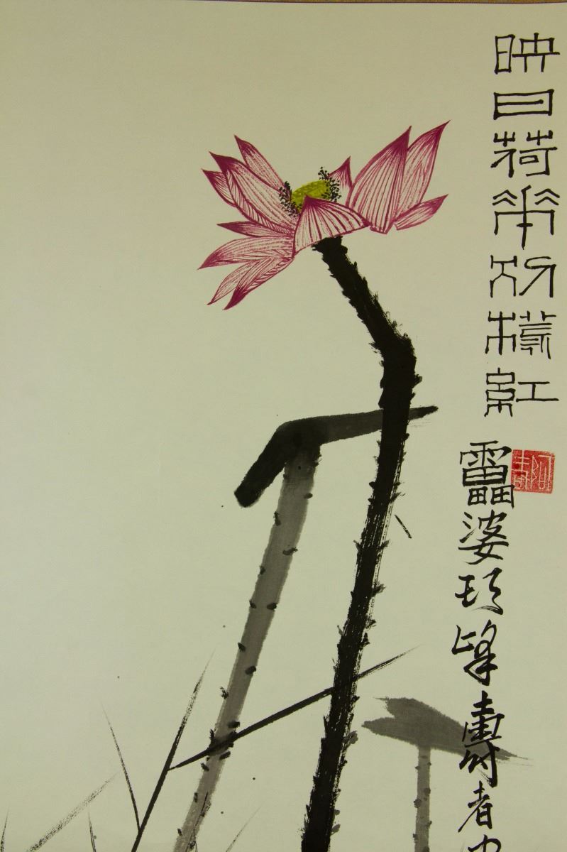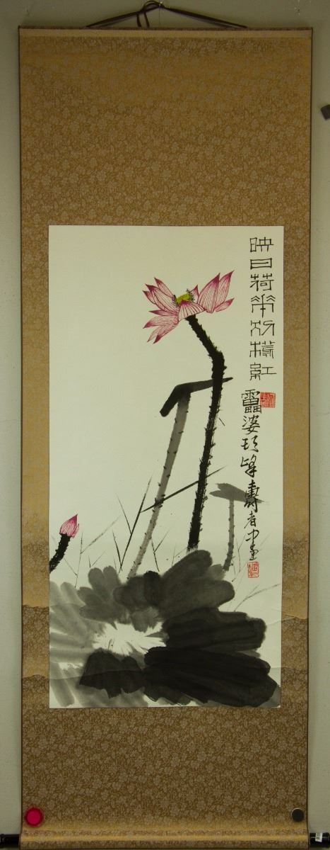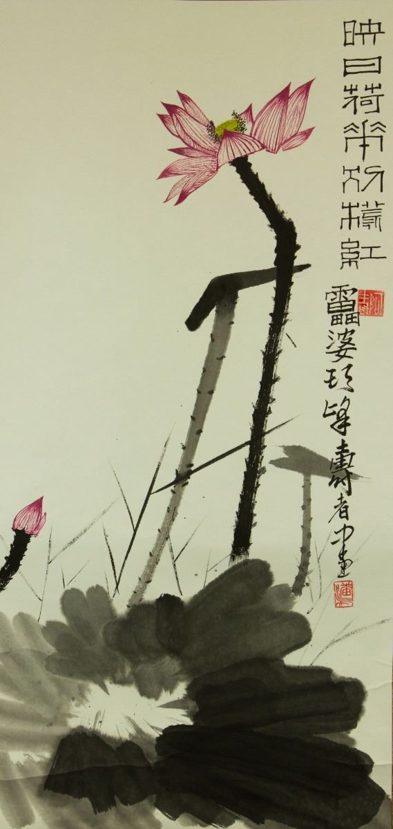 Lotus; Chinese ink and watercolour on paper; hanging scroll; signed and inscribed with two artist seals; 167 cm × 59 cm