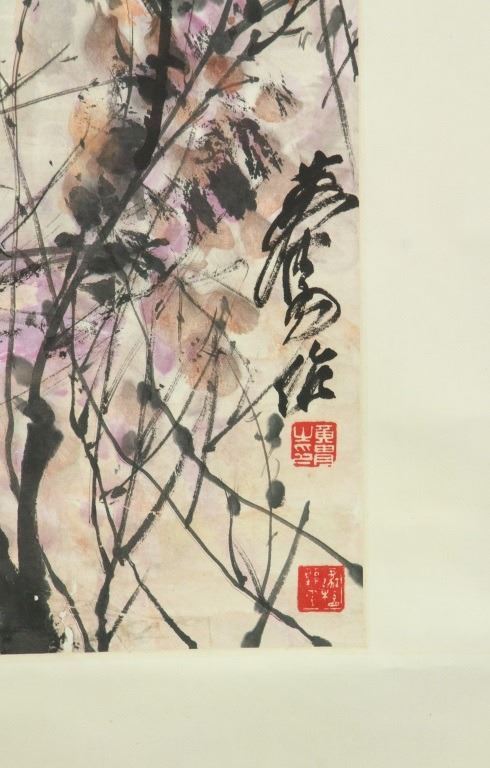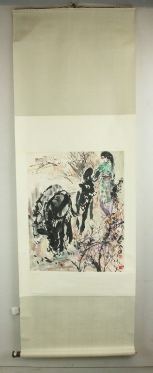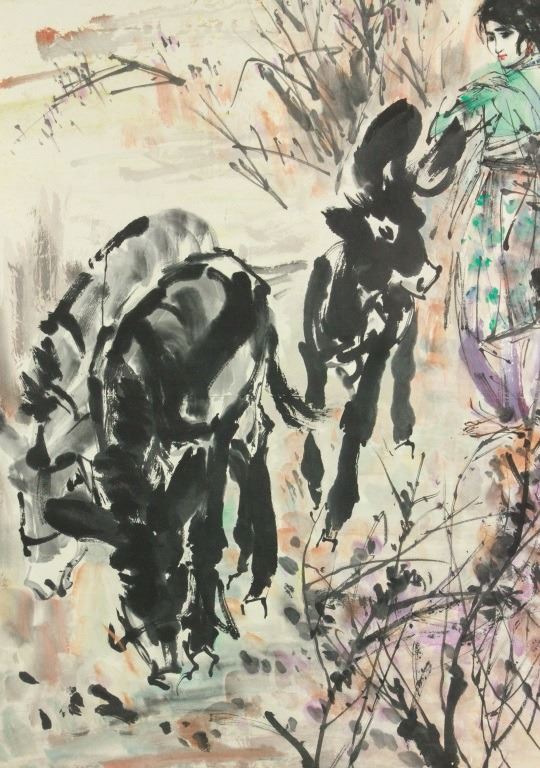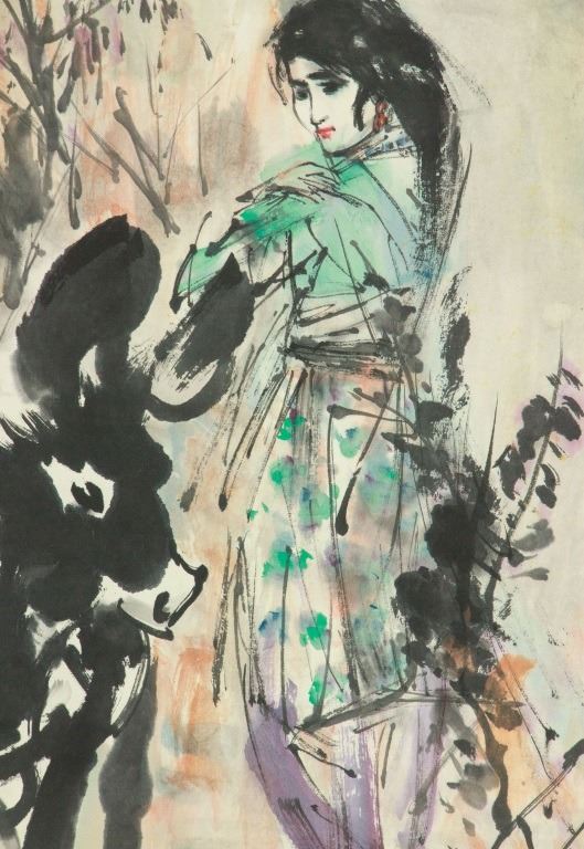 Ink and watercolour on paper; hanging scroll. Featuring an Uyghur girl with three donkeys. Signed Huang Zhou and inscribed with 2 artist seals. 68 x 54.5 cm.
