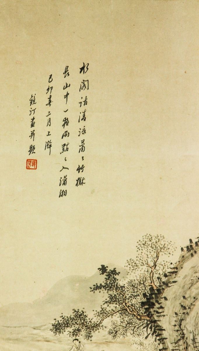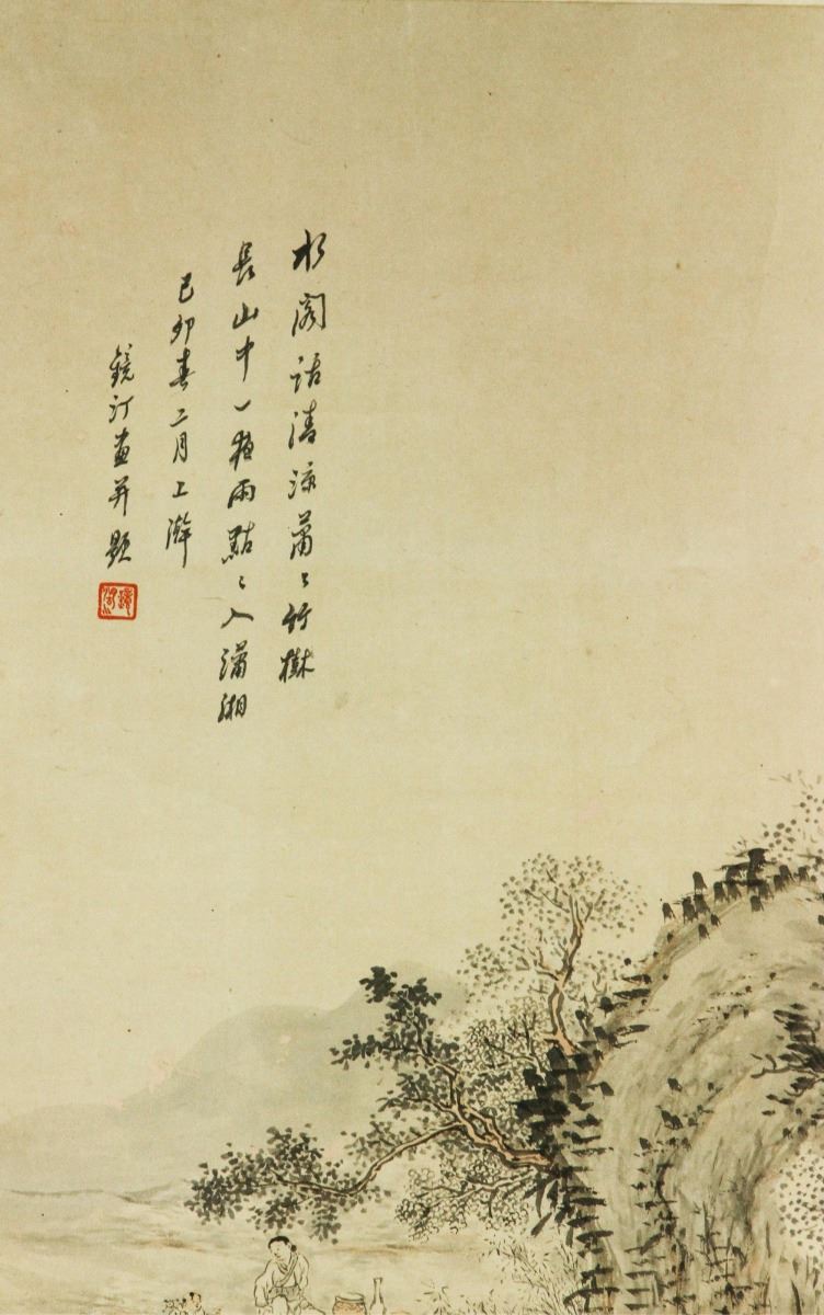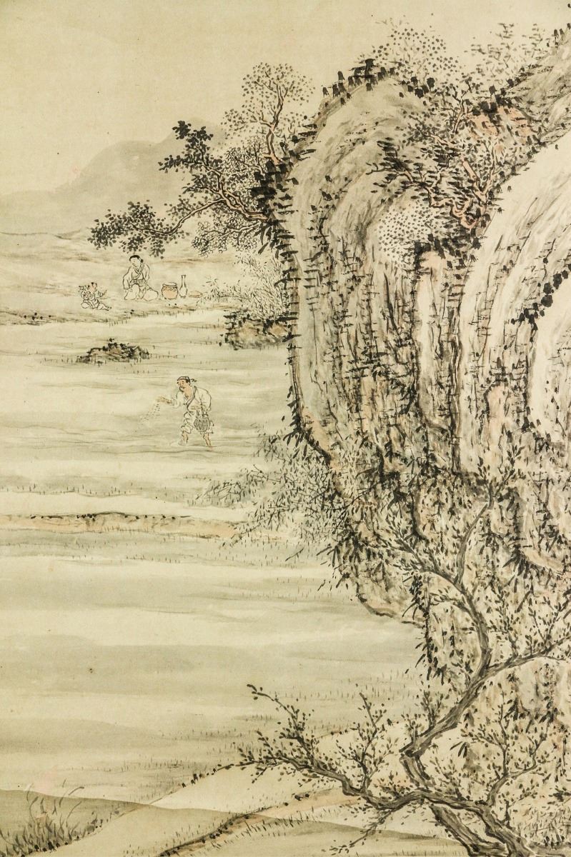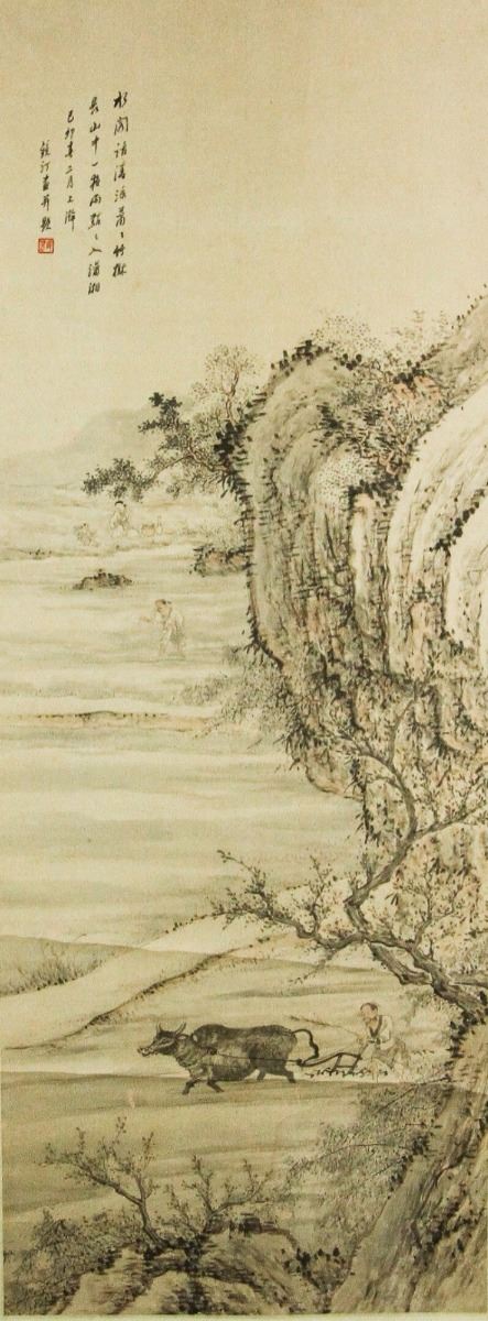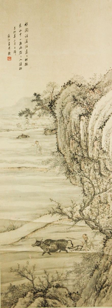 Farmers and cow; Chinese ink and watercolour on paper; hanging scroll; signed Wu Jingting and inscribed with one artist seal; 132 cm X 49 cm