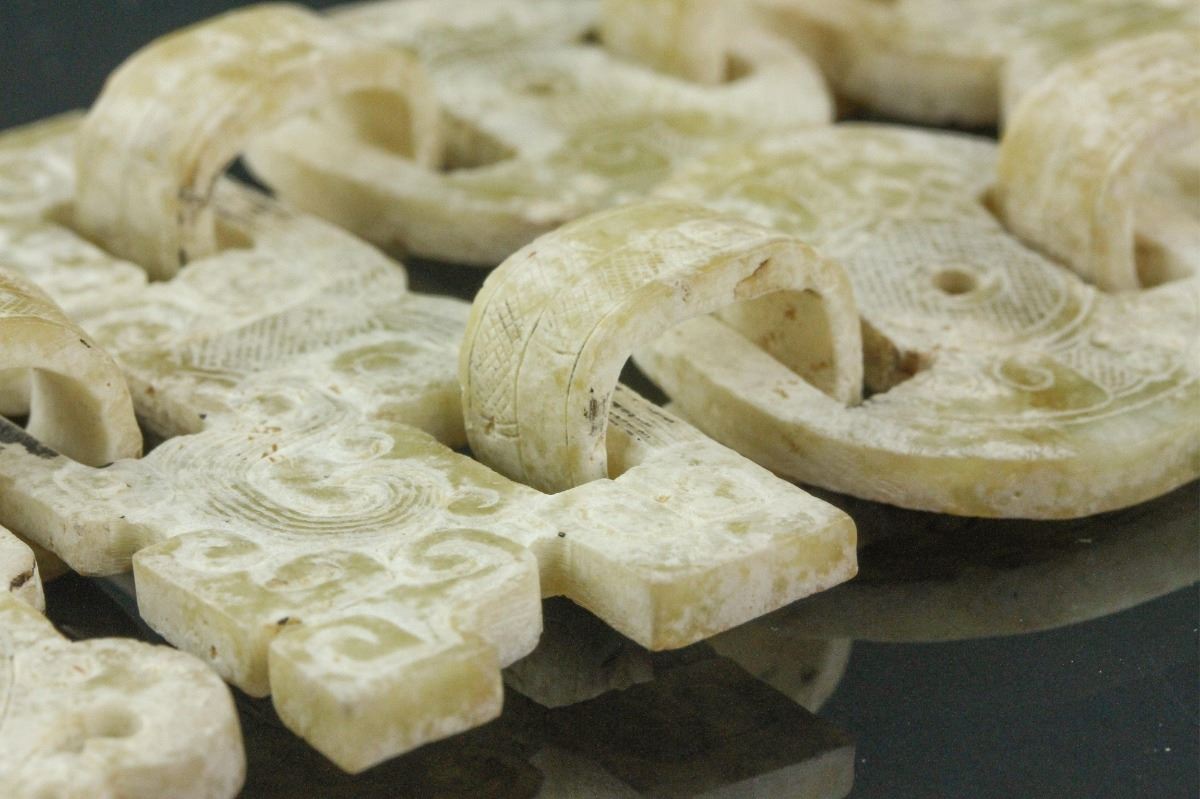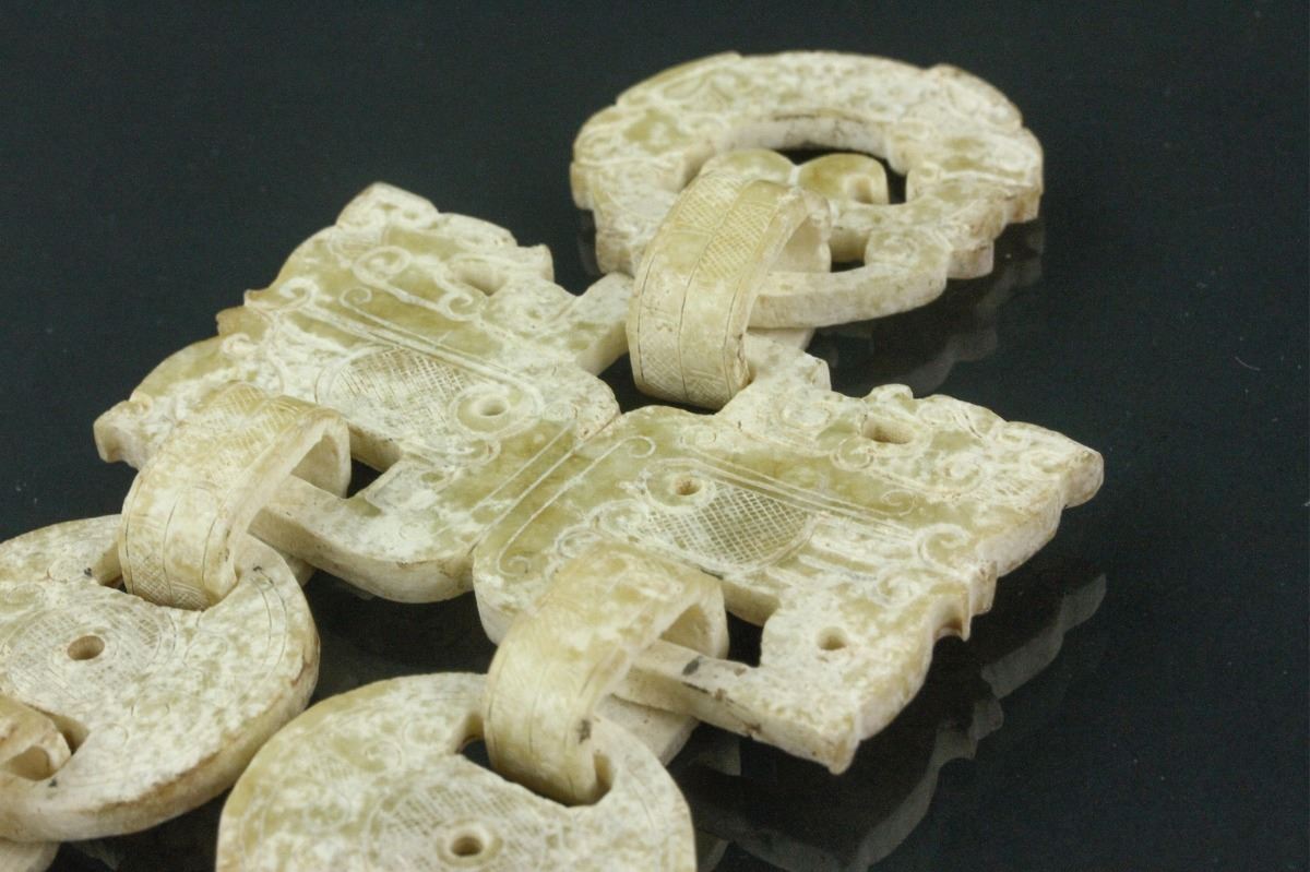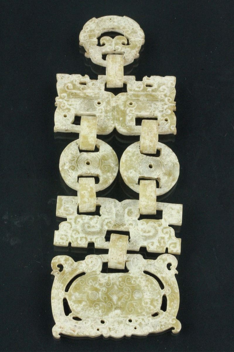 Chinese white archaistic jade carved hanging deco; featuring archaistic cloud carvings and dots; H: 22 cm, W: 7.5 cm, 120 grams