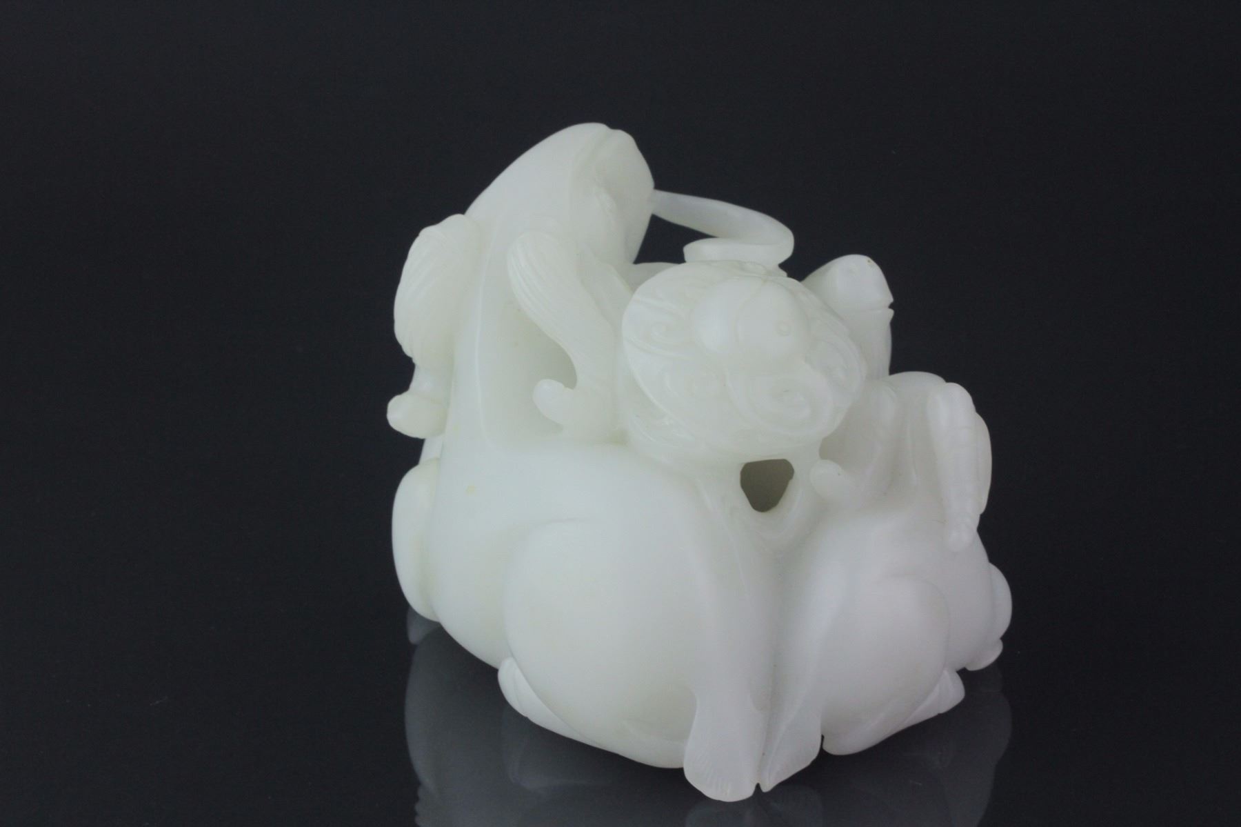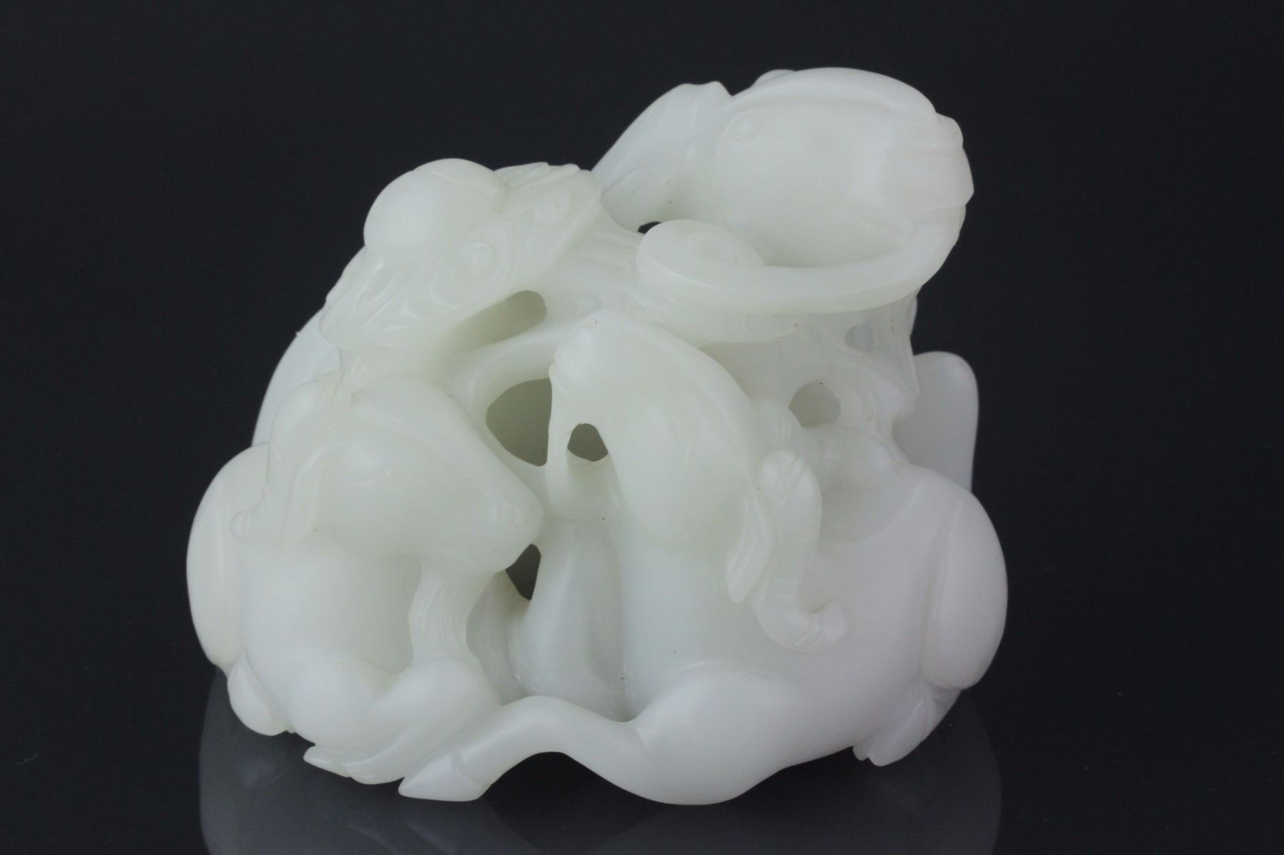 Chinese white hardstone carved display piece; featuring three rams bringing bliss; L: 11.5 cm, W: 11 cm, H: 9 cm, 1136 grams