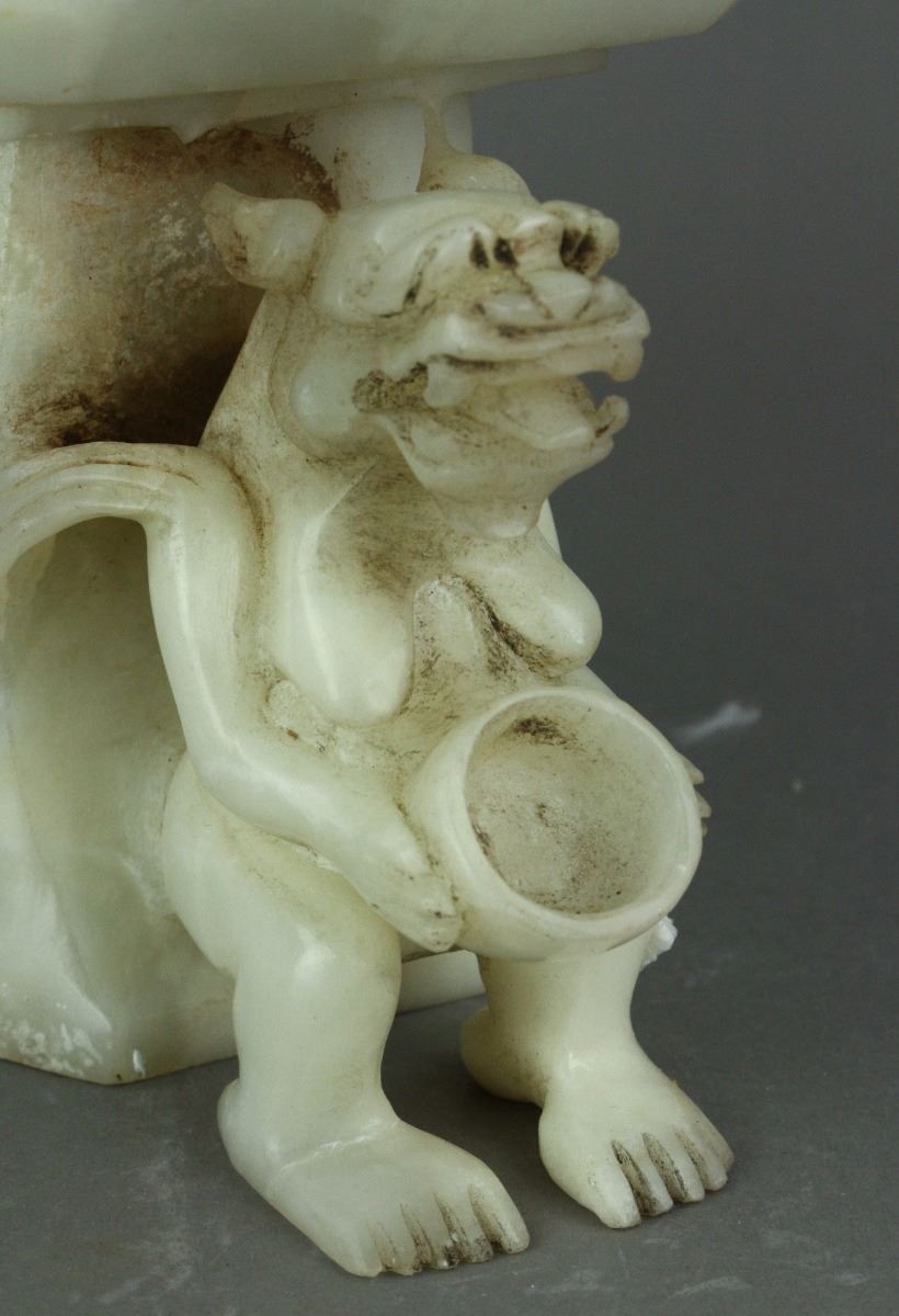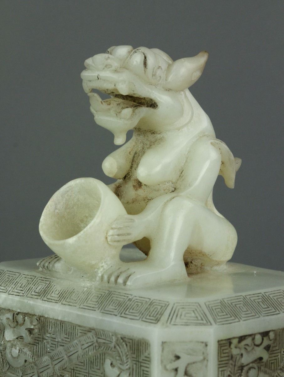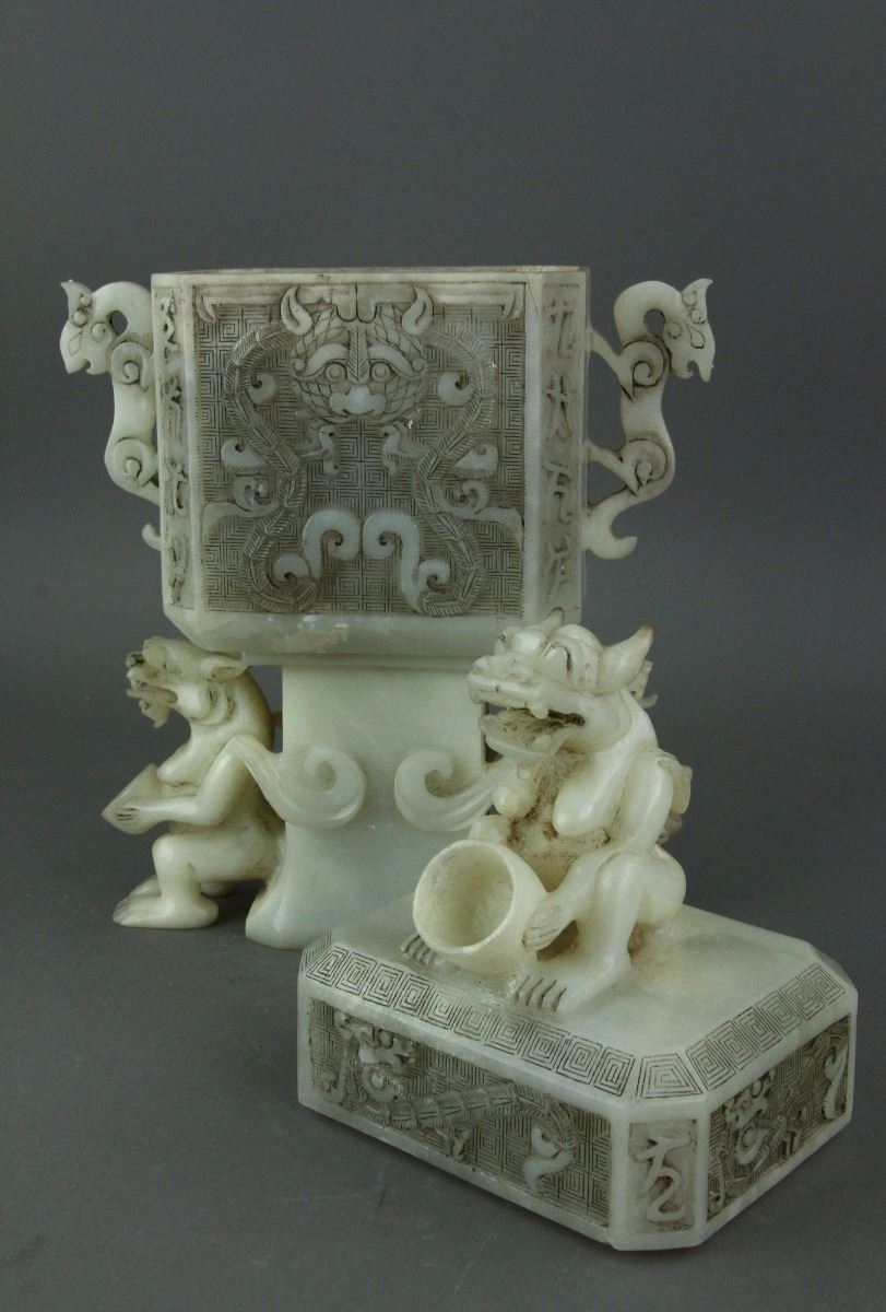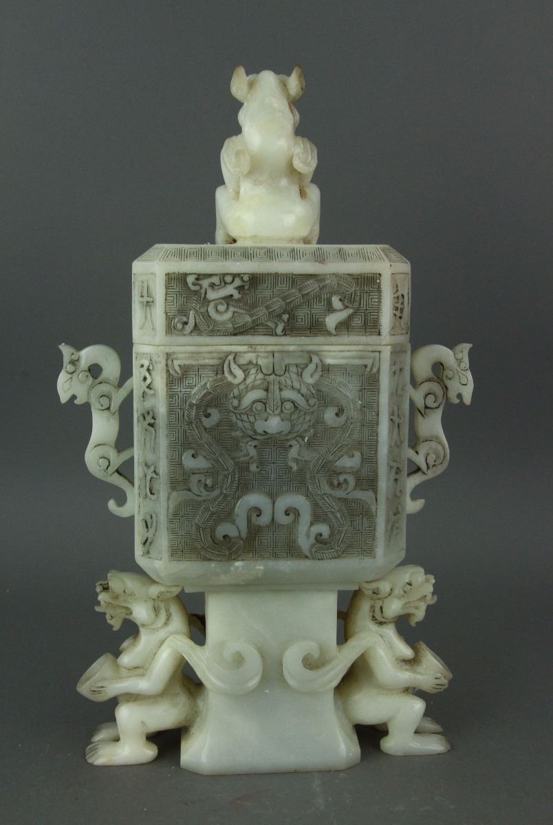 Chinese white jade carved vase with cover; of square body raised on flared foot rim; flanked by double Chilong handles; decorated with taotie archaistic patterns in low relief; H: 34 cm, W: 20 cm, 3378 grams
