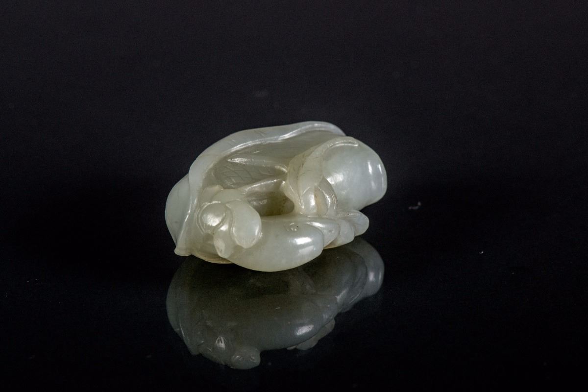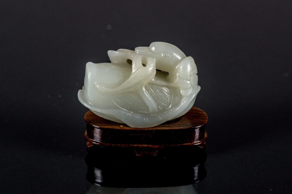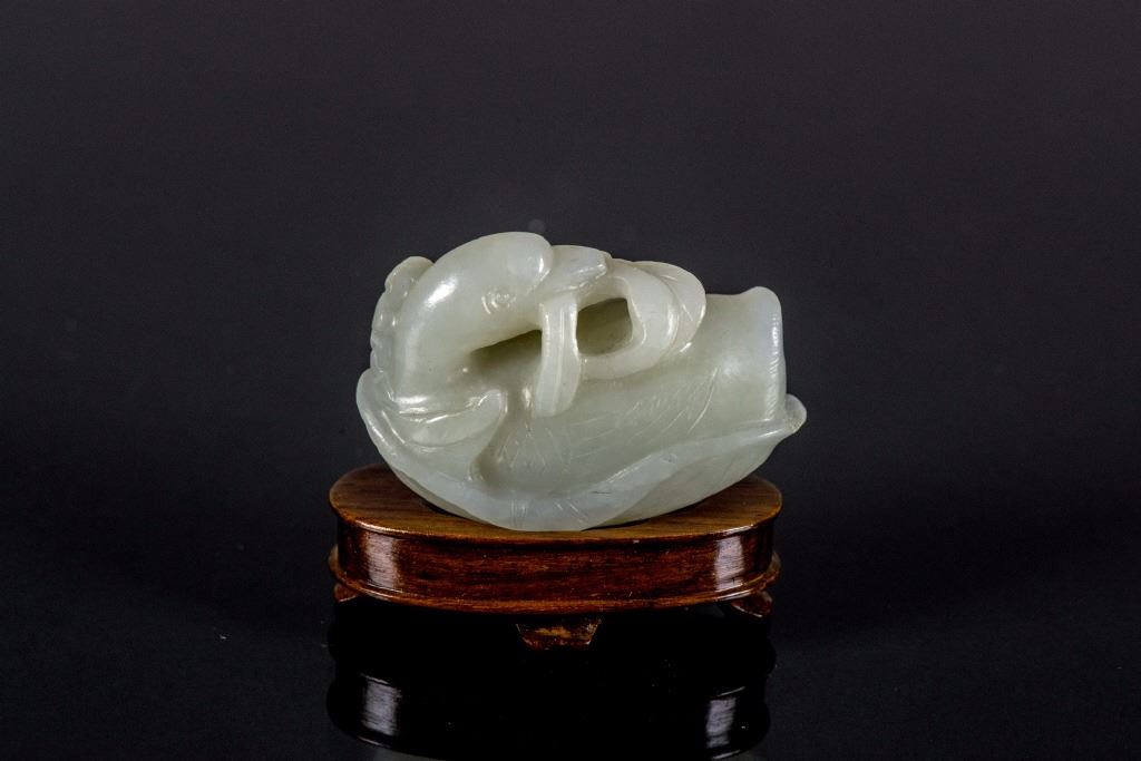 Chinese white jade carved piece; featuring a mandarin duck on lotus leaf; wood stand included; H: 5 cm, W: 3.5 cm, 45 grams; Density: 2.94