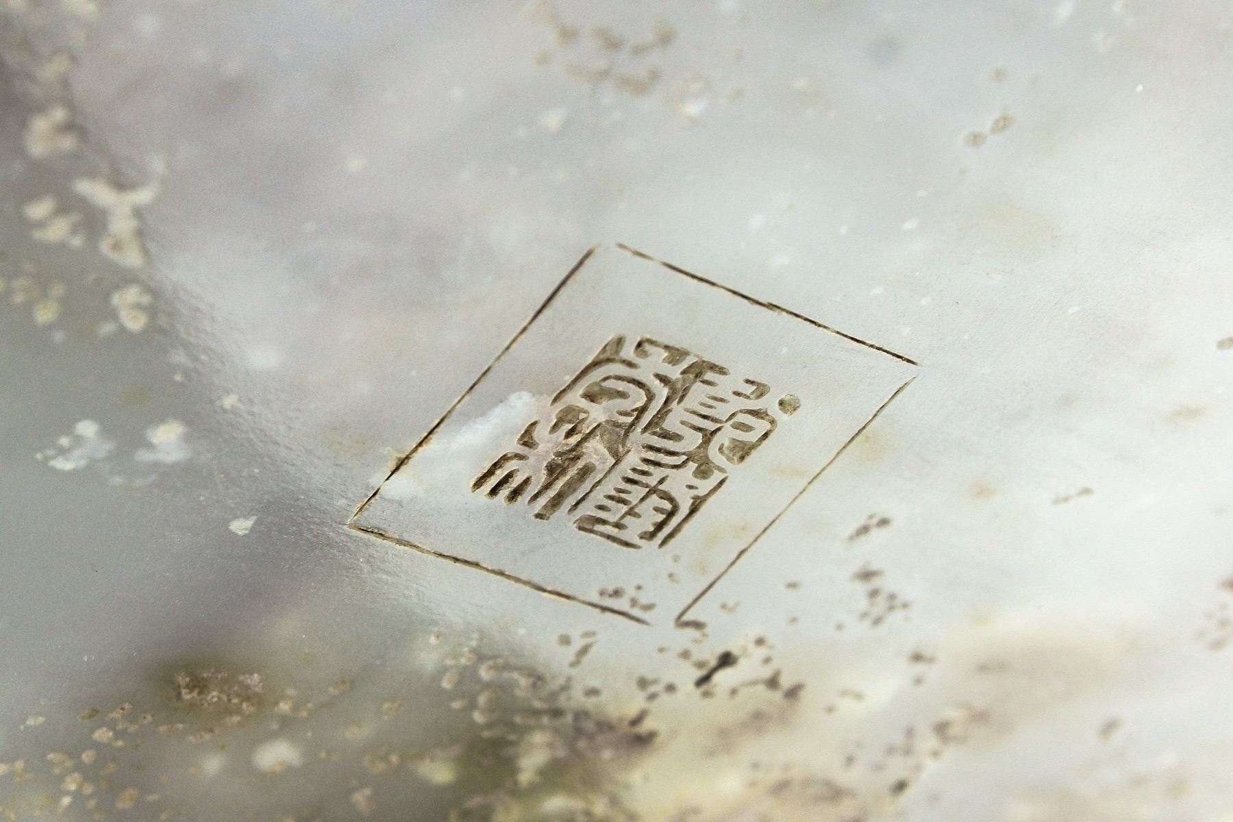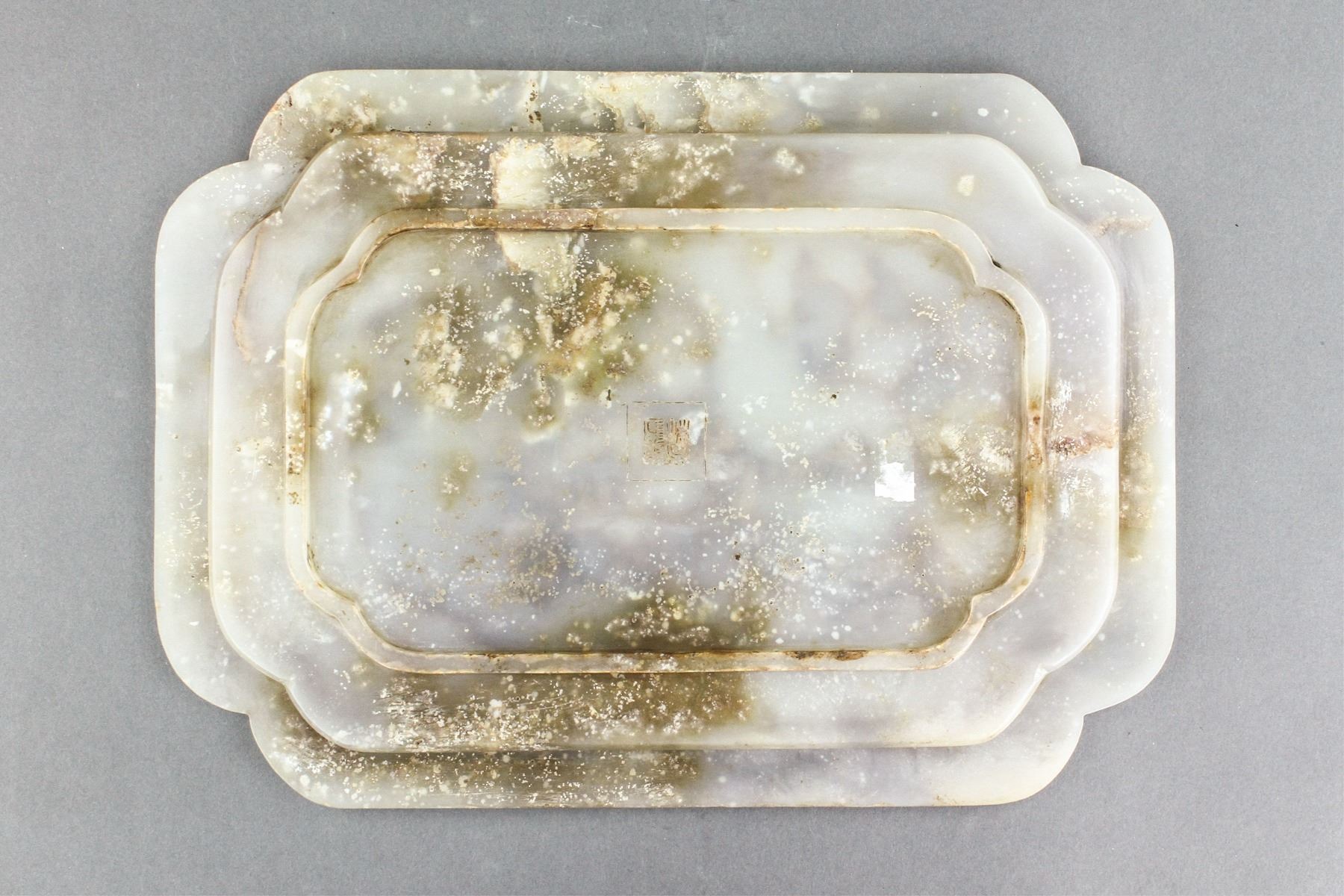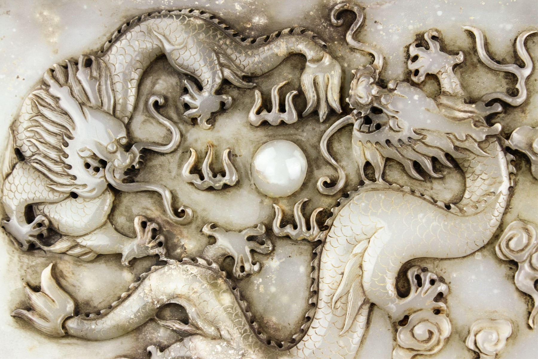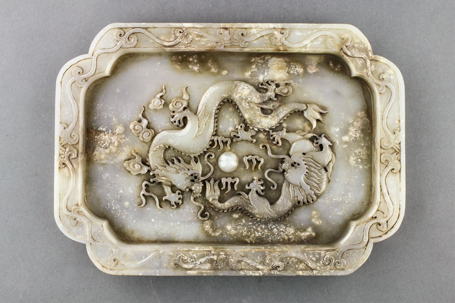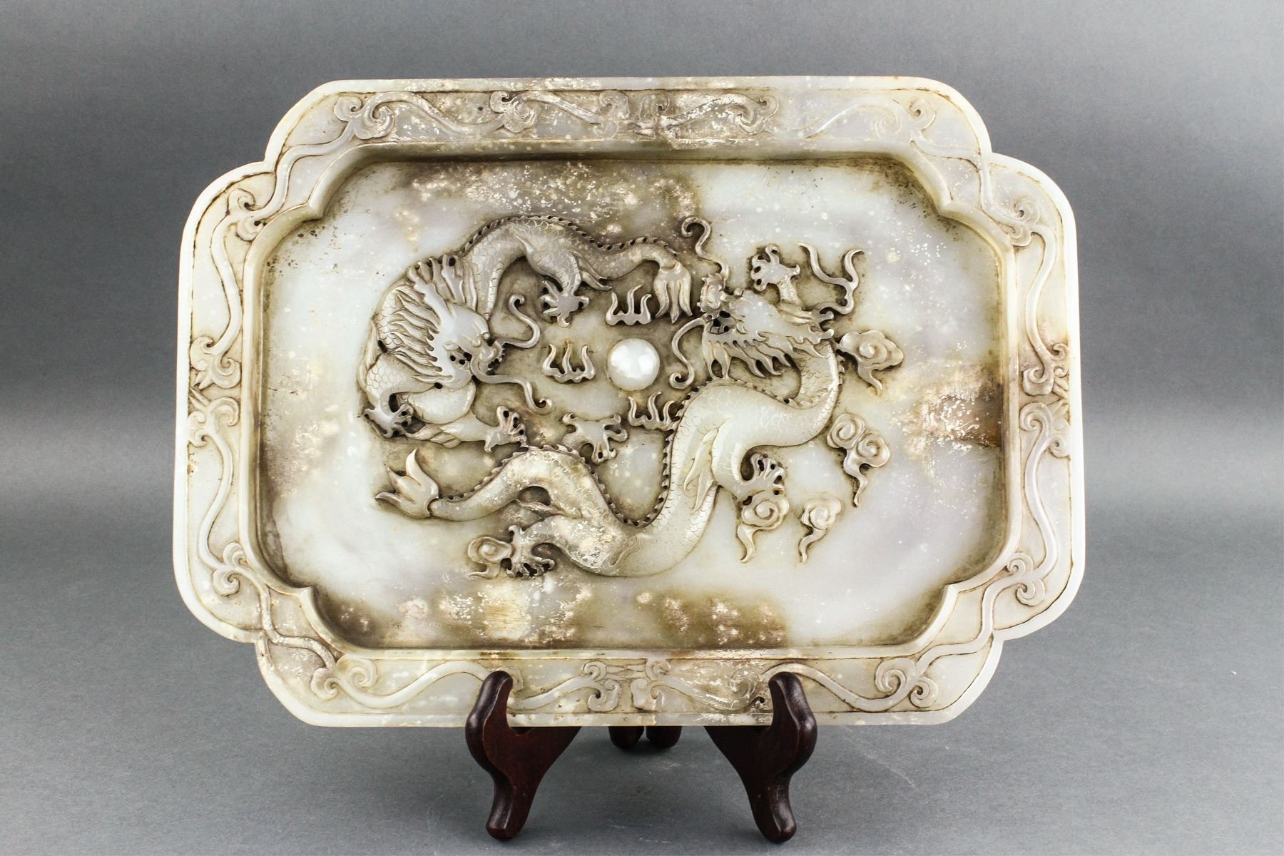 Chinese white jade carved plate; of canted rectangular form with curved rim; featuring double dragon chasing a flaming pearl in relief; four-character Qianlong mark on base; W: 23 cm, L: 32 cm, 1201 grams