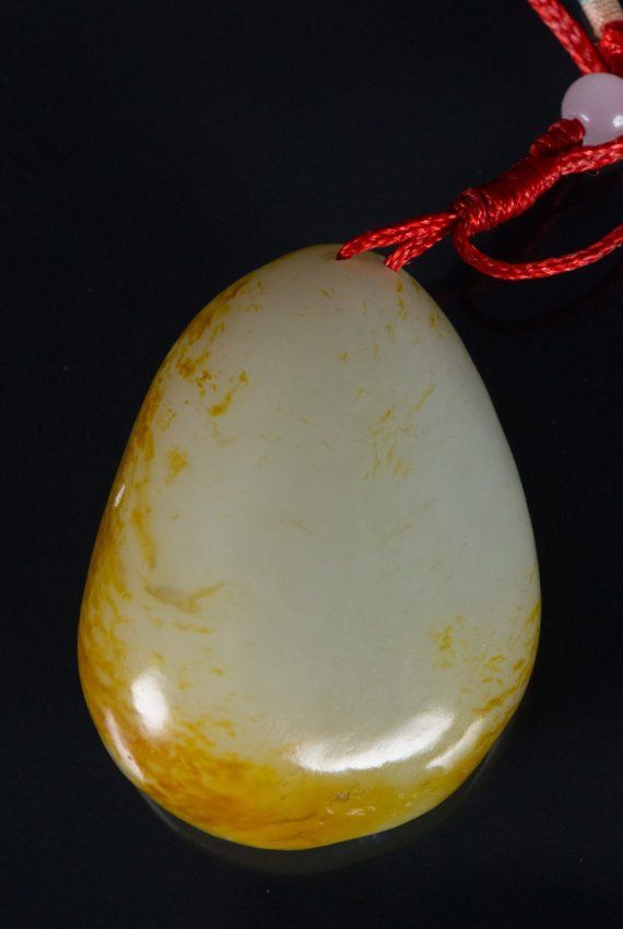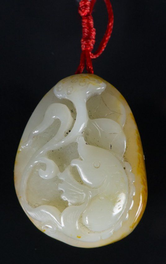 Chinese jade carved pebble boulder pendat; featuring fish in relief; of translucent white tone with mutton fat suffusions; H: 5 cm, W: 4 cm, 61 grams