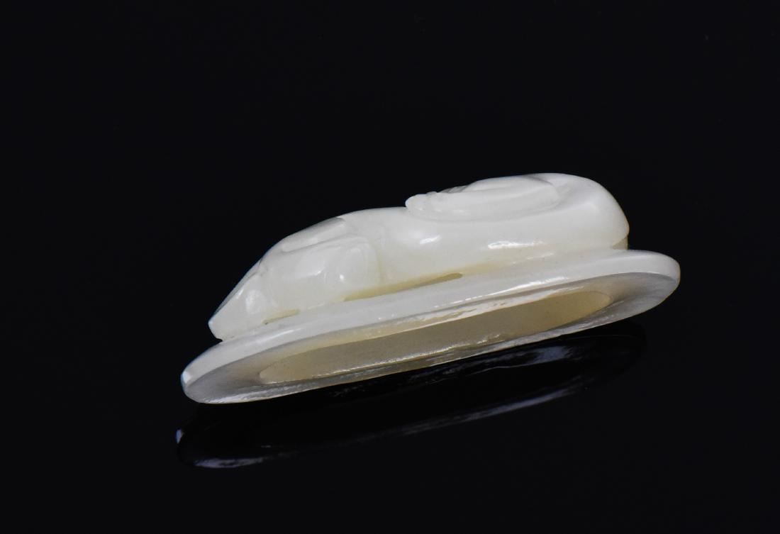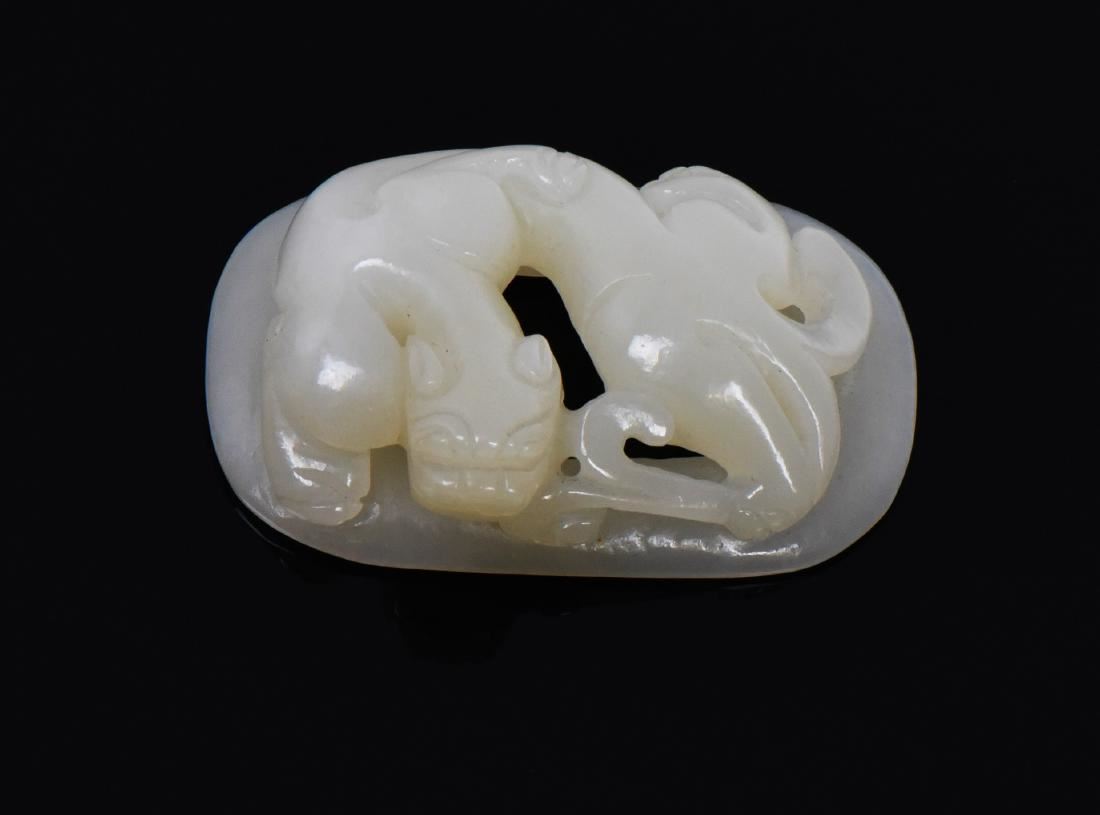 Chinese White Jade Carved Jaguar Toggle. Estimated more than 50 yrs old. Jadeite is called Yingyu in Chinese, with a Mohs hardness of 7; its pressure bearing capacity is must greater than the diamond, belonging to the category of pyroxene. Jadeite integrates the beauty of jade and brilliance of a gem. Its colors are very mysterious and enigmatic, elegant, pure and soft. Jadeite is bright in color, with a glass gloss oily appearance and a high transparency in upwards of 3mm to 5mm light penetration. It is hard enough to cut glass and is cold to the touch. There are multiple grades of Jadeite. 1. Glass Jadeite; the best jade species, featured by the highest transparency, almost entirely transparent. It contains fewer inclusions comprised of impurities and is crystal clear. 2. White Jadeite; fine in texture with common transparency and white as snow. Often with a fibrous structure most of which is opaque with maximum light penetration up to 1mm depth. Typically used for bracelets, carvings and pendants. 3. Flower Green Jadeite; is in vein distribution, grounding by light green and other colors, in coarse and refined texture. It is a more widely distributed species and is classified according to the color distribution status varying from sparse and intensive and the color ranging from dark to light. 4. Oily Green Jadeite; refers to the dark emerald green with it color not pure green, but with gray and a tone of blue varying from light to dark. Good transparency and the surface has an oily sheen due to different degrees of green shades. It is referred to as "Rind Oily Green" in dark color and "Fresh Oily Green" in light color. Size: See Ruler Photo. (Photos Represent The Condition Of The Lot.)