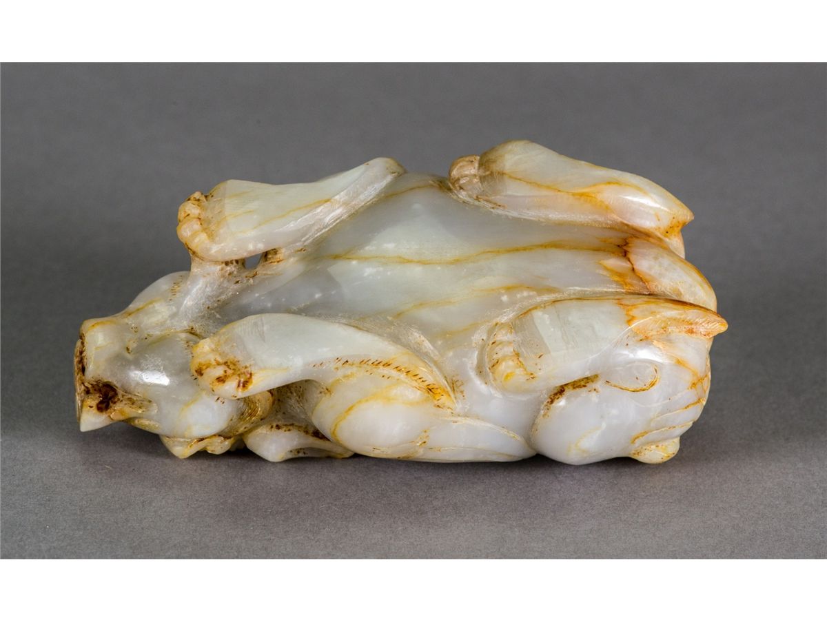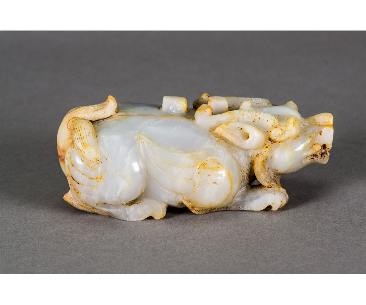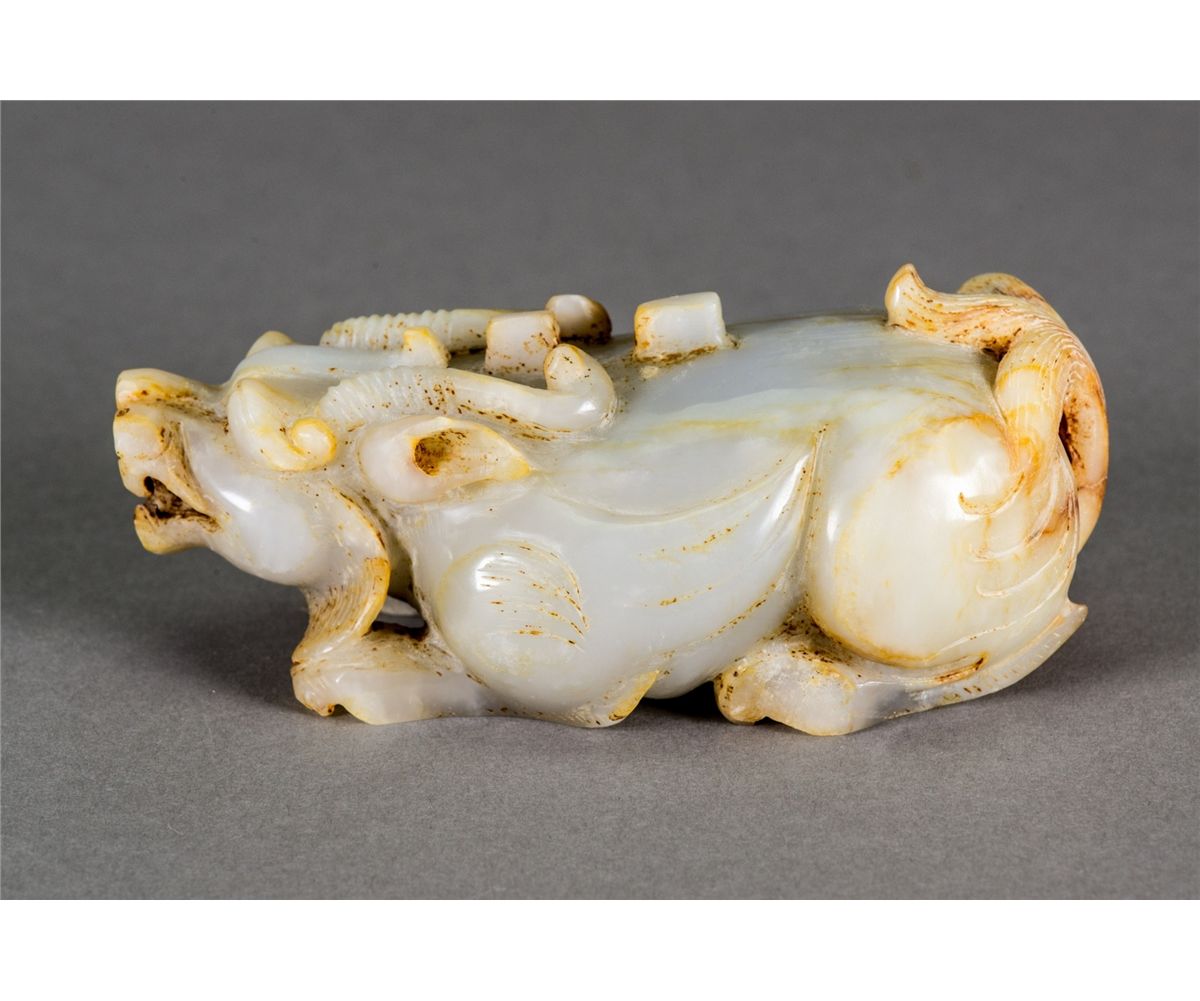 Chinese white jade carved Pixie; featuring a resting Pixie; of russet suffusions; H: 6 cm, W: 15 cm, 742 grams