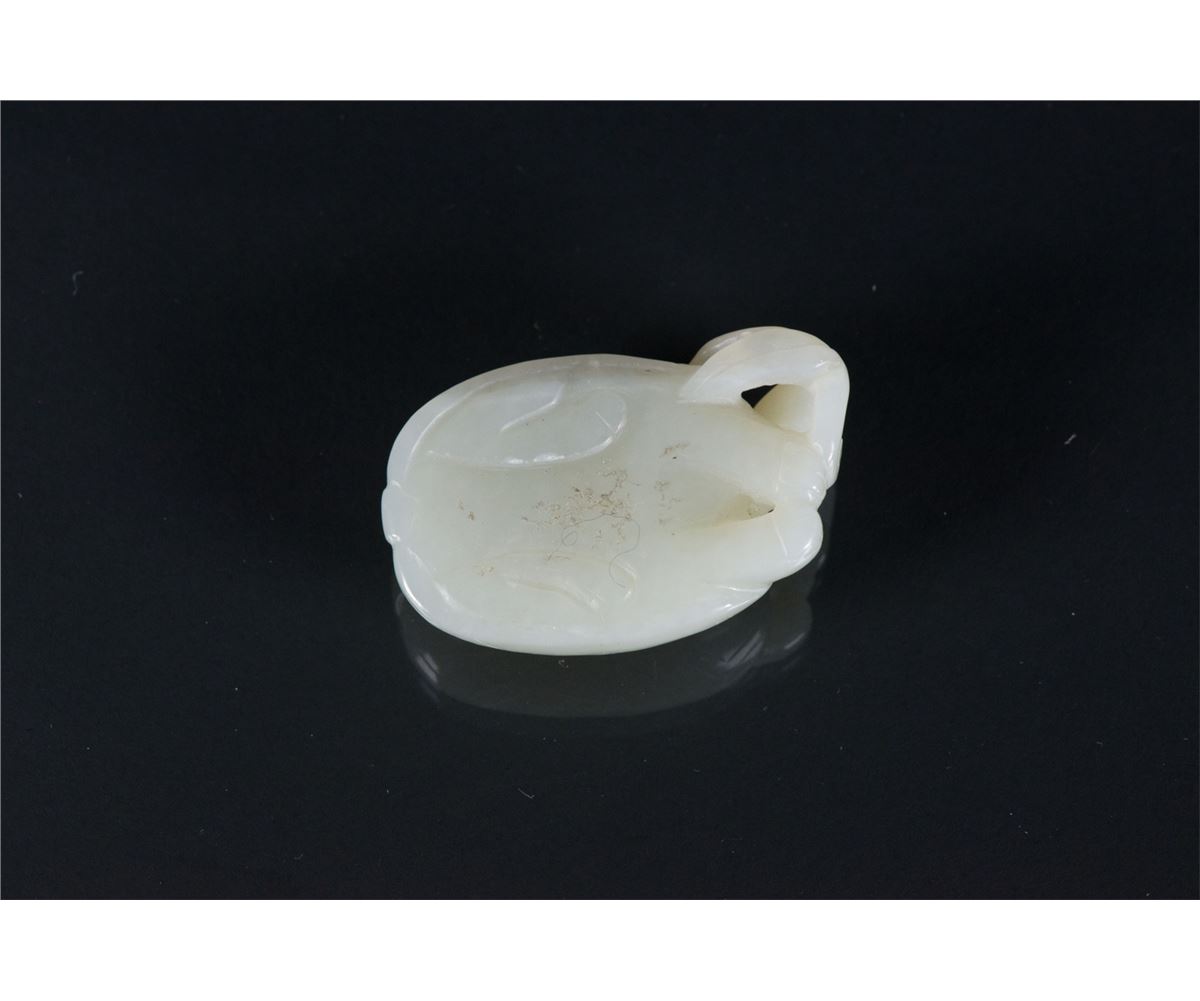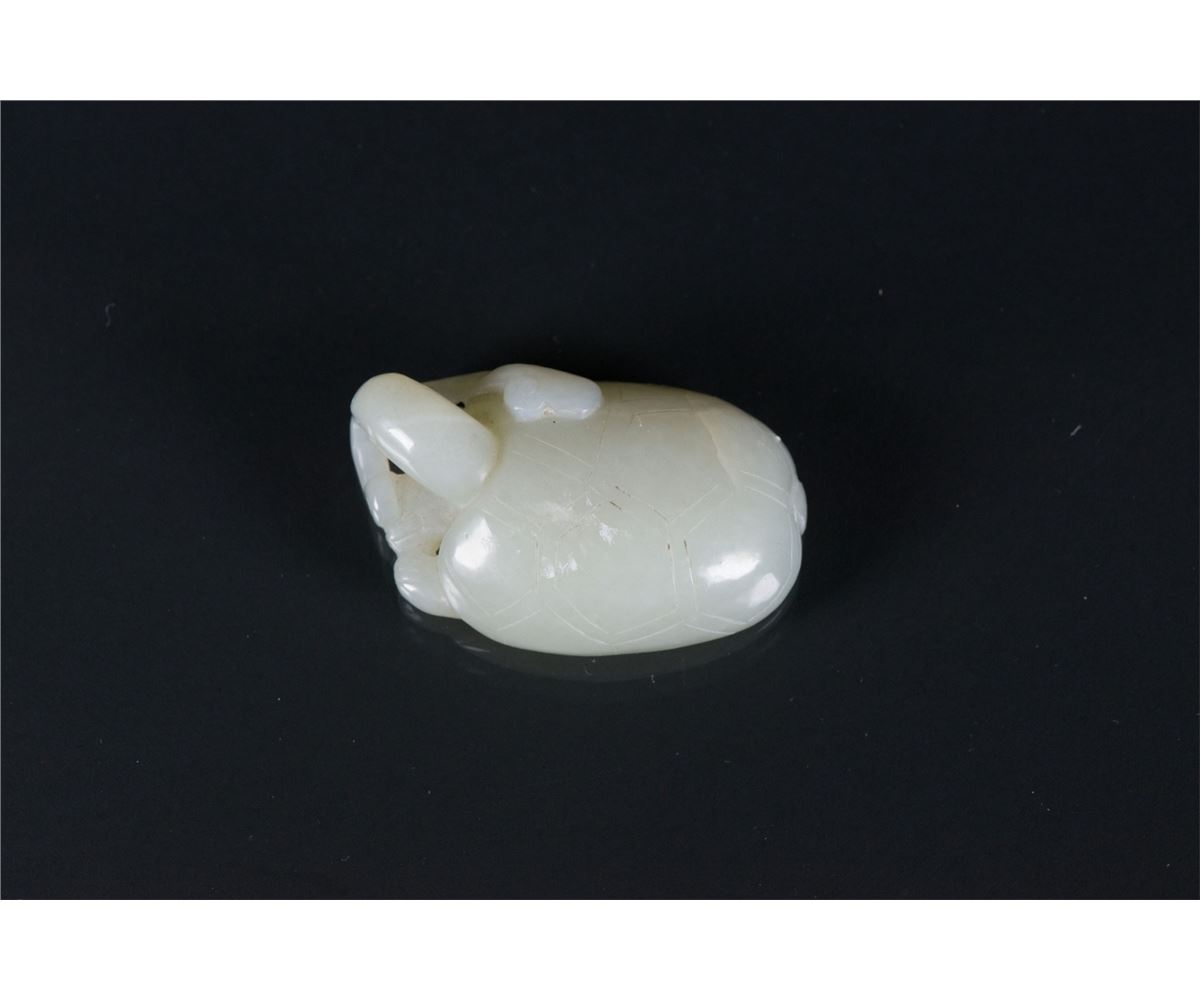 Chinese white jade carved turtle toggle; featuring a turtle biting Lingzhi; of translucent white tone; H: 2.5 cm, W: 6 cm, 43 grams, Density: 2.94