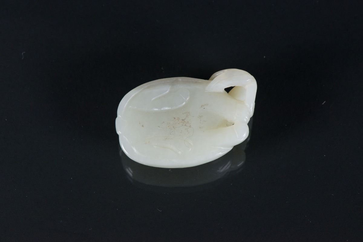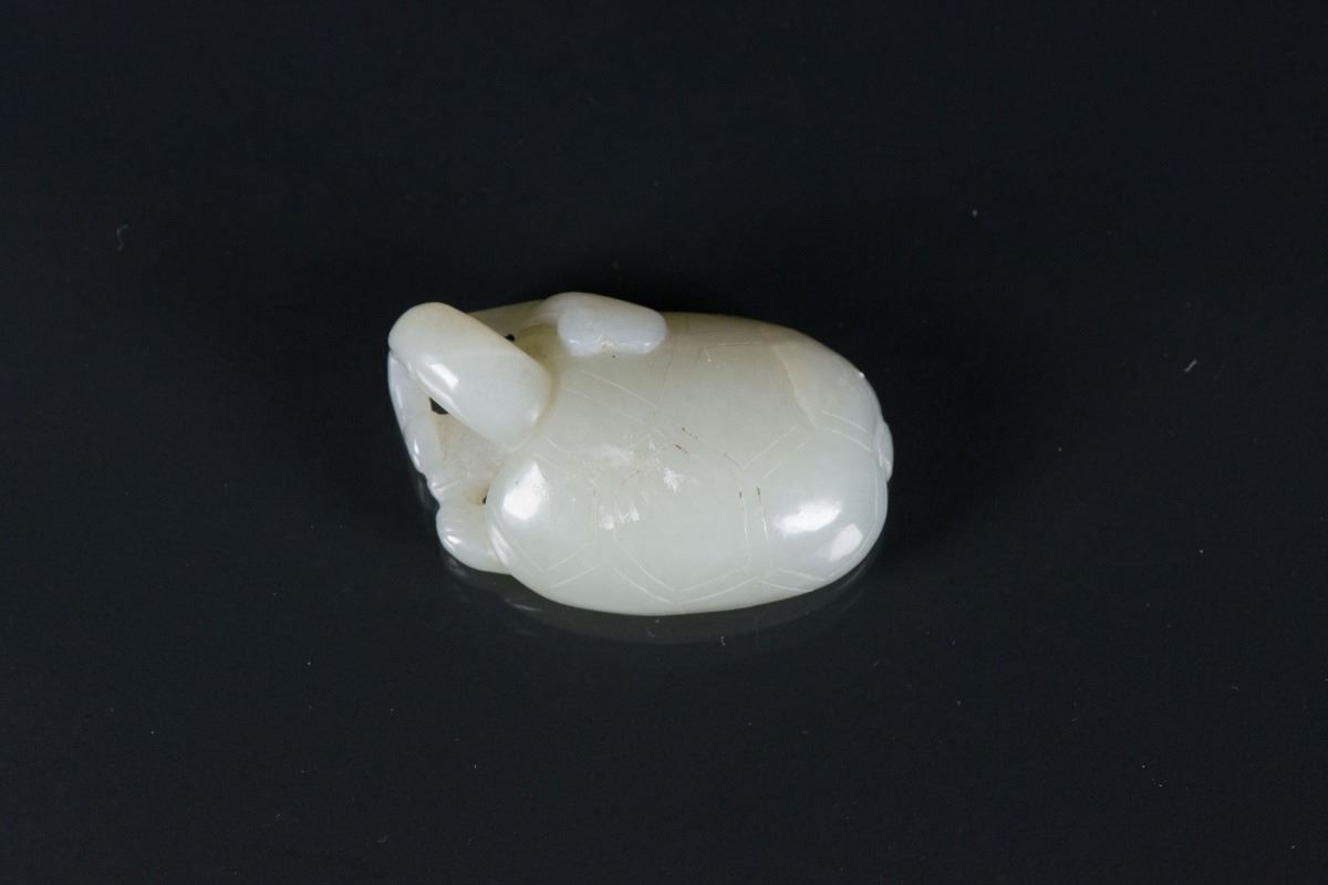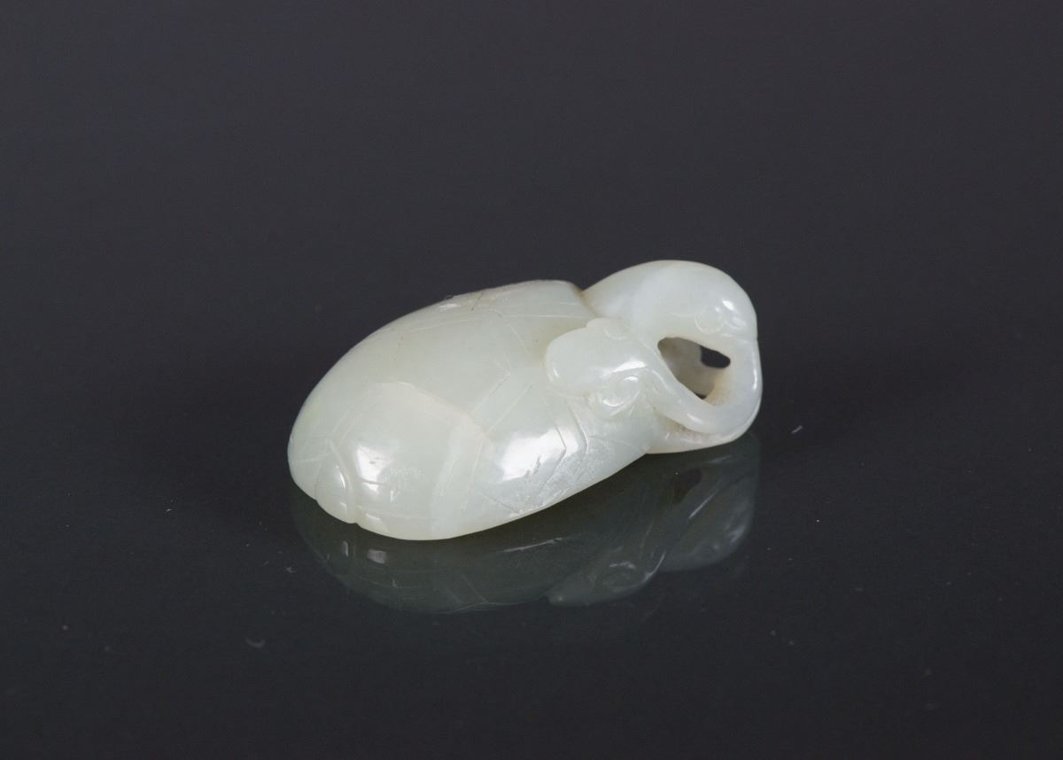 Chinese white jade carved turtle toggle; featuring a turtle biting Lingzhi; of translucent white tone; H: 2.5 cm, W: 6 cm, 43 grams, Density: 2.94