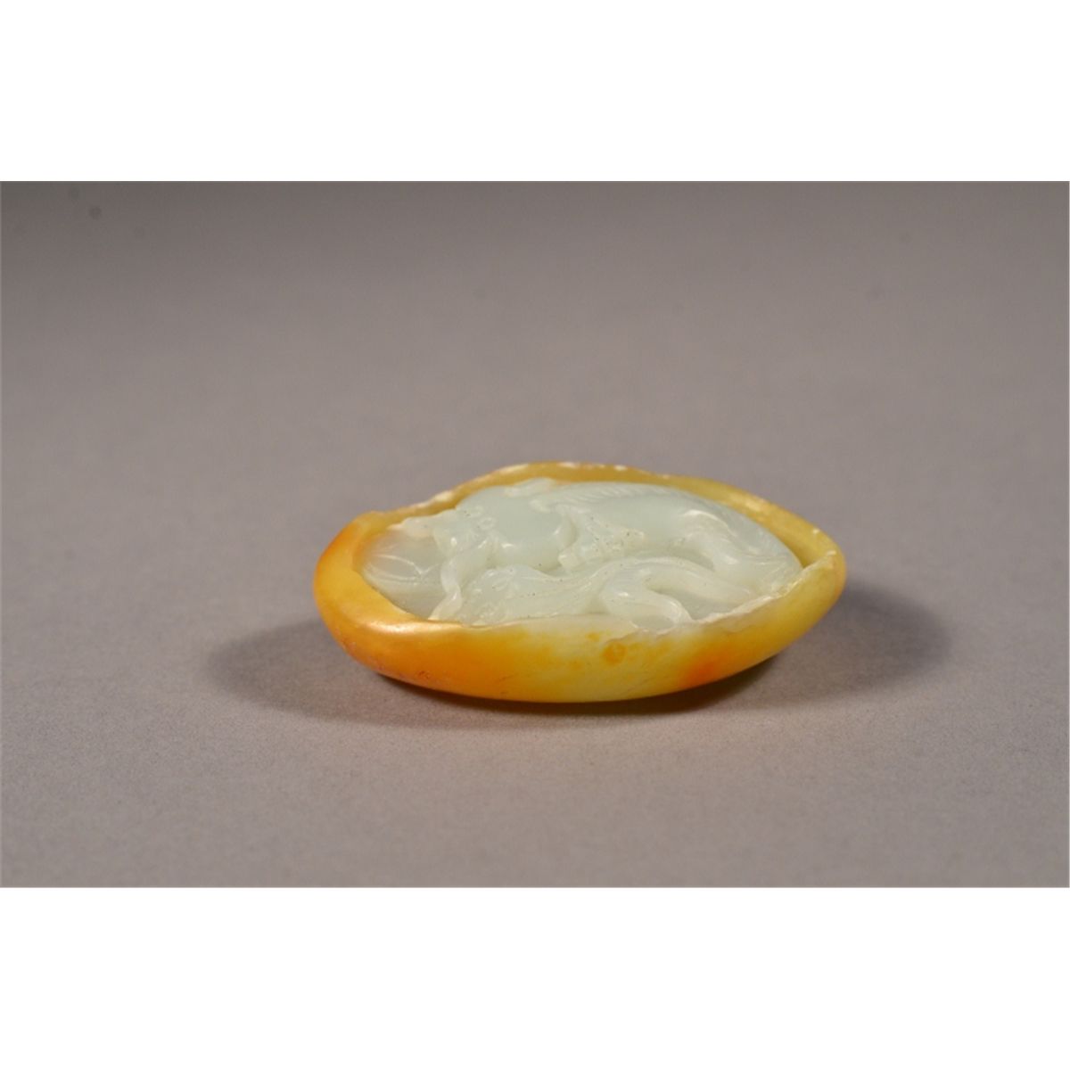 Large Chinese white jade of goldfish in grotto-like carving; with light brown suffusions used to naturally colour the base; L: 6cm, W: 4cm, H: 2cm, 62 grams