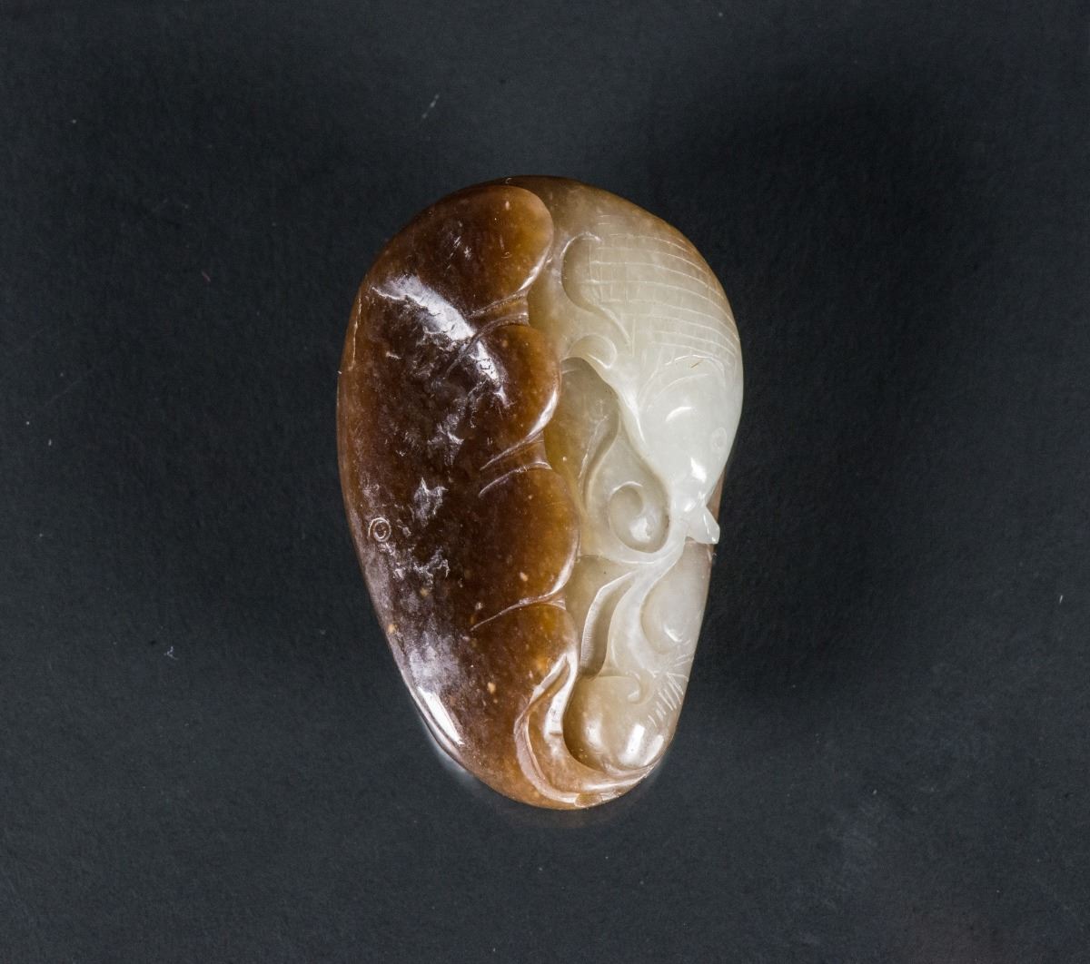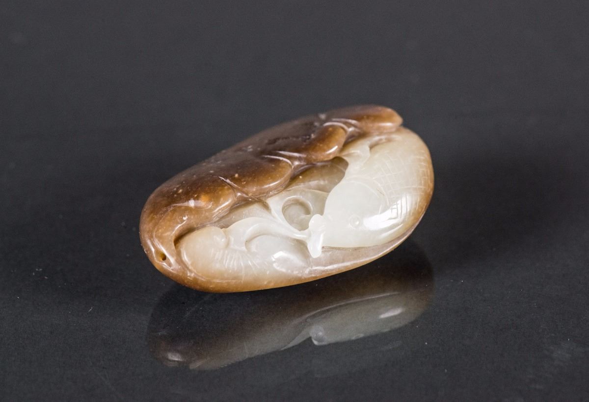 Chinese white jade fish pendant; featuring a fish with lotus leaf; of white and brown tone; pierced for suspension; H: 4 cm, W: 3 cm, 25 grams, Density: 2.88