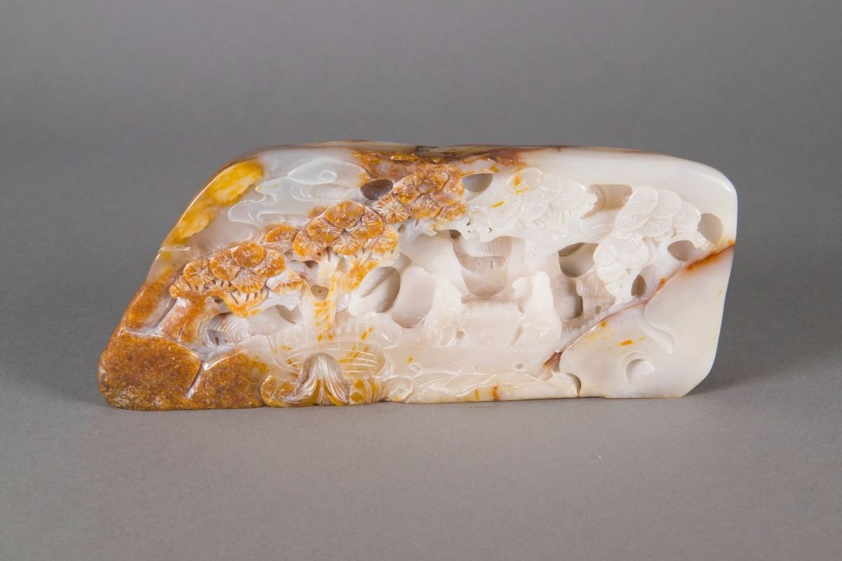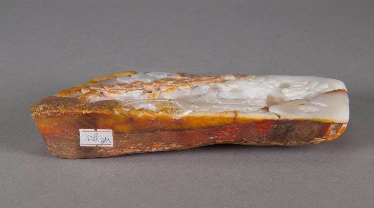 Chinese white jade russet skin carved boulder; featuring pines in the clouds; H: 8 cm, W: 21 cm, 1154 grams