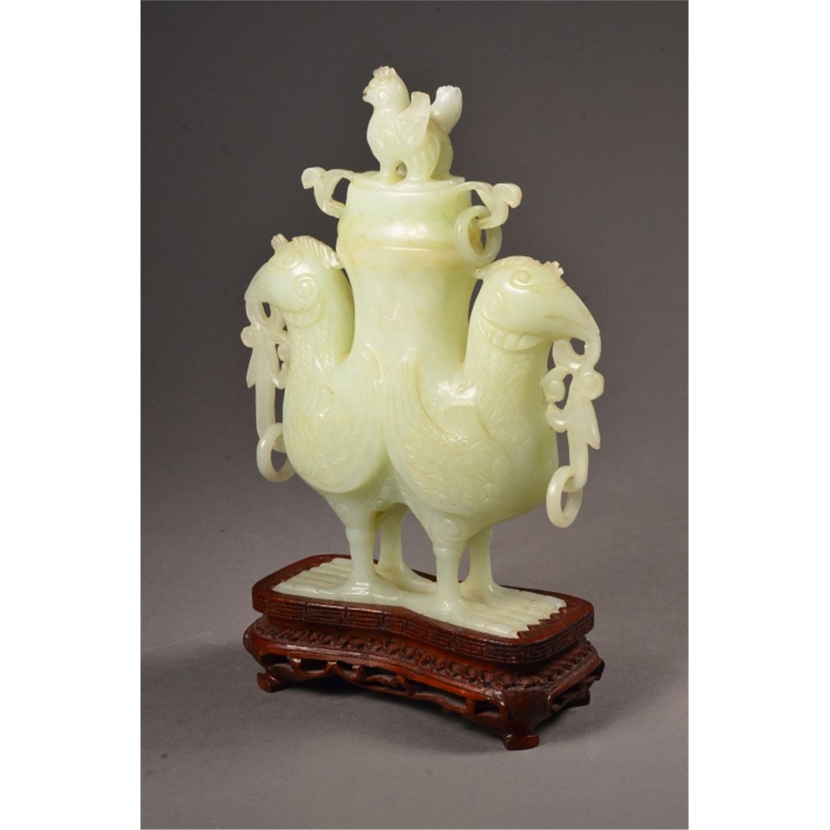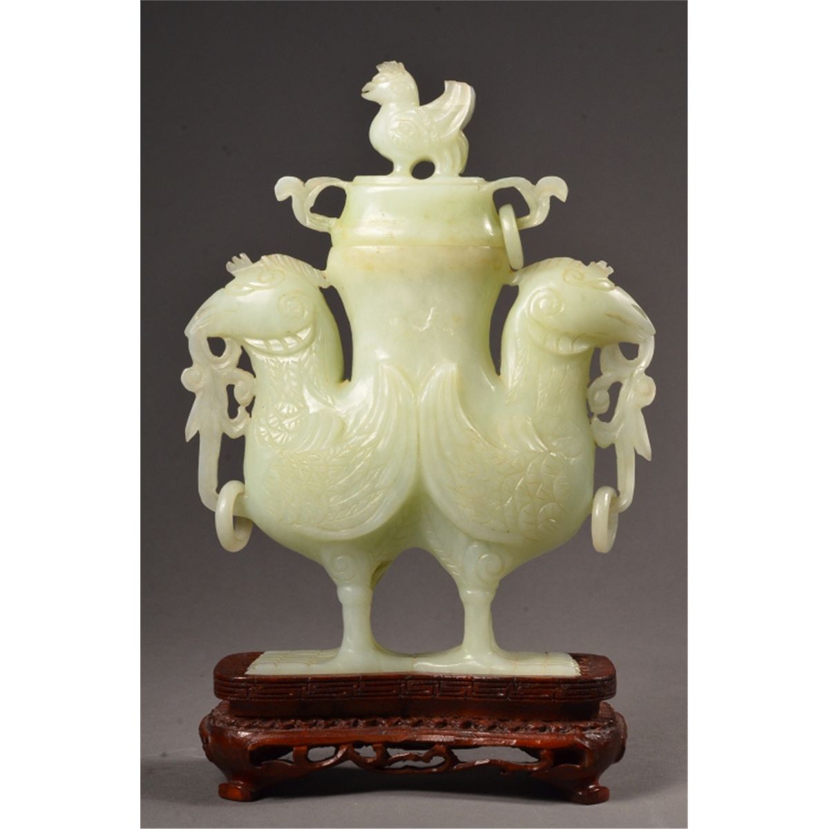 Chinese white jade vessel carved in the form of two opposing birds (slight chip on either side of the wing); 6 1/2" tall