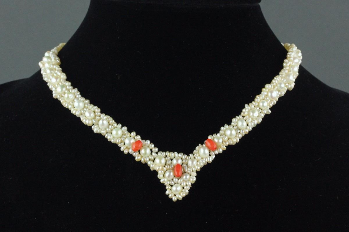 Chinese white pearl necklace with clasp; comprised of numerous pearls and decorated with three small red coral beads; D: 12 cm, 22 grams